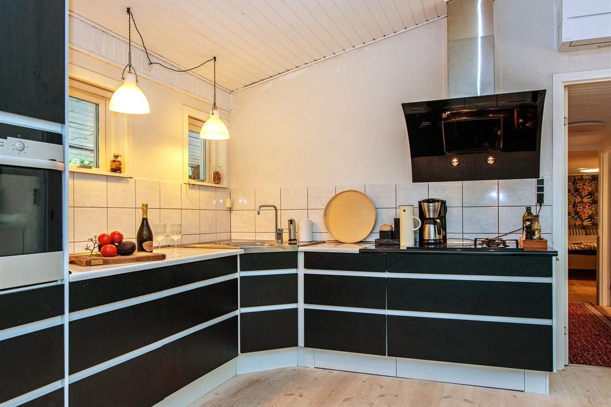 Die Küche ist zum Hauptwohnzimmer hin offen, sodass jeder sich integriert fühlt. Kleineres Wohnzimmer mit Holzofen zum Zurückziehen. Das Ferienhaus hat fünf Schlafzimmer mit Doppelbetten, eines davon zudem mit Etagenbett. Das Haus hat zwei Badezimmer; eines mit WC und Dusche (ohne Whirlpool) und das andere mit WC.