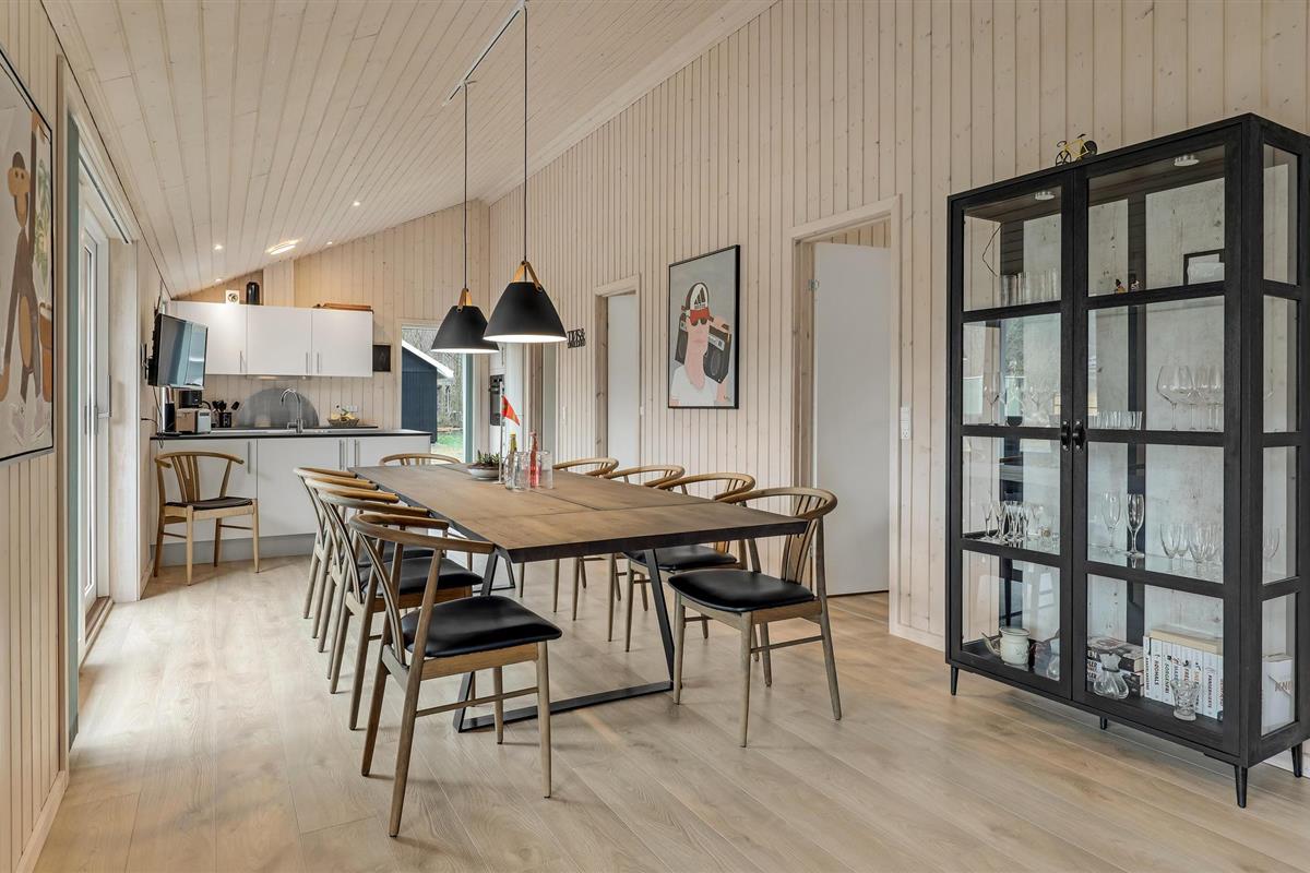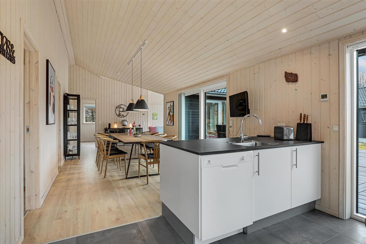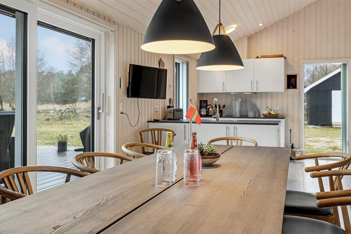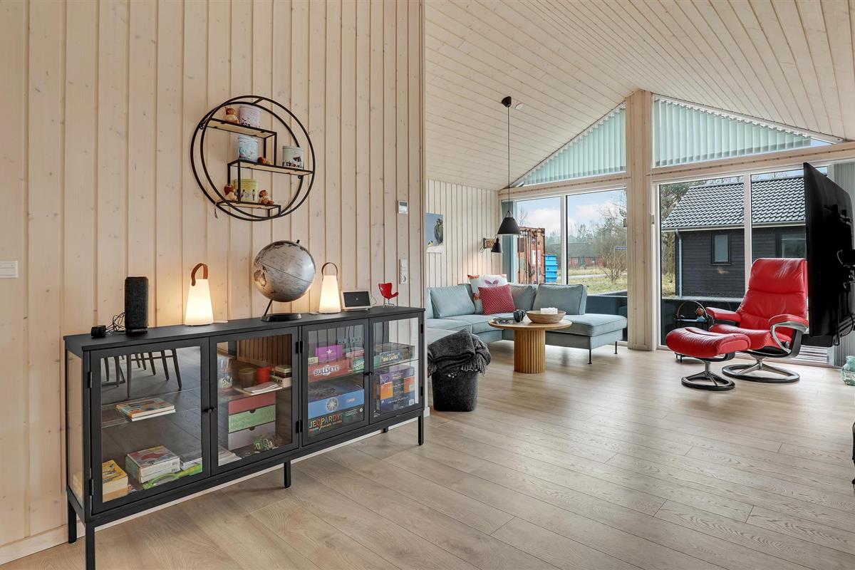 Op een idyllische locatie en op slechts een korte wandeling van het strand wacht dit door bomen omgeven vakantiehuis op u. Het huiselijke en moderne interieur nodigt u uit om met uw geliefden optimaal te ontspannen. Grote panoramische ramen zorgen niet alleen voor een prachtige inval van daglicht, maar ook dat u overal in het huis optimaal van het uitzicht kunt genieten. Geniet samen van de maaltijden aan de lange eettafel met uitzicht op het buitenleven. Na een mooie dag aan zee of het verkennen van het eiland, kunt u het uzelf comfortabel maken op de ruime bank in het woongedeelte en samen spelletjes spelen of een film kijken.