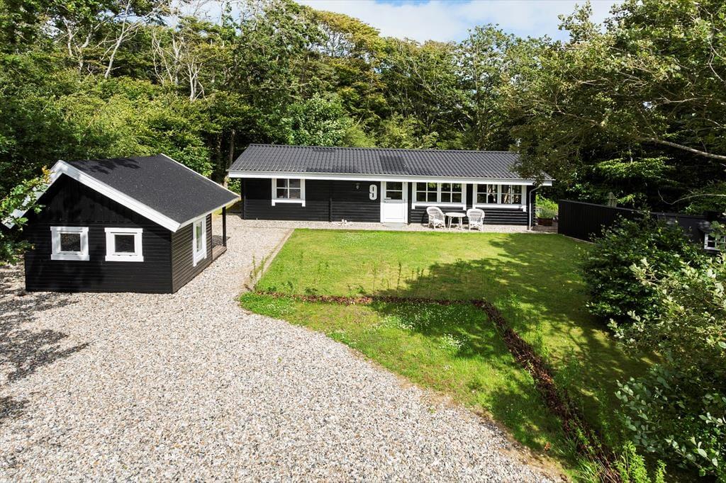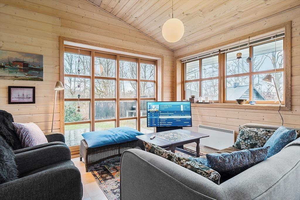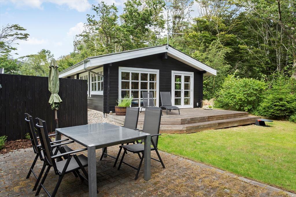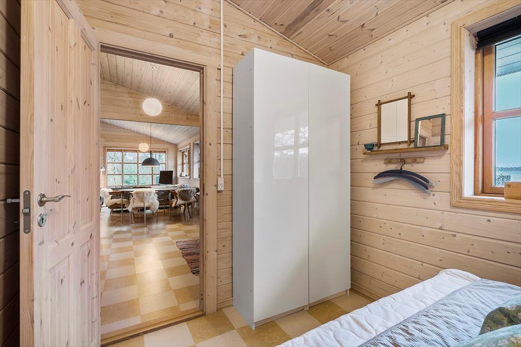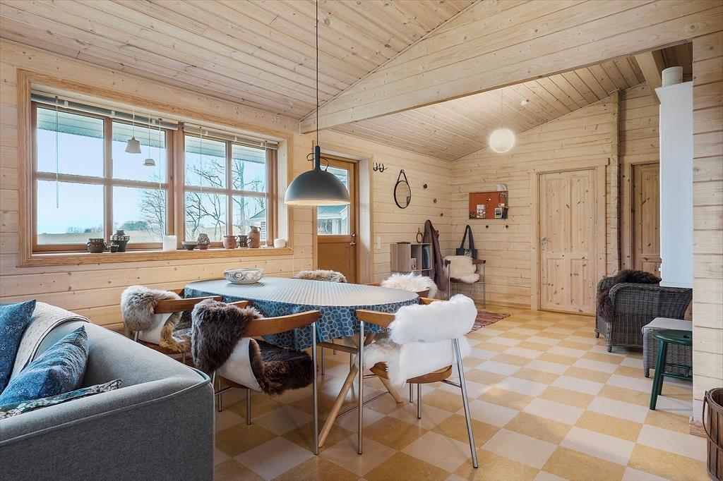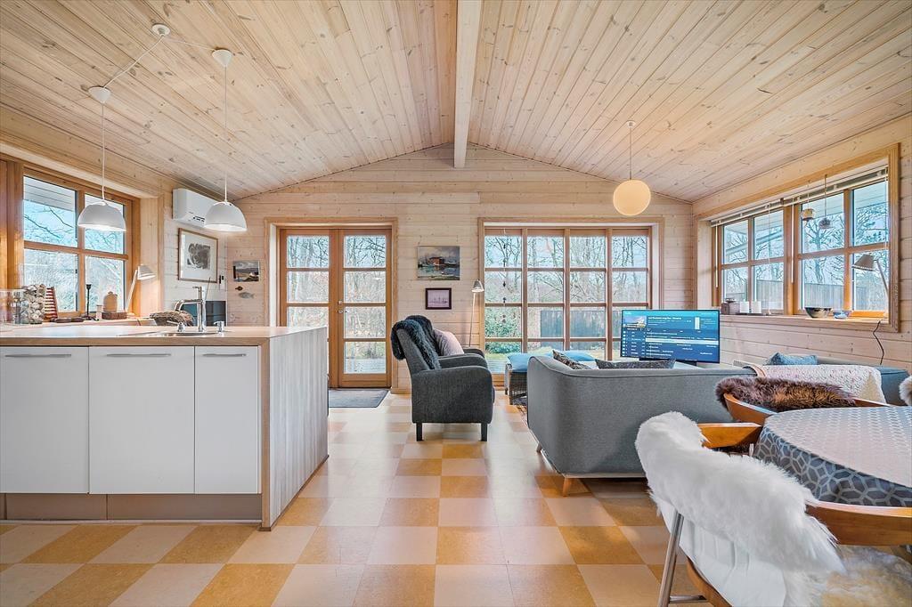 Obwohl es sich bei diesem Urlaubsdomizil um ein Ferienhaus aus dem Jahr 2014 und somit um ein vergleichsweise neues Objekt handelt, erwartet Sie hier ein Maximum an guter, echt dänischer Ferienhaustradition. Das Haus begrüßt Sie in bester klassischer Manier mit hohen Decken, hellen Holzwänden und reizvollen Sprossenfenstern. Die offene Küche und der karierte Bodenbelag verleihen den Räumlichkeiten einen modernen Touch. Die Küche ist in den Wohnraum integriert, in dem eine Wärmepumpe, ein Flachbild-TV und eine gemütliche Möblierung zu erholsamen und behaglichen Stunden einladen. Die beiden Schlafräume begrüßen Sie mit jeweils einem Doppelbett. Beim Badezimmer handelt es sich um einen großen, stilvollen Raum mit einer verglasten Duschnische. Praktischerweise stehen Ihnen im Bad auch eine Waschmaschine und ein Wäschetrockner zur Verfügung, sodass Sie sich unnötig viel Reisegepäck ersparen können. Ein Nebengebäude ist ebenfalls vorhanden. Dieses beinhaltet zwei Einzelbetten. Somit verbringen bis zu sechs Personen hier richtig schöne und erholsame Urlaubstage.