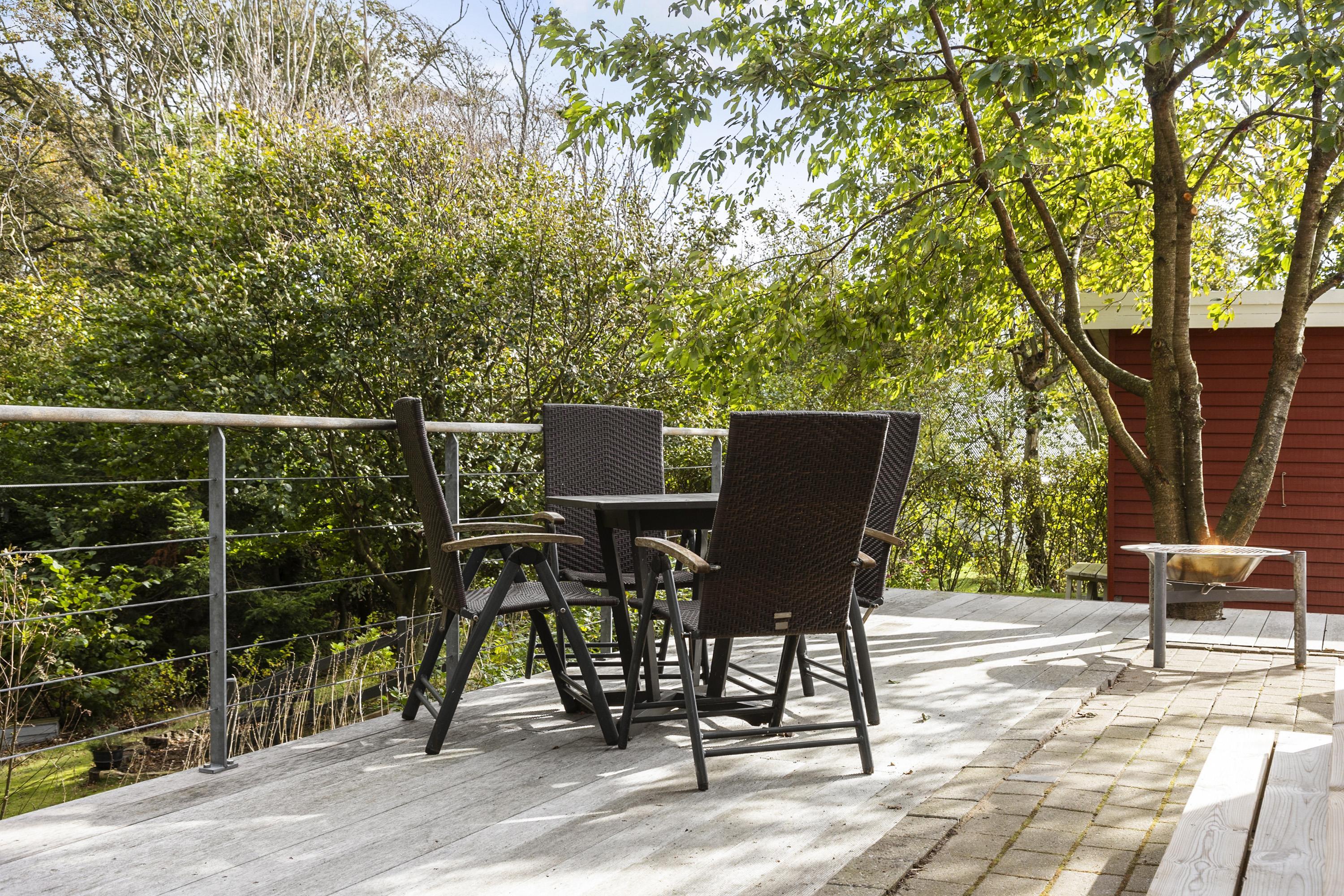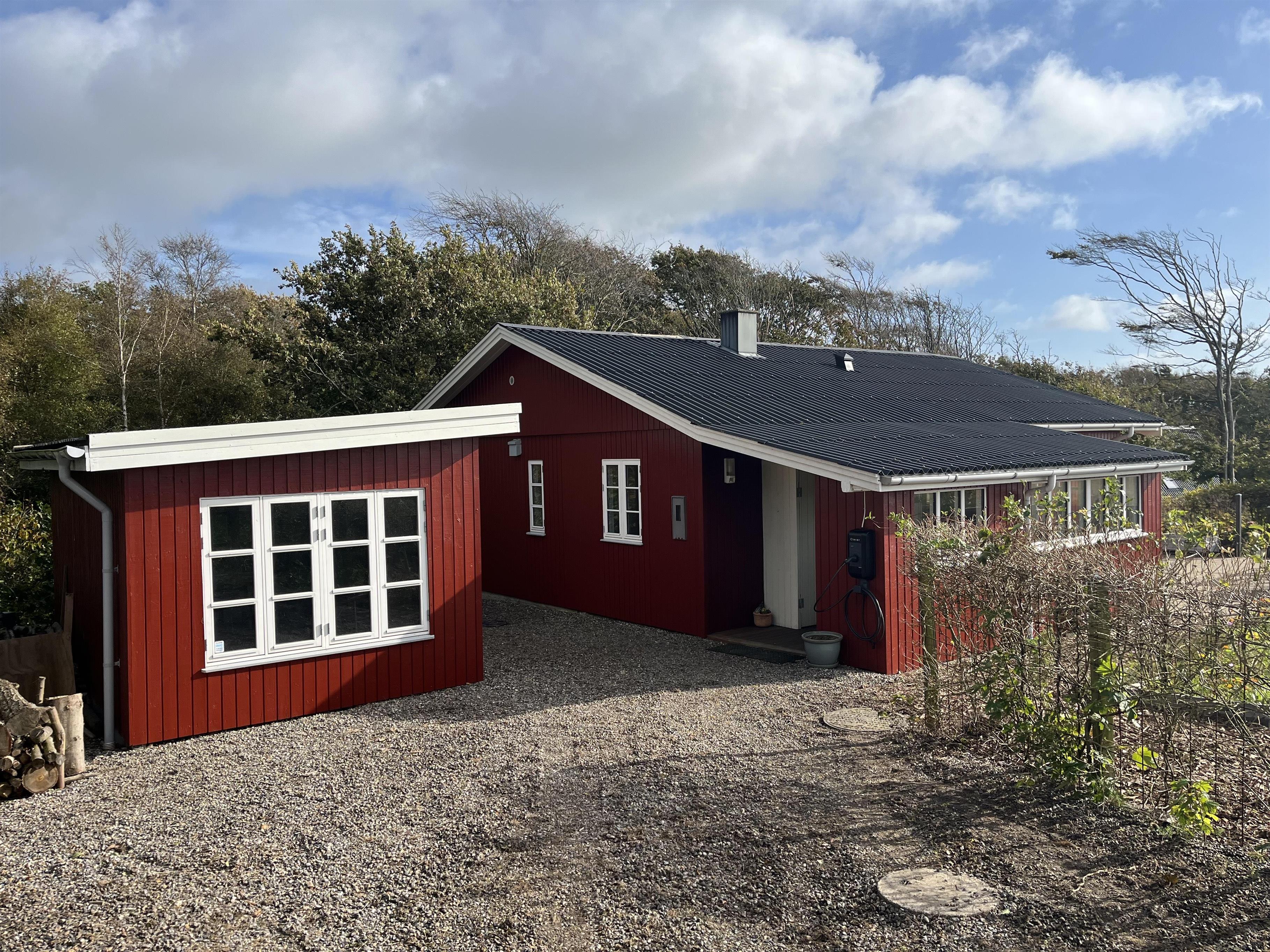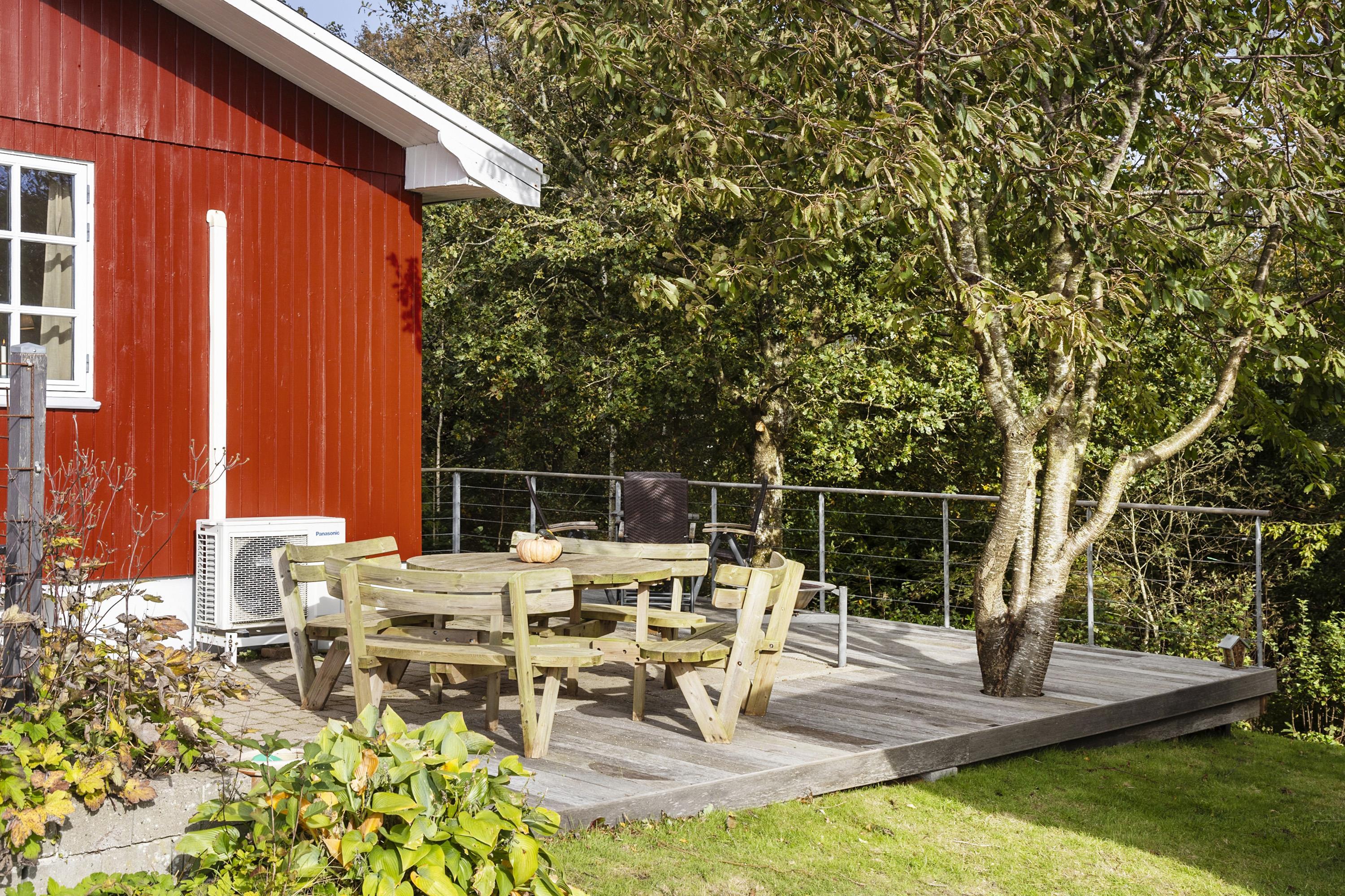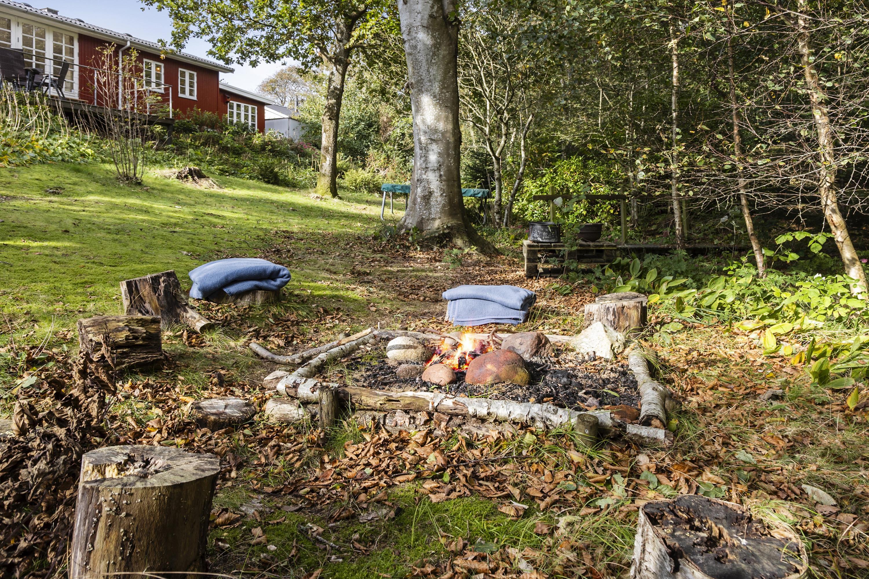 The house is surrounded by terraces with morning sun, midday sun and evening sun. There is an outdoor kitchen and barbecue. At the bonfire place in the small forest garden you can make, for example, marshmallows, popcorn or snow bread. For the active, there is a trampoline in the garden, and if you go down to the beach, there is a sensory swing and a football field.