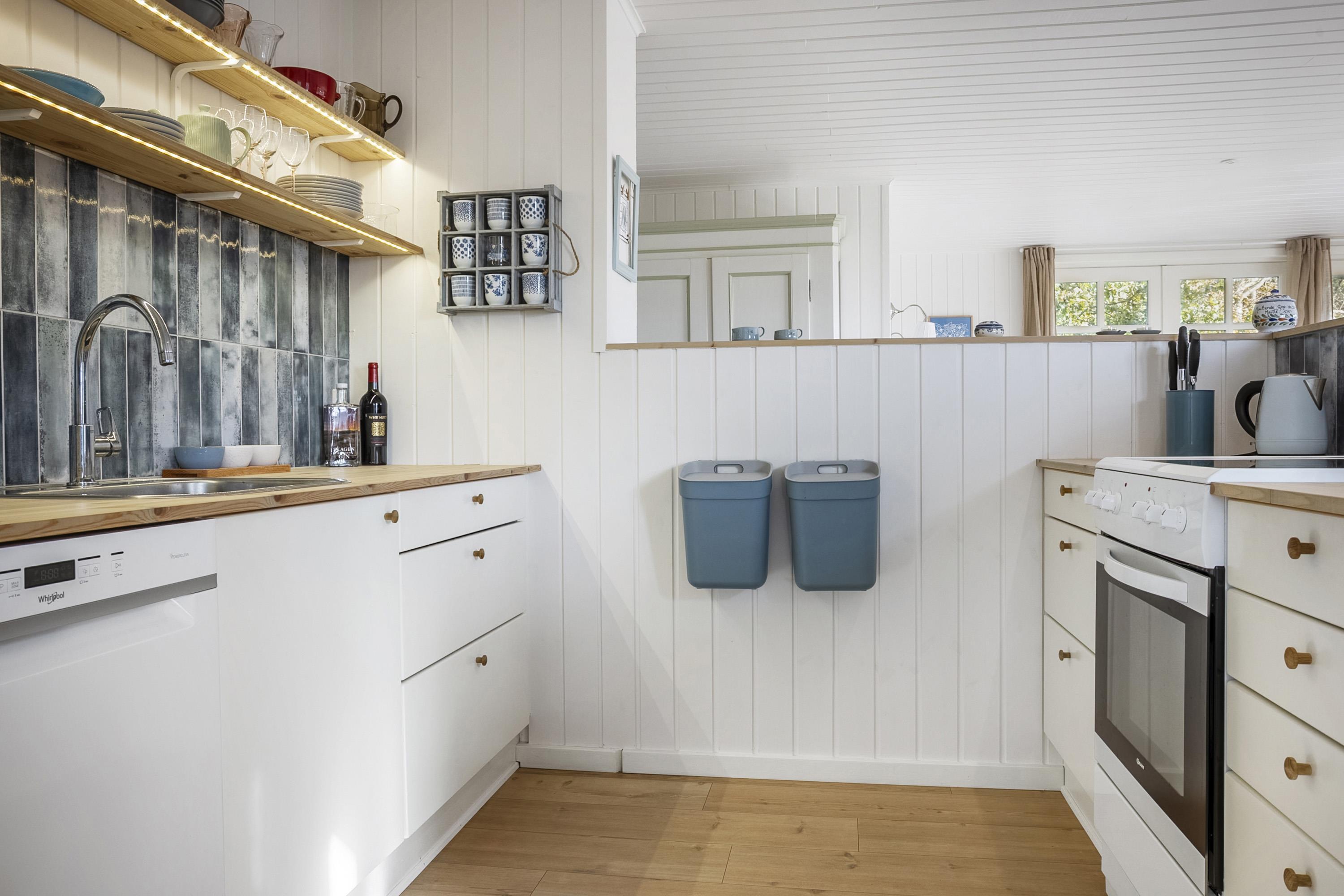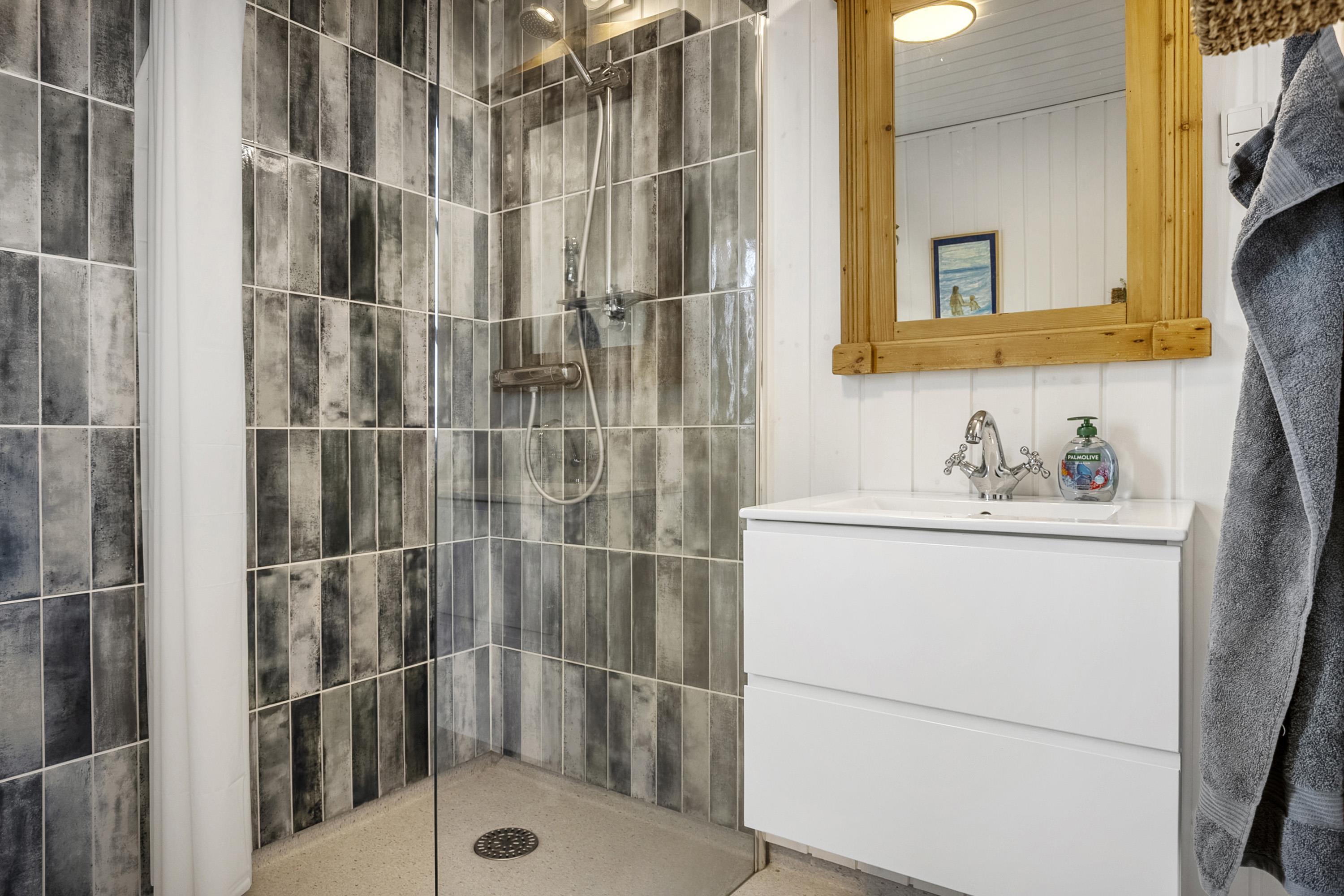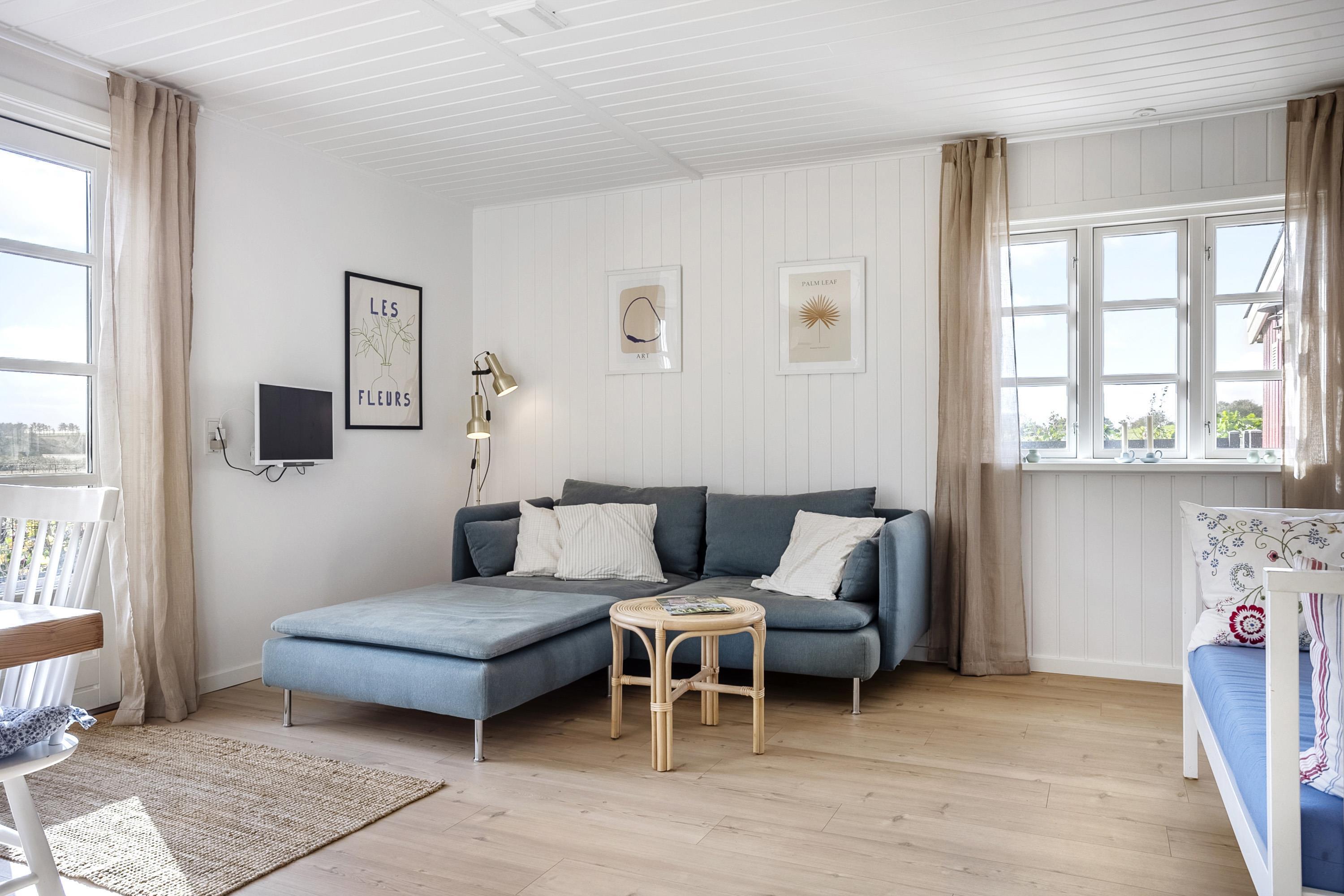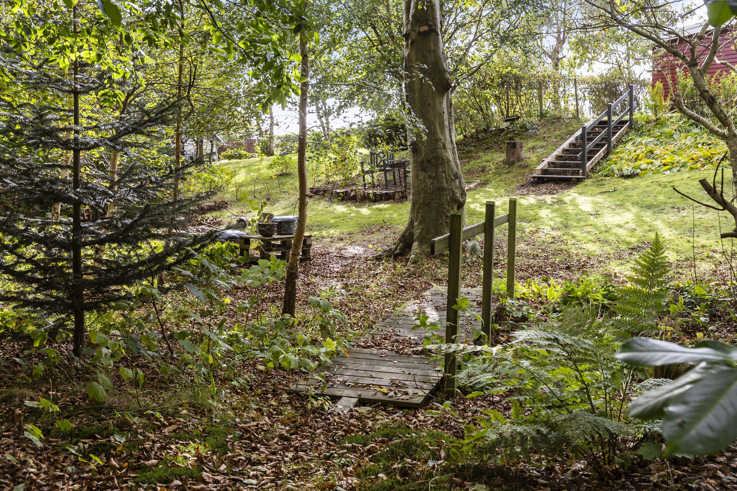 The house is surrounded by terraces with morning sun, midday sun and evening sun. There is an outdoor kitchen and barbecue. At the bonfire place in the small forest garden you can make, for example, marshmallows, popcorn or snow bread. For the active, there is a trampoline in the garden, and if you go down to the beach, there is a sensory swing and a football field.