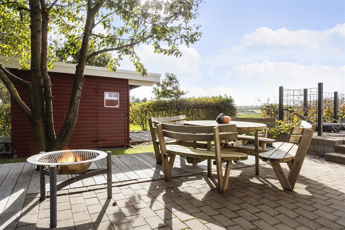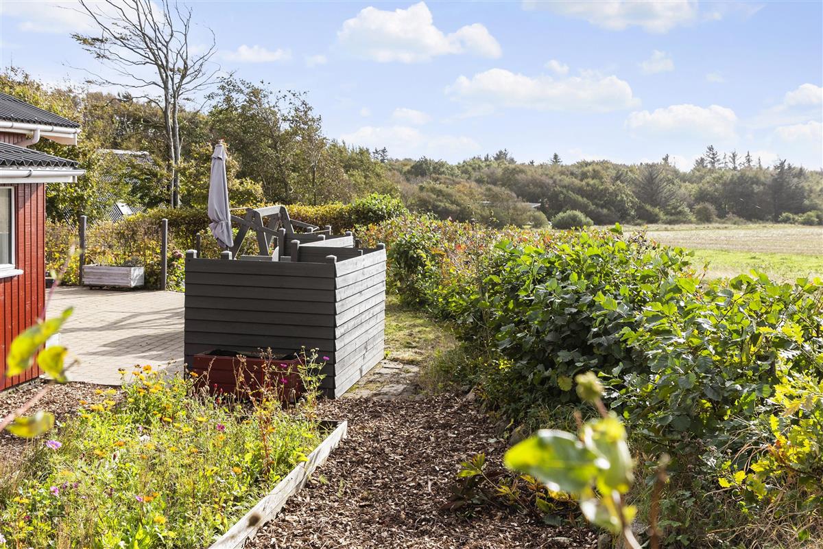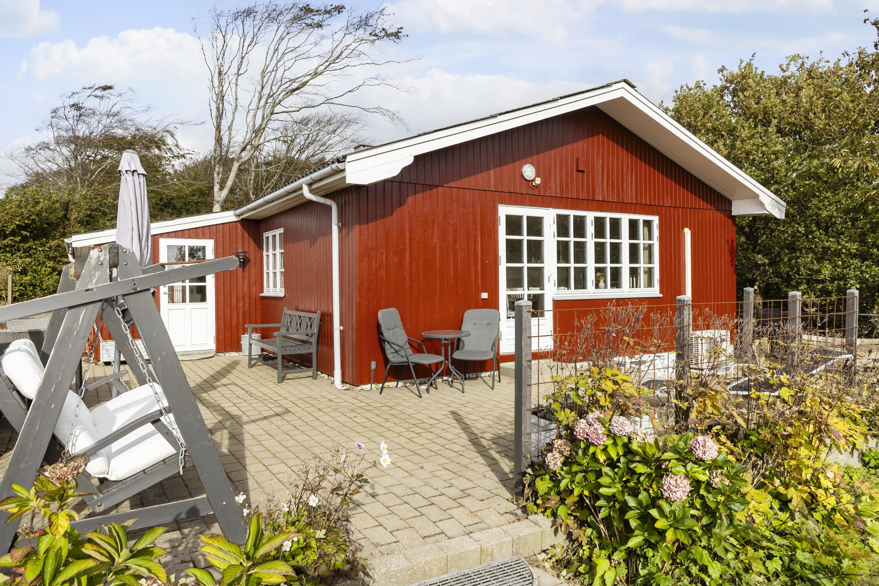 This beautiful holiday home at Søndbjerg Strand on Thyholm is located on a large plot of 1320 square meters, with terraces around the house and a cozy little secluded forest garden with a large playground. From the house, through the fine lattice windows, there is a view of fields, where hares and deer are often seen. The house is located on a quiet road without traffic noise.