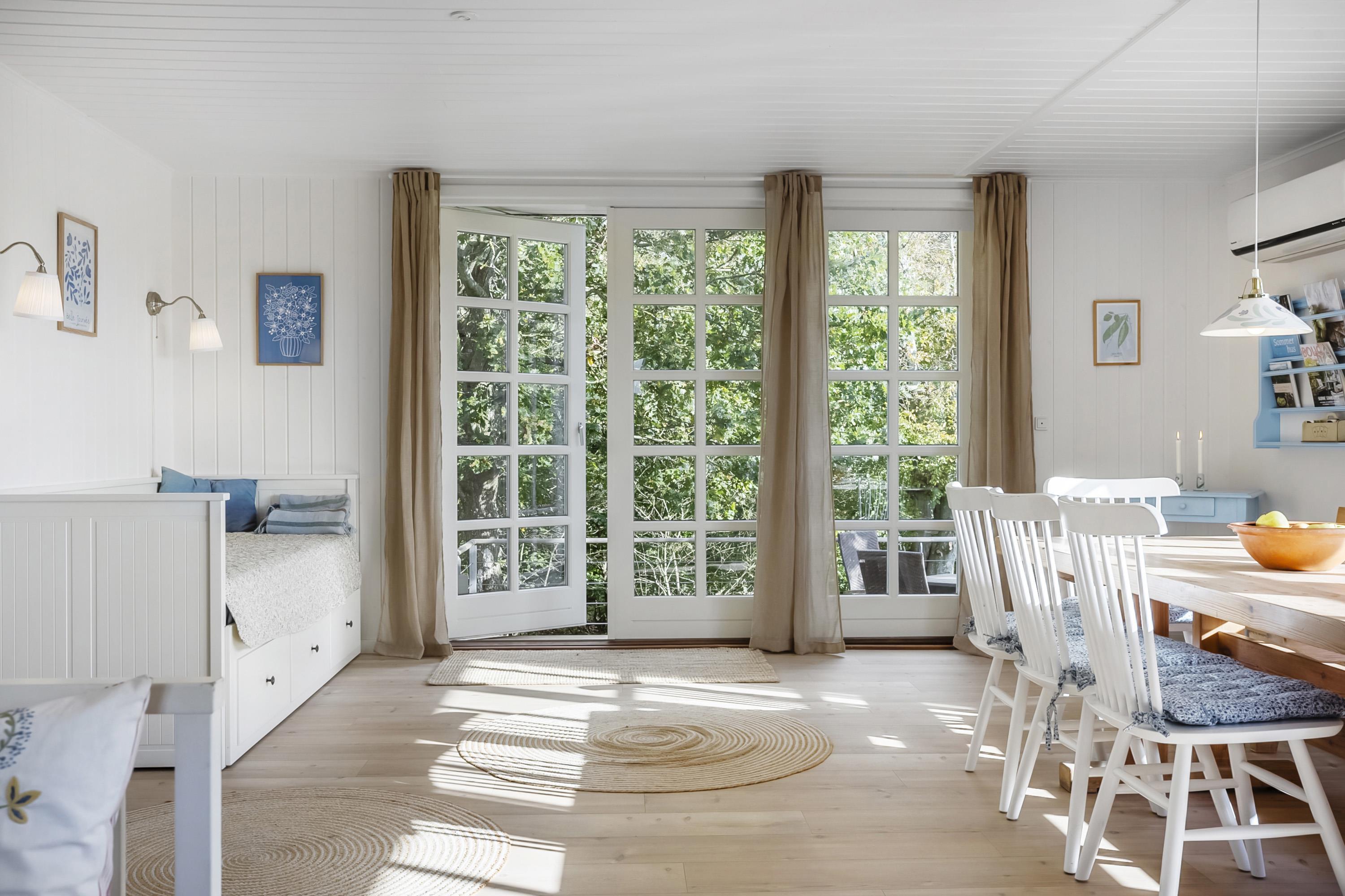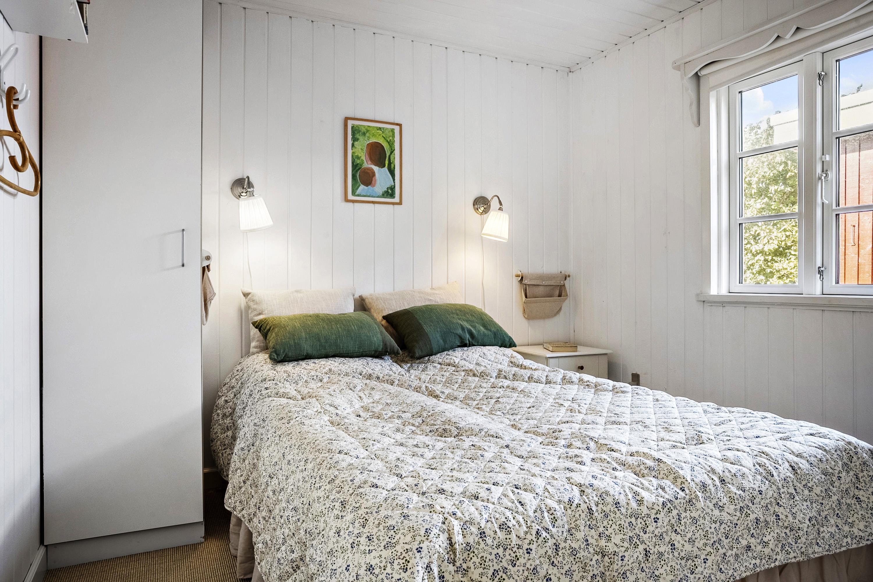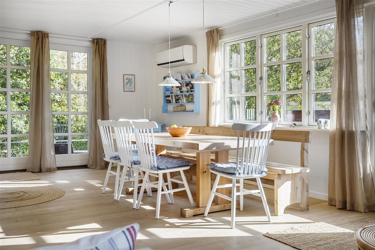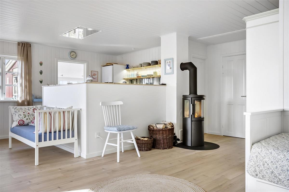 The house has undergone a renovation of, among other things, the kitchen and bathroom in 2024, and there is a bright and cozy interior with several exits to the garden. There is a large entrance hall with space for, for example, a stroller or dog basket, and here you can wash and dry clothes. The kitchen is well equipped with all the necessary facilities. The bathroom is spacious with good ventilation options. In the living room there is both an air-to-air heat pump, that can function as air conditioning on hot days, and a newer wood-burning stove that is easy to operate and provides a cozy atmosphere on cool days/evenings. There are red alarms in the house.