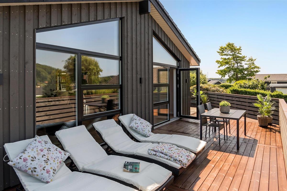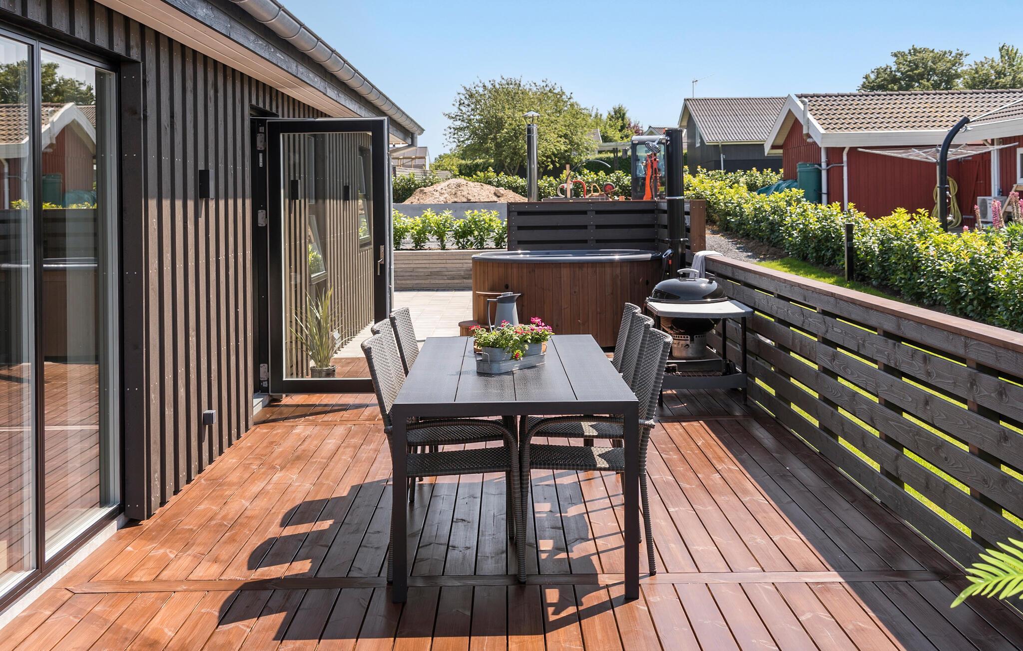 Neem een rustgevend bad in het Finse houten bad of geniet van de zon op de comfortabele ligstoelen. Dek de tafel op het houten terras en bereid het avondeten op de barbecue. Het terras is omheind en biedt zowel privacy als bescherming, ideaal voor gezinnen met kinderen.