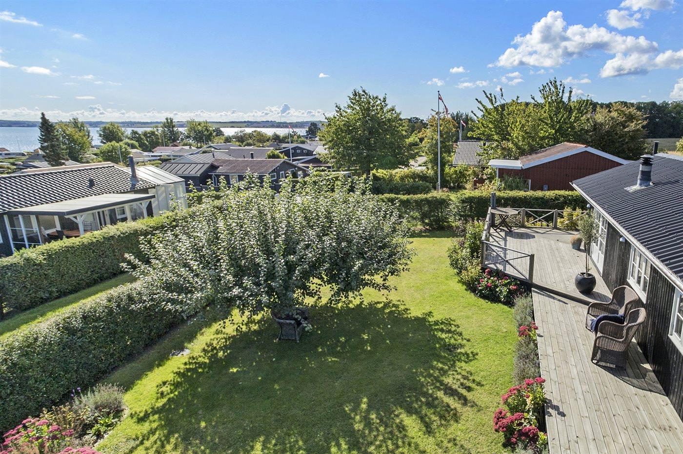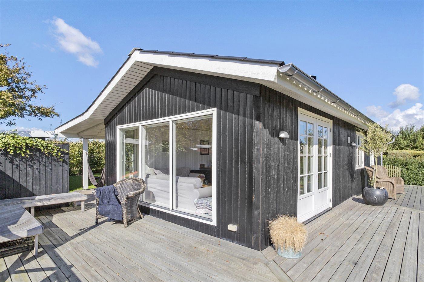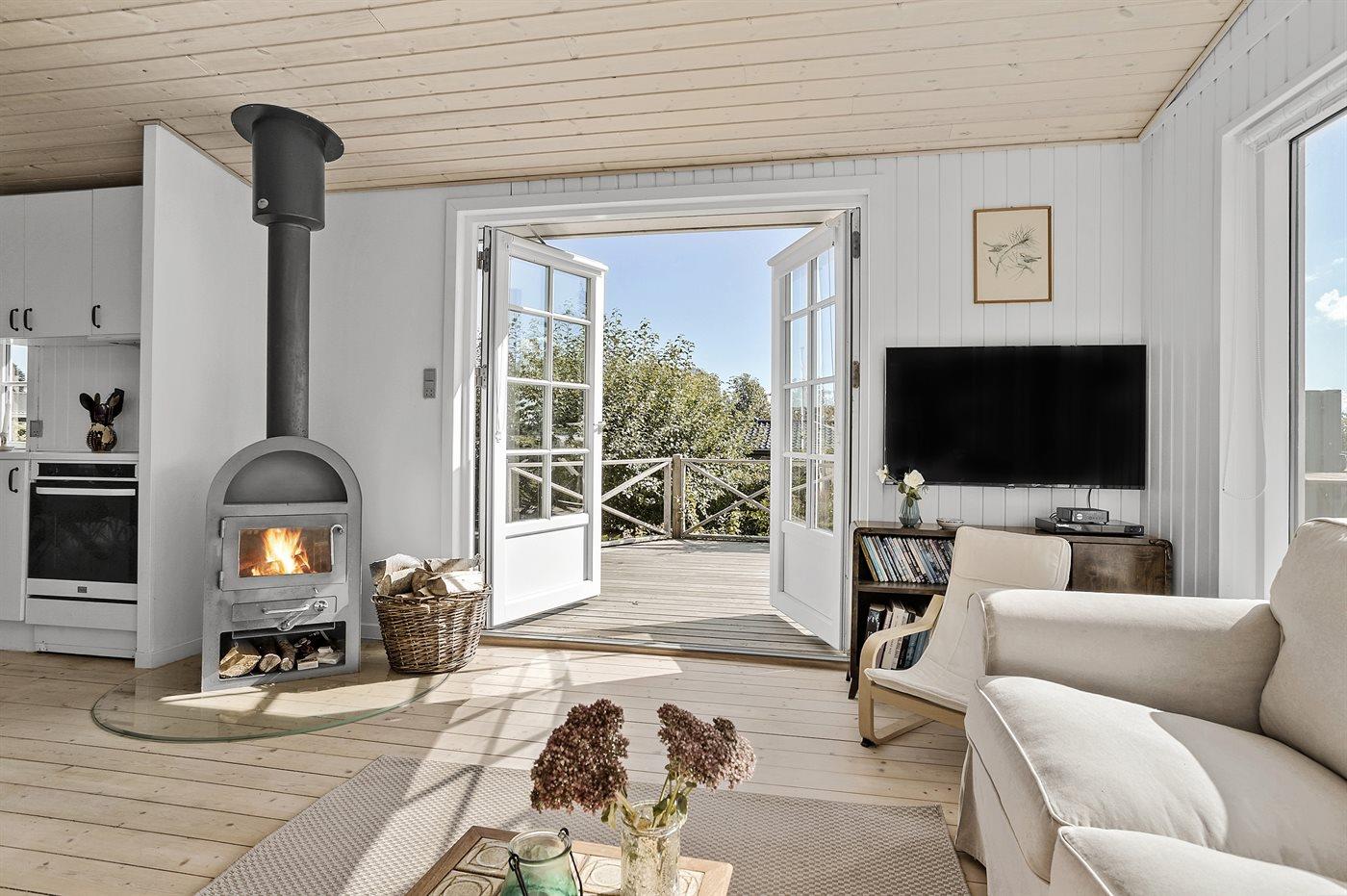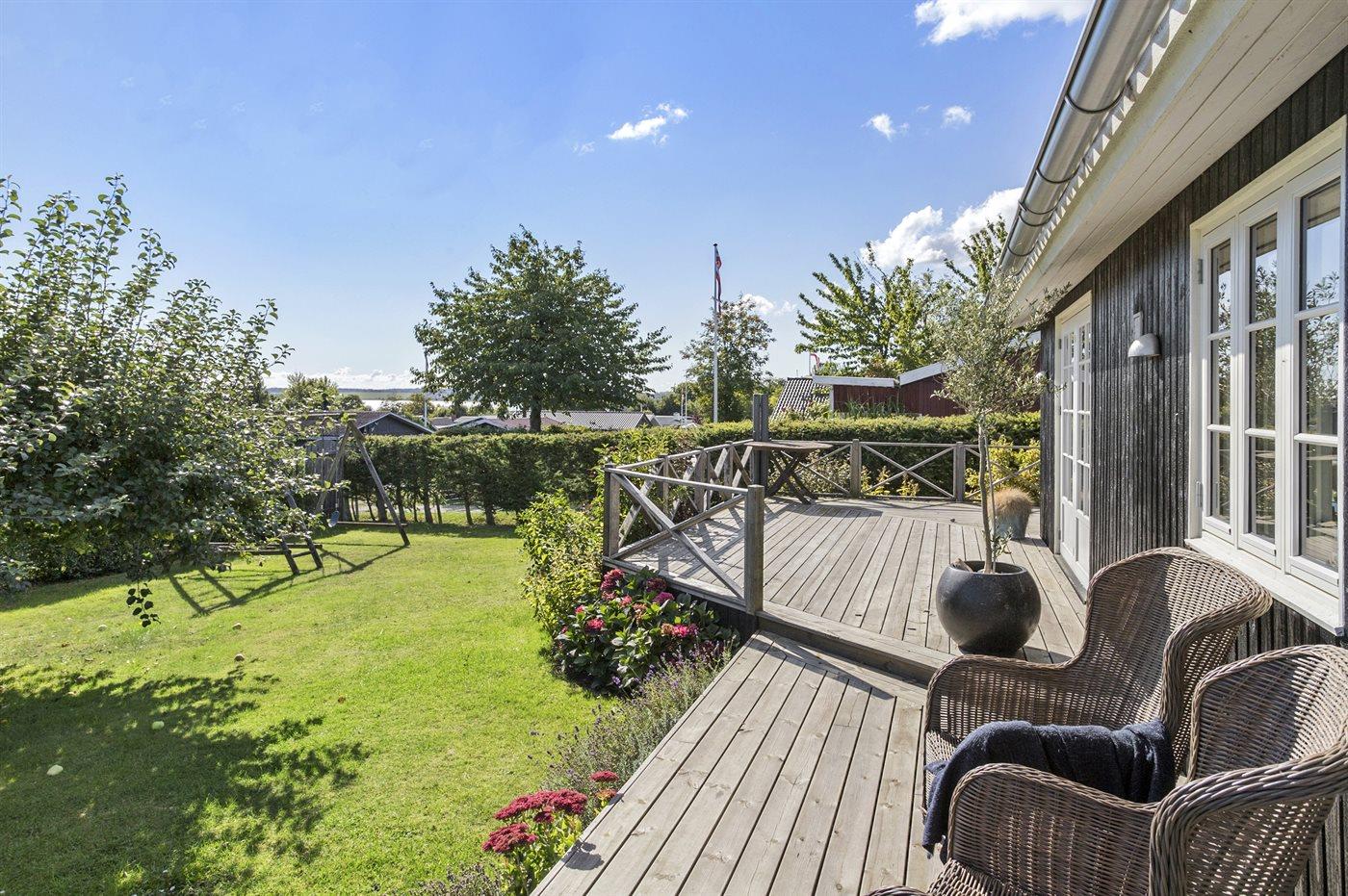 Comfortabel vakantiehuis in Juelsminde met zeezicht, houtkachel en groot terras, ideaal voor een ontspannen verblijf.