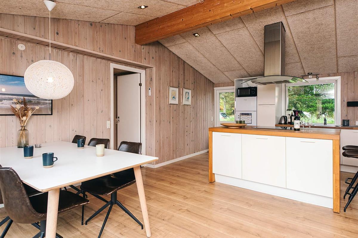 Geräumiges und angenehmes Ferienhaus nahe der alten Stadt Sønderho gelegen. Küche und Bad sind von 2011. Die Küche ist gut ausgestattet und offen mit dem Wohnraum verbunden. Die installierte Wärmepumpe sowie der Holzofen tragen zu einem niedrigeren Stromverbrauch bei. Der Holzofen verbreitet abends gemütliche Wärme, so dass Sie es sich in den komfortablen Möbeln beisammen bequem machen können. Auf der großen Terrasse können Sie je nach Bedarf sonnige und schattige Stellen finden. Die Natur in der Umgebung bietet sich für Wandertouren und zum Spielen an. Es können viele Tiere wie z.B. Kaninchen, Rehe oder Fasane beobachtet werden, manchmal auch ganz dicht am Haus. Alle drei Schlafzimmer sind an der einen Seite des Hauses platziert und dieser Bereich kann mit einer Tür zum Wohnraum geschlossen werden. Das Doppelbett misst 1,40 x 2,00 m.
