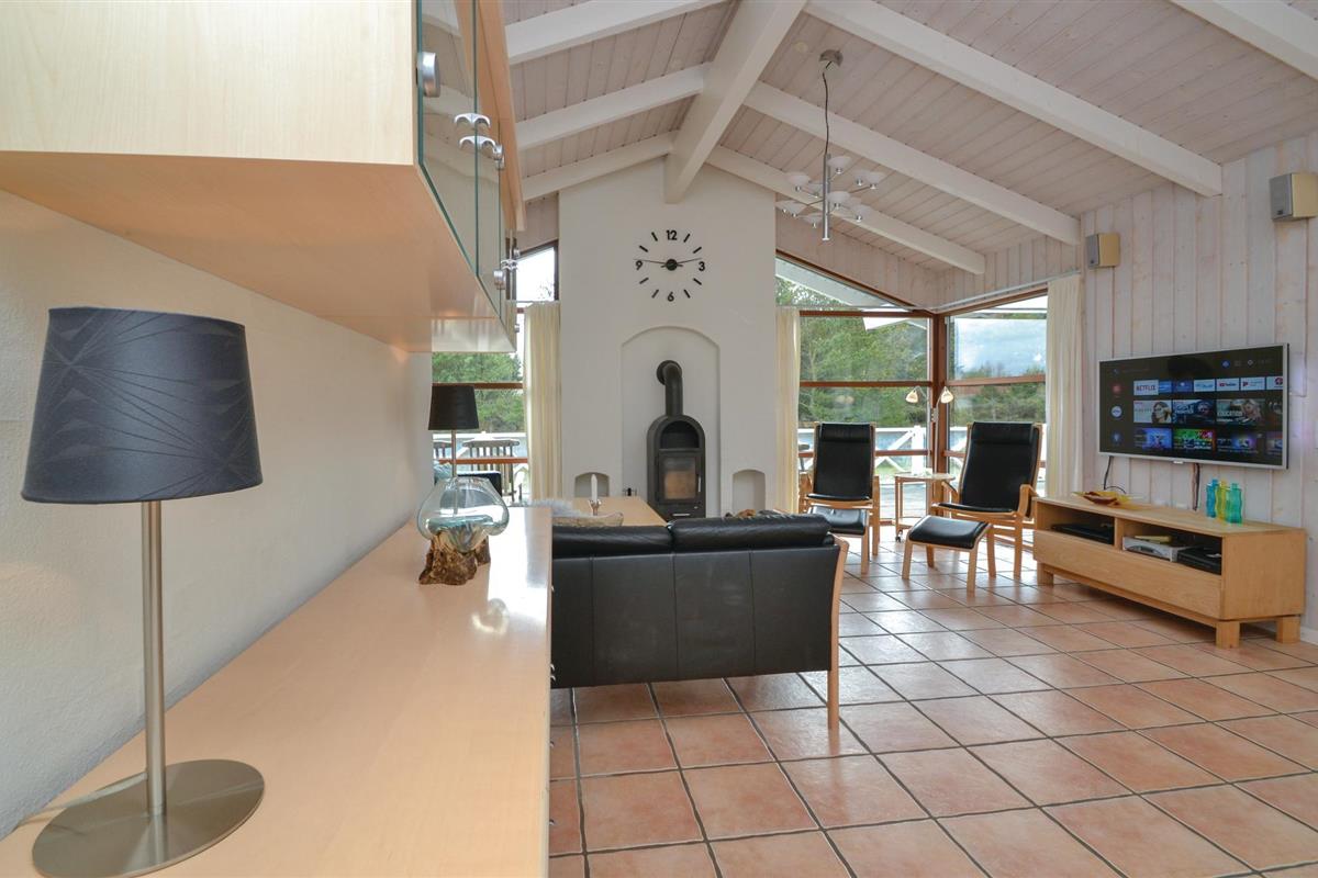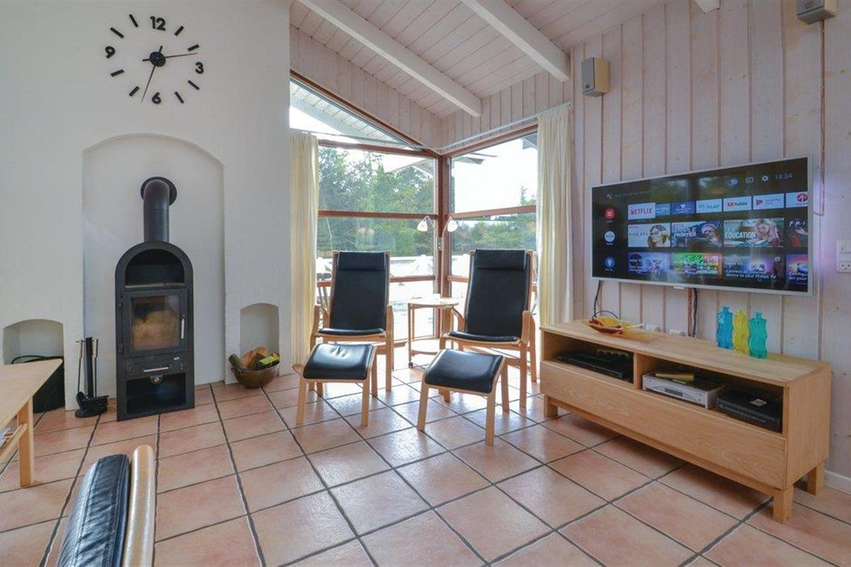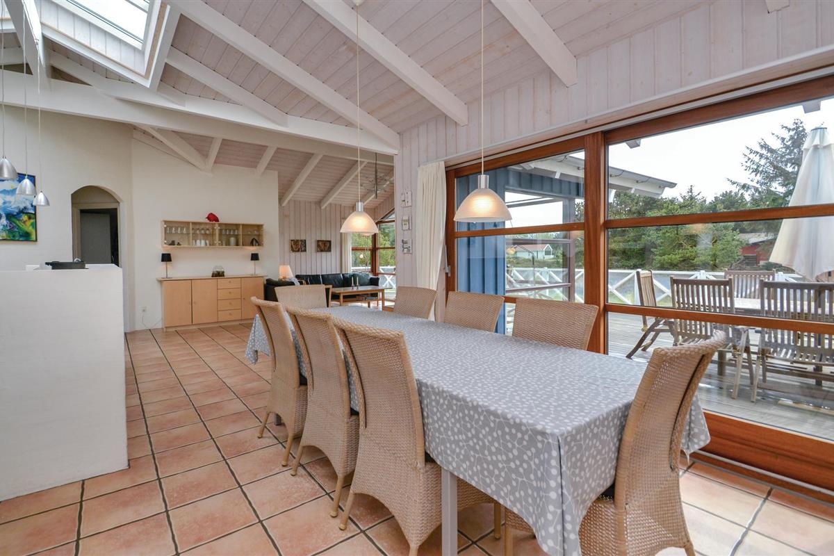 Dit onder architectuur gebouwde huis in Sønderho maakt indruk met een grote houtkachel. De indrukwekkende glaspartijen zorgen voor een prachtige hoeveelheid licht en benadrukken de goed doordachte details van het huis. De kamerindeling is geoptimaliseerd. De slaapgedeeltes bevinden zich in aparte vleugels van het huis, aangevuld met twee aantrekkelijke badkamers. Daarnaast biedt het huis een indrukwekkende entree met voldoende ruimte voor je garderobe en een uitnodigende en goed uitgeruste keuken, die in open verbinding staat met de woonkamer. Hier vind je een gezellige eethoek met directe toegang tot het terras op het westen via grote schuifdeuren. Geniet hier met het gezin van de lange, zwoele zomeravonden.