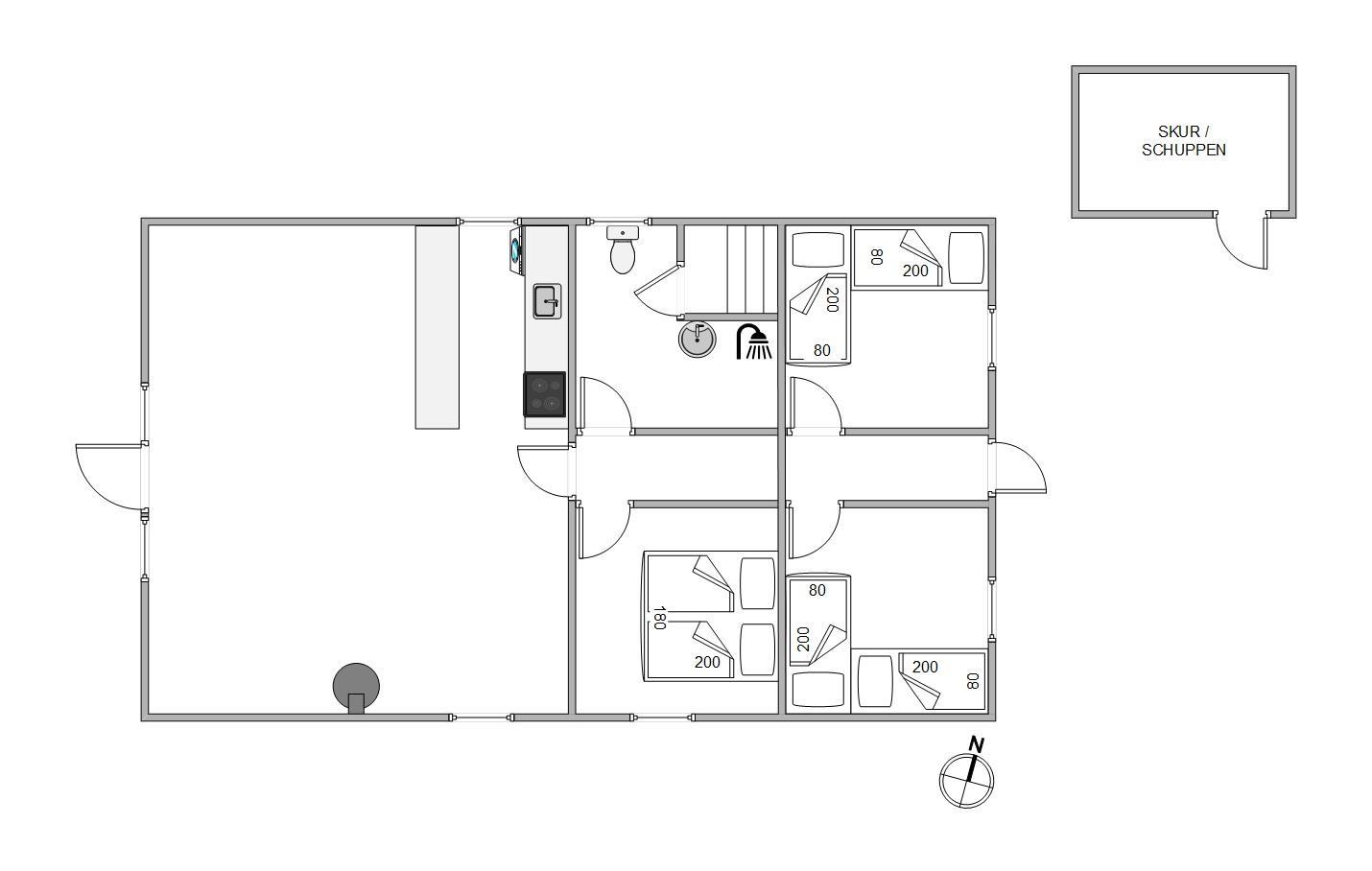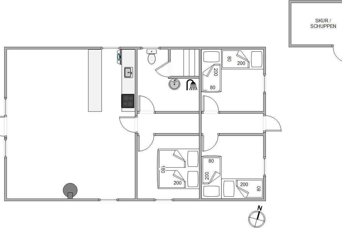 The 84 square metres of living space are optimally designed to accommodate up to 6 people. There's one shower room with an adjoining sauna. Additionally, you'll find three bedrooms - one with a double bed and two with single beds. The open-plan living and dining area with integrated kitchen serves as a cosy communal space, featuring both a wood-burning stove and a modern heat pump.
