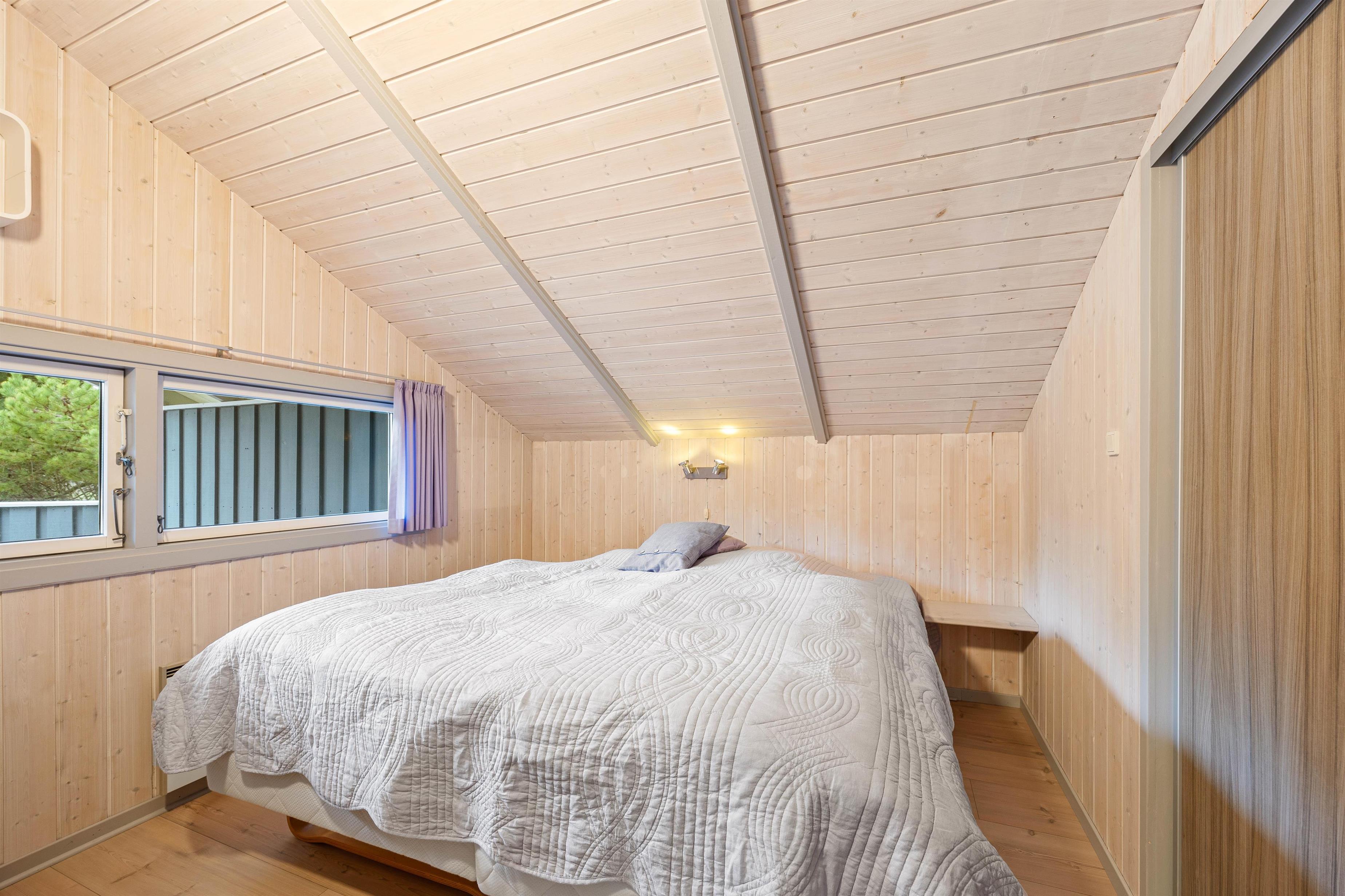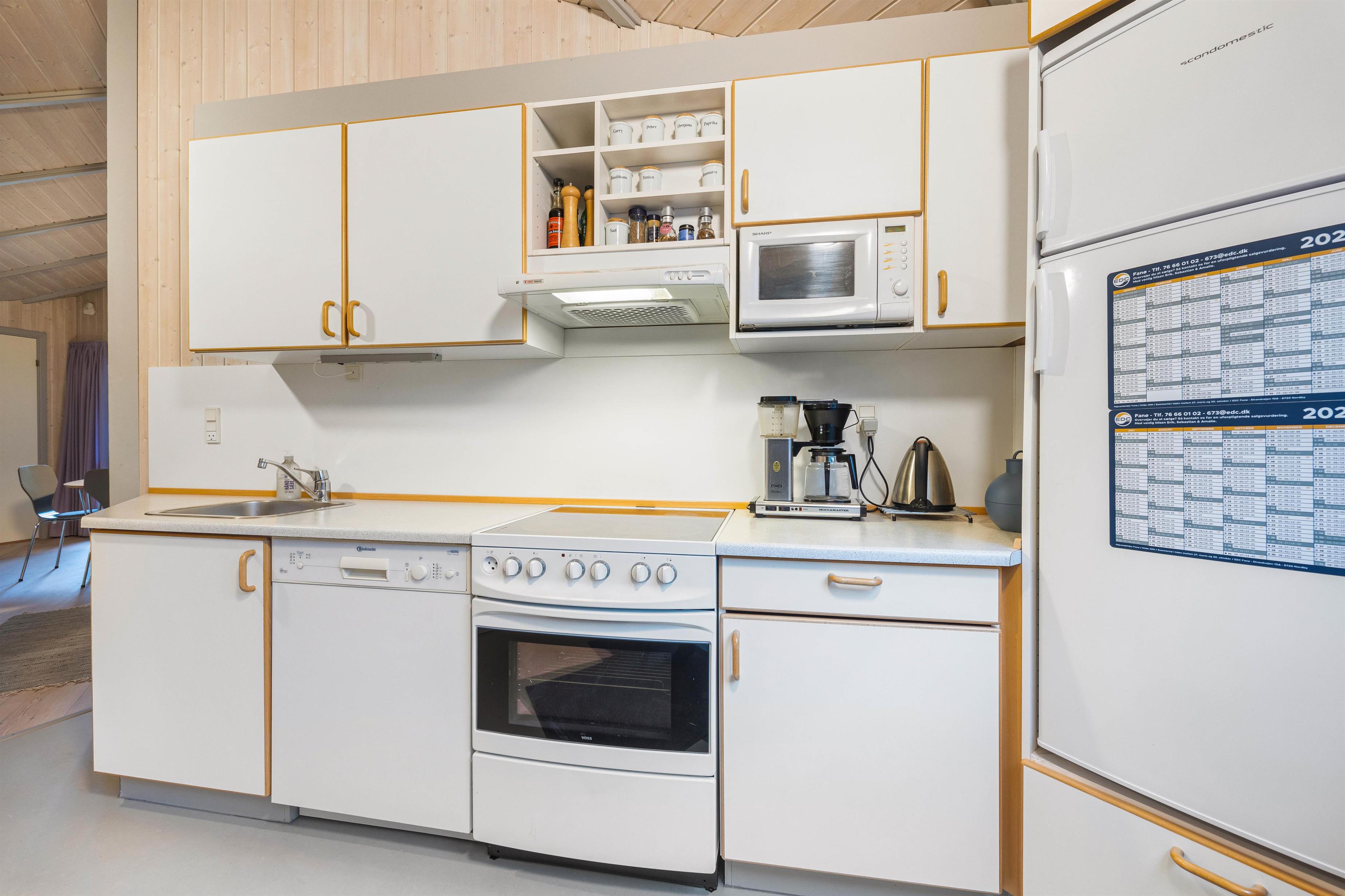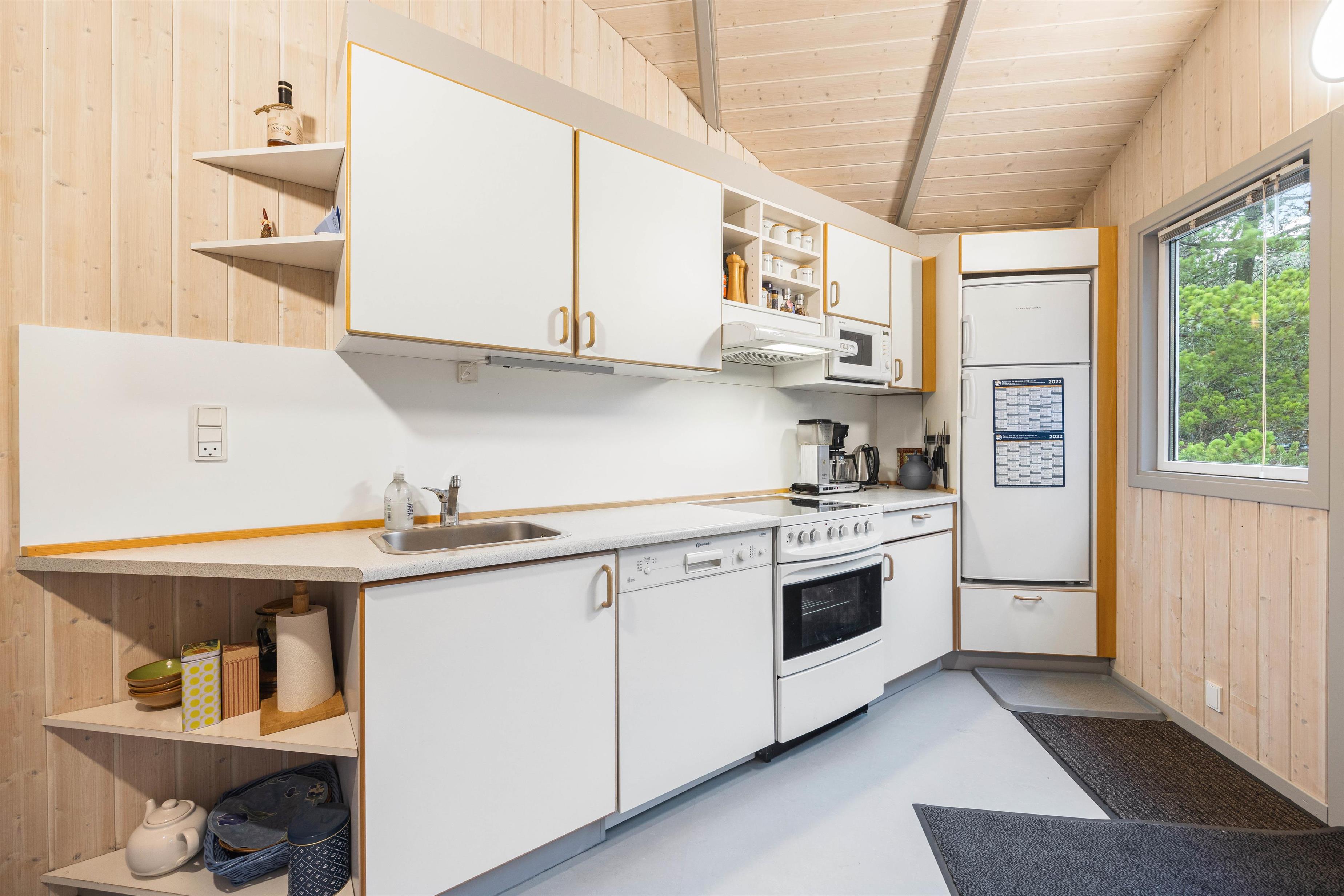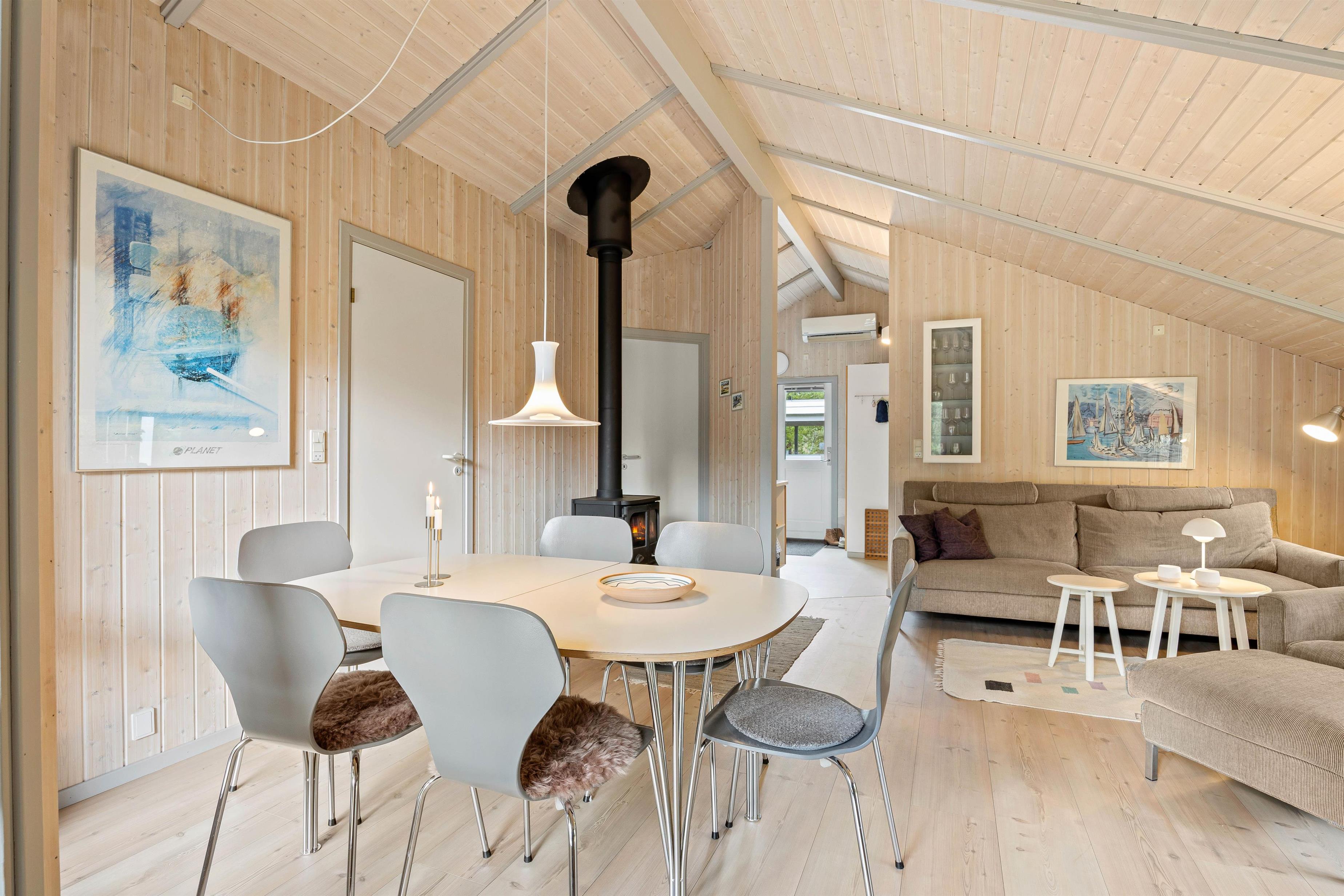 The charming interior invites comfortable gatherings in the living room, which combines a well-equipped kitchen with dishwasher, dining area and living space. Here you can gather around the dining table for a games evening with a glass of wine, watch a good film on television, or settle down with a book in front of the wood-burning stove, which provides pleasant warmth. The holiday home also features a heat pump for energy-efficient heating throughout.