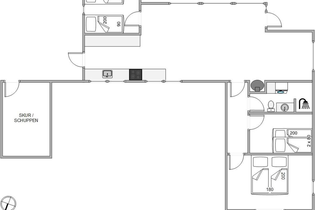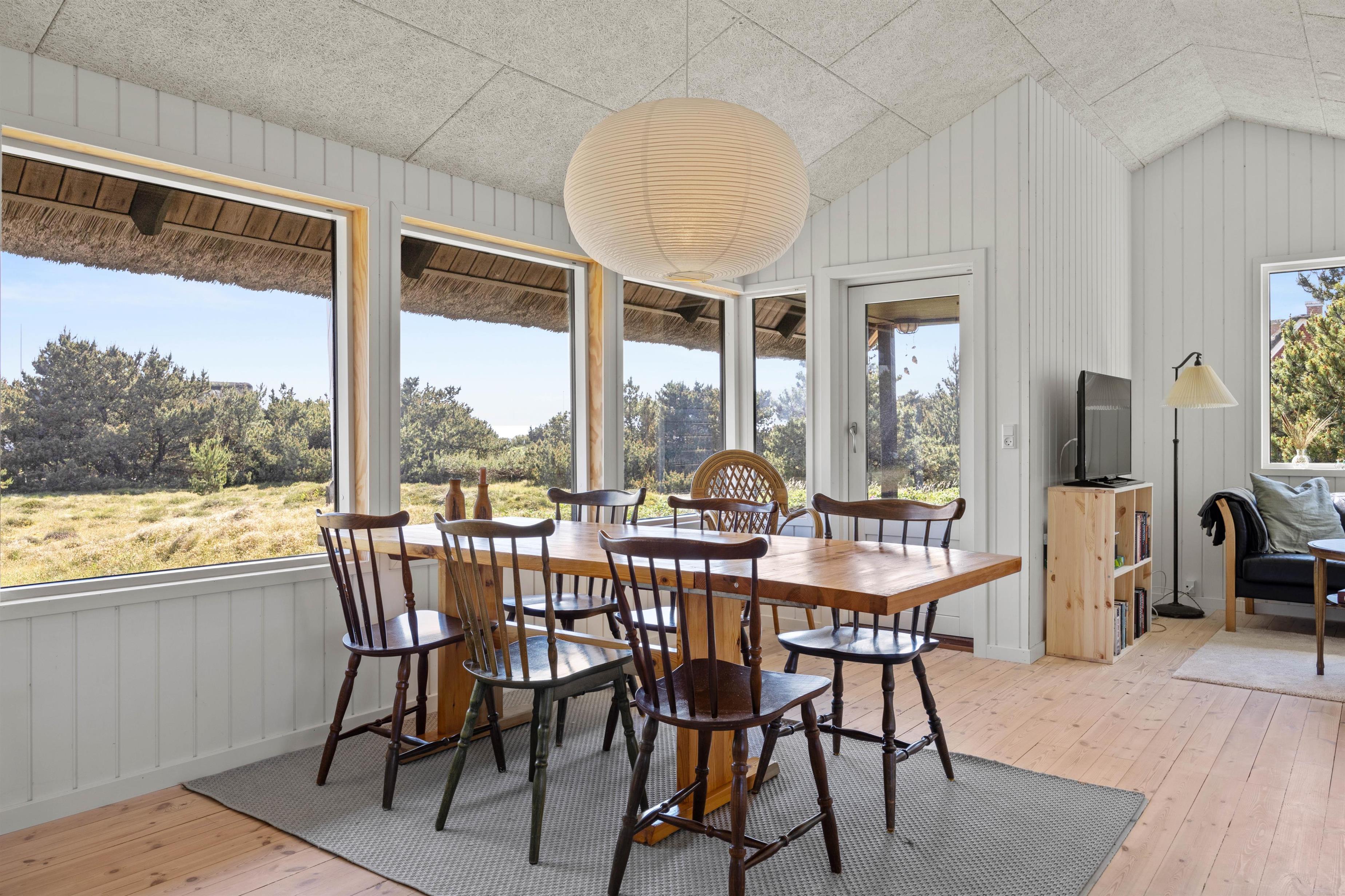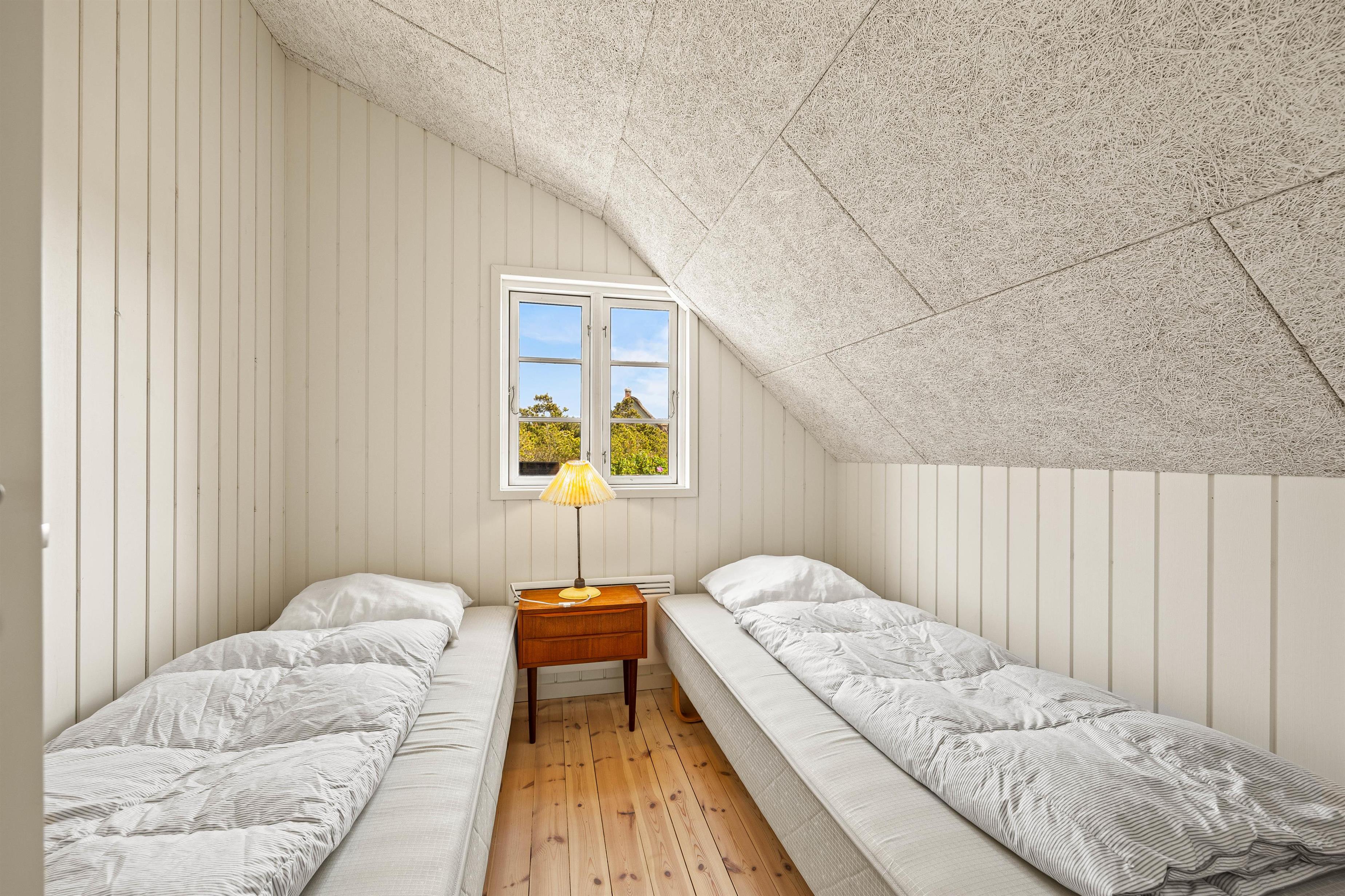 The holiday home has three bedrooms, one featuring a king-size bed (180x200 cm). Double windows overlooking the beautiful dune landscape create a peaceful atmosphere. The other bedrooms offer two single beds (90x200 cm) and one bunk bed (80x200 cm).