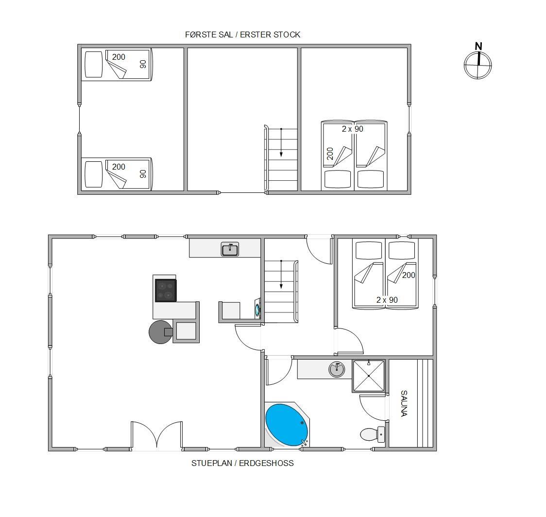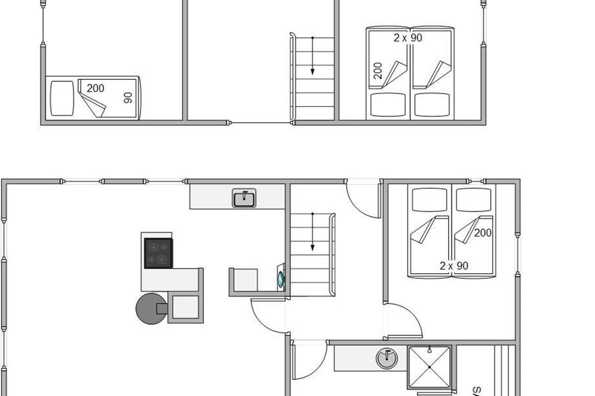 The holiday home features three comfortable bedrooms, furnished with two double beds and two single beds, comfortably accommodating up to six people. Everyone will find their own space to rest after an eventful day. One bedroom is located on the ground floor, with two more on the first floor.