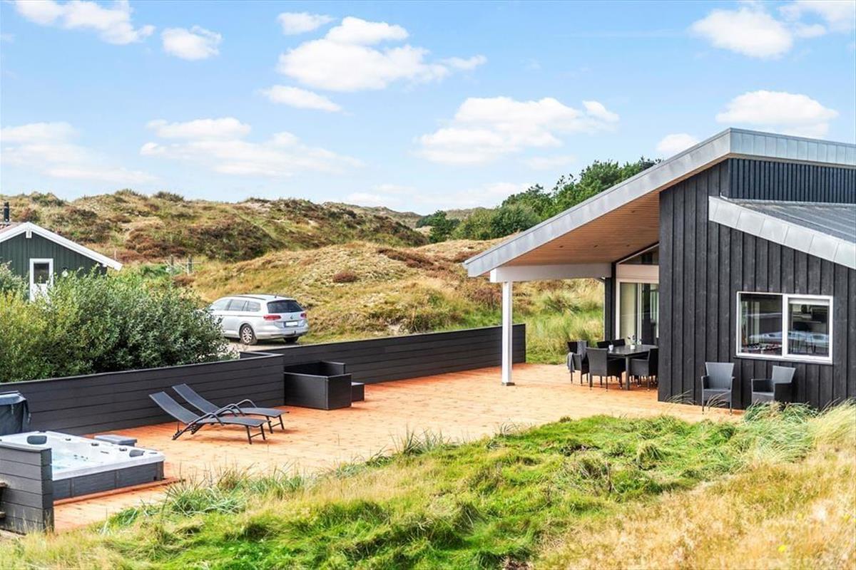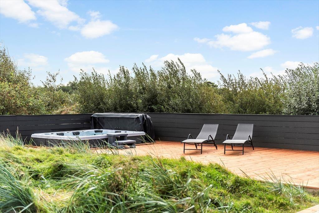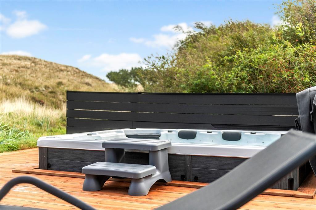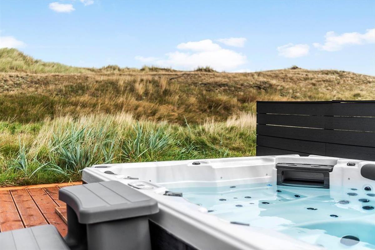 Vom Wohnzimmer und vom Aktivitätsraum aus kannst du die Glastüren öffnen und direkt in die schöne Terrassenlandschaft mit ein 8 Personen Whirlpool treten, die sich vor dem Ferienhaus erstreckt. Ein Teil der Terrasse ist überdacht, während der Rest unter freiem Himmel liegt, damit ihr die Sonne genießen und den Blick auf das geschützte Dünengrundstück sowie die malerische Umgebung genießen könnt. Auch hier im Außenbereich des Hauses ist für bequeme Sitzmöglichkeiten gesorgt – und wenn du die Gesellschaft mit einem frisch zubereiteten Mahl im Freien verwöhnen möchtest, kannst du dich darauf freuen, Fisch oder andere Köstlichkeiten auf dem hauseigenen Grill zuzubereiten.