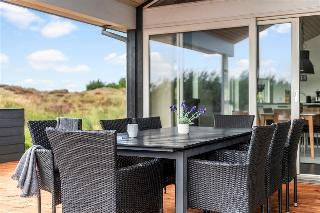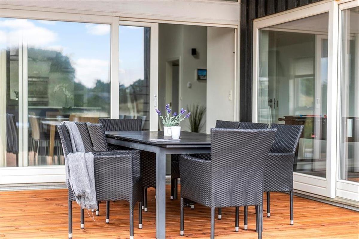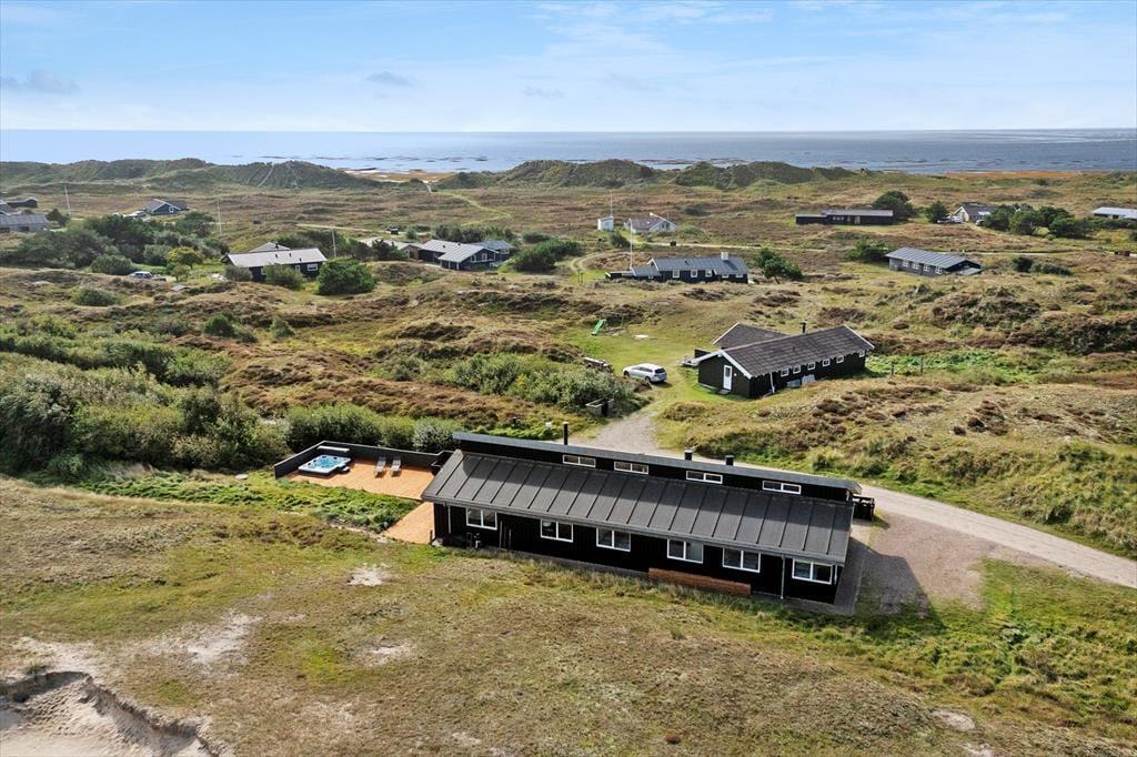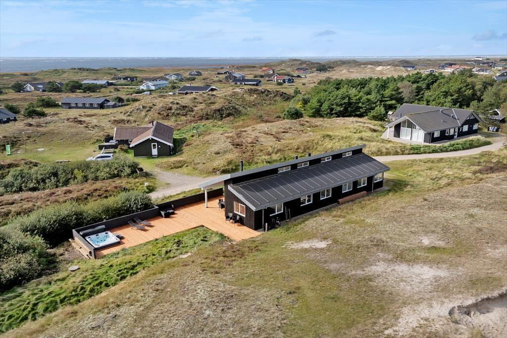 Vom Wohnzimmer und vom Aktivitätsraum aus kannst du die Glastüren öffnen und direkt in die schöne Terrassenlandschaft mit ein 8 Personen Whirlpool treten, die sich vor dem Ferienhaus erstreckt. Ein Teil der Terrasse ist überdacht, während der Rest unter freiem Himmel liegt, damit ihr die Sonne genießen und den Blick auf das geschützte Dünengrundstück sowie die malerische Umgebung genießen könnt. Auch hier im Außenbereich des Hauses ist für bequeme Sitzmöglichkeiten gesorgt – und wenn du die Gesellschaft mit einem frisch zubereiteten Mahl im Freien verwöhnen möchtest, kannst du dich darauf freuen, Fisch oder andere Köstlichkeiten auf dem hauseigenen Grill zuzubereiten.