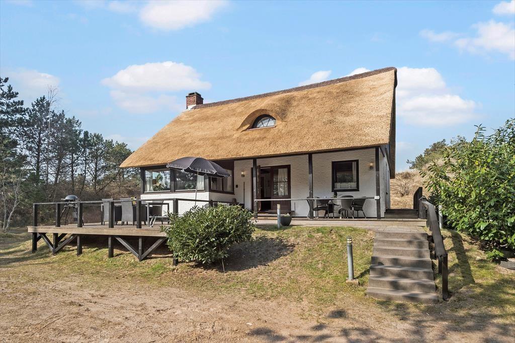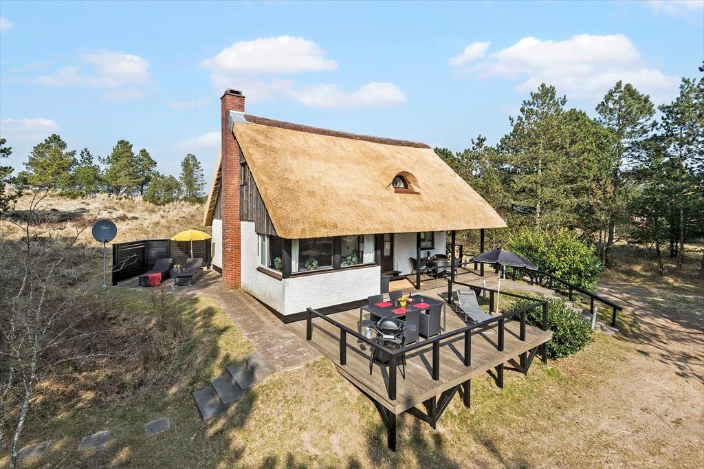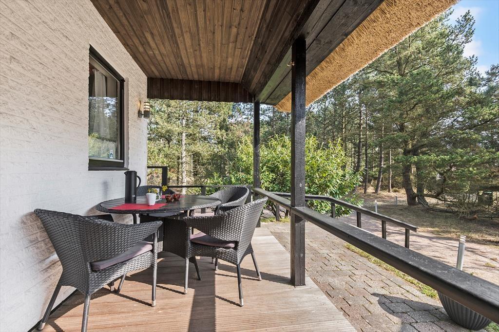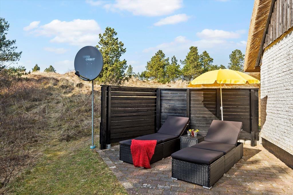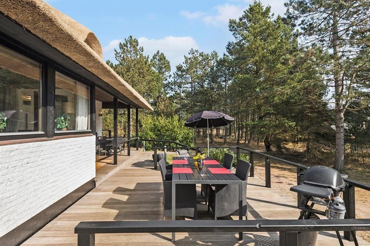 Das 2.500 m² große Naturgrundstück, auf dem sich dieses Urlaubsdomizil befindet, ist hügelig. Die an das Haus anschließenden Terrassenbereiche befinden sich derfor på forskellige niveauer. Ein Teil der Terrasse ist überdacht. Der offene, nach Süden ausgerichtete Terrassenbereich stellt einen hervorragenden Aufenthaltsort für Urlauber dar, die sich gerne ausgiebig von der Sommersonne verwöhnen lassen möchten. Dank der Bäume und der hügeligen Landschaft wirst du das Gefühl haben, ganz wunderbar ungestört, mitten in der Natur zu wohnen.