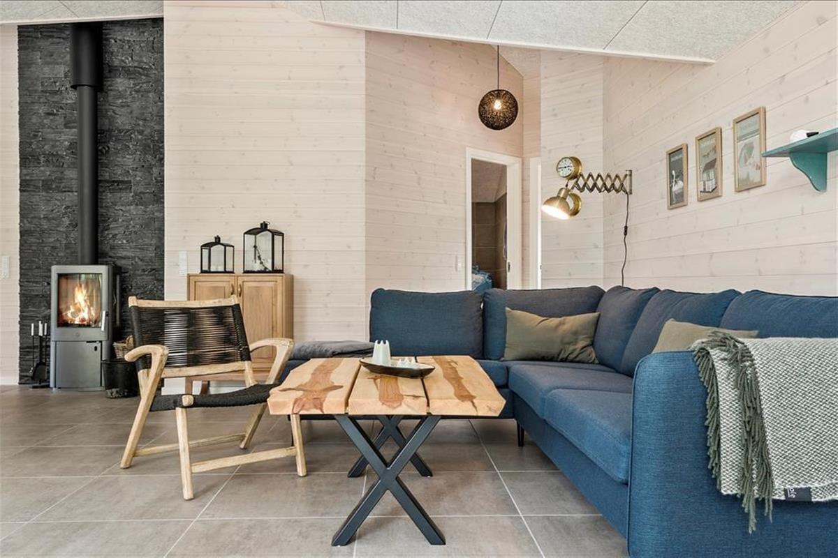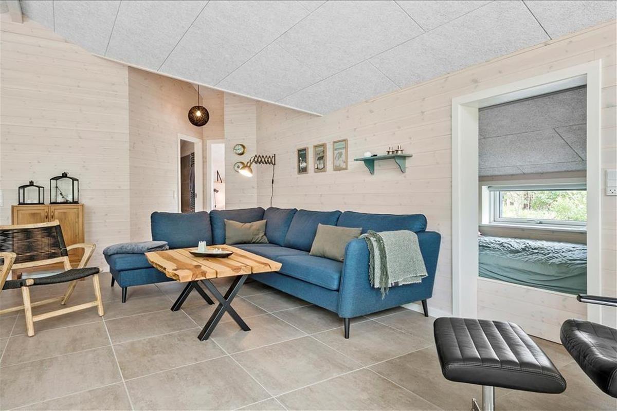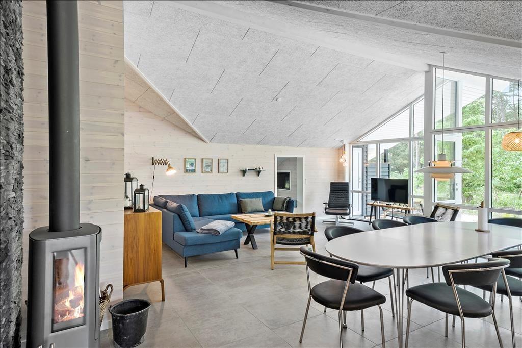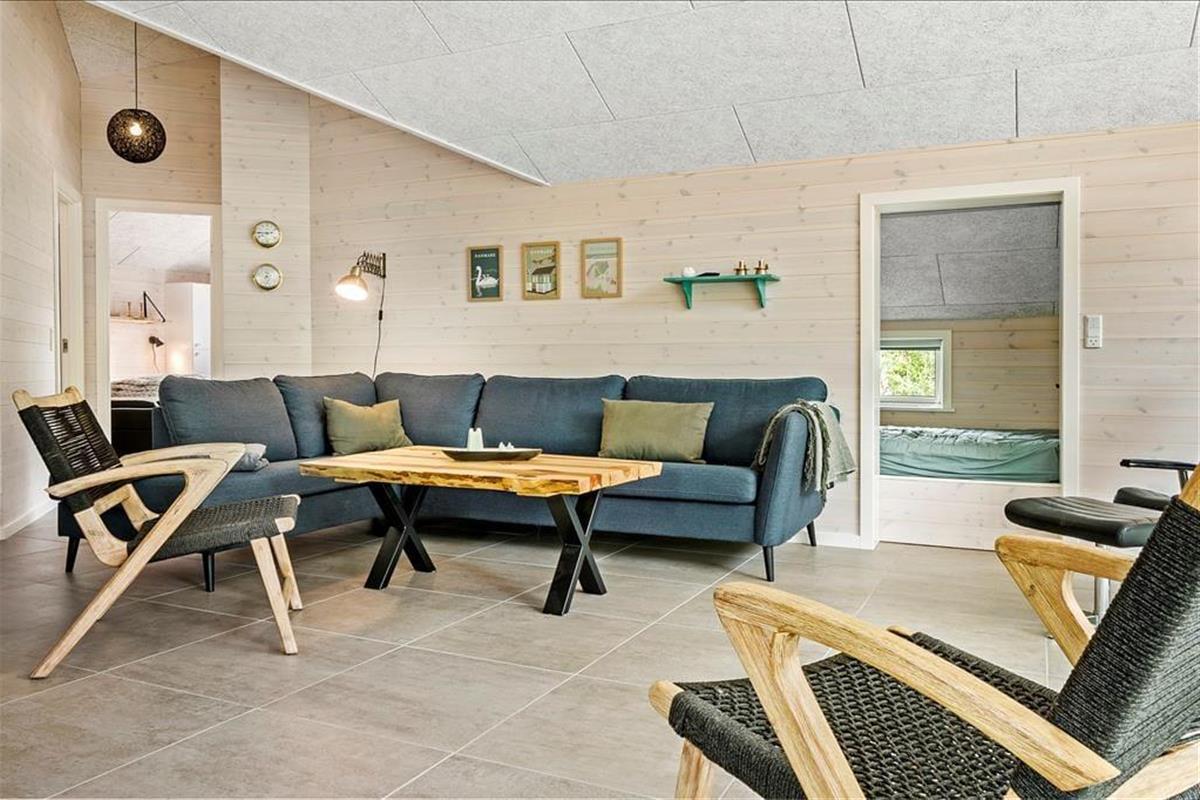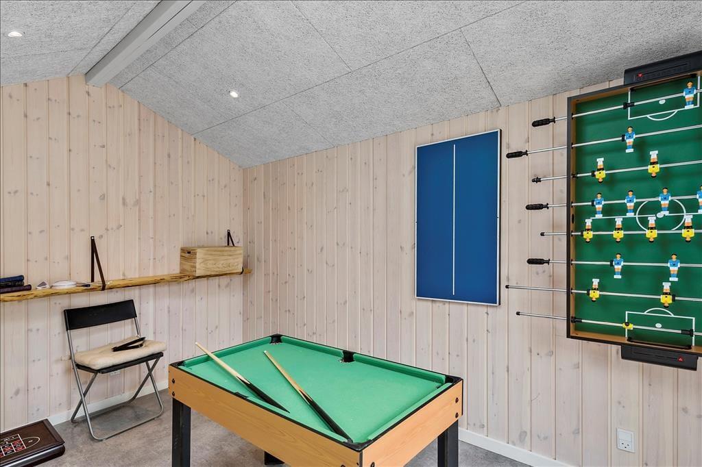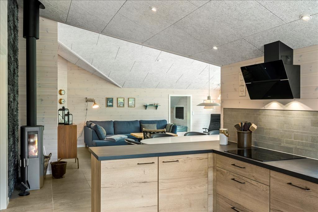 Ein Qualitätshaus wie dieses bildet einen sowohl schönen als auch komfortablen Rahmen für die gemeinsamen Stunden im Innenbereich. Alle Räume sind einladend eingerichtet, und die Akustikdecken, die Holzwände und der gute Lichteinfall tragen zu der angenehmen und freundlichen Ferienhausstimmung bei. Im Wohnbereich gibt es genügend Platz, um zusammen zu sein – sowohl in der schönen offenen Küche als auch am Esstisch beim Brennofen oder in der Sofaecke. An den Wohnbereich angrenzend befindet sich ein Alkoven mit einem Doppelbett, und darüber hinaus gibt es drei weitere gute Schlafzimmer, sodass das Haus über Schlafplätze für insgesamt acht Personen verfügt. Der Grundriss beinhaltet ebenfalls einen Eingangsbereich mit Waschmaschine und Trockner sowie zwei Badezimmer, von denen das eine mit Sauna und Whirlpool ausgestattet ist – mit anderen Worten, ein perfekter Ort, um eine entspannende Pause einzulegen. Bist du eher in der Stimmung für Spiel und Spaß, kannst du dich in den Aktivitätsraum begeben und dort Tischfußball, Tischtennis und andere Spiele in Miniausführung spielen.