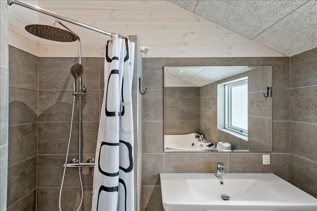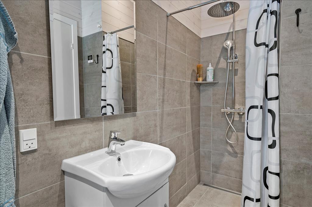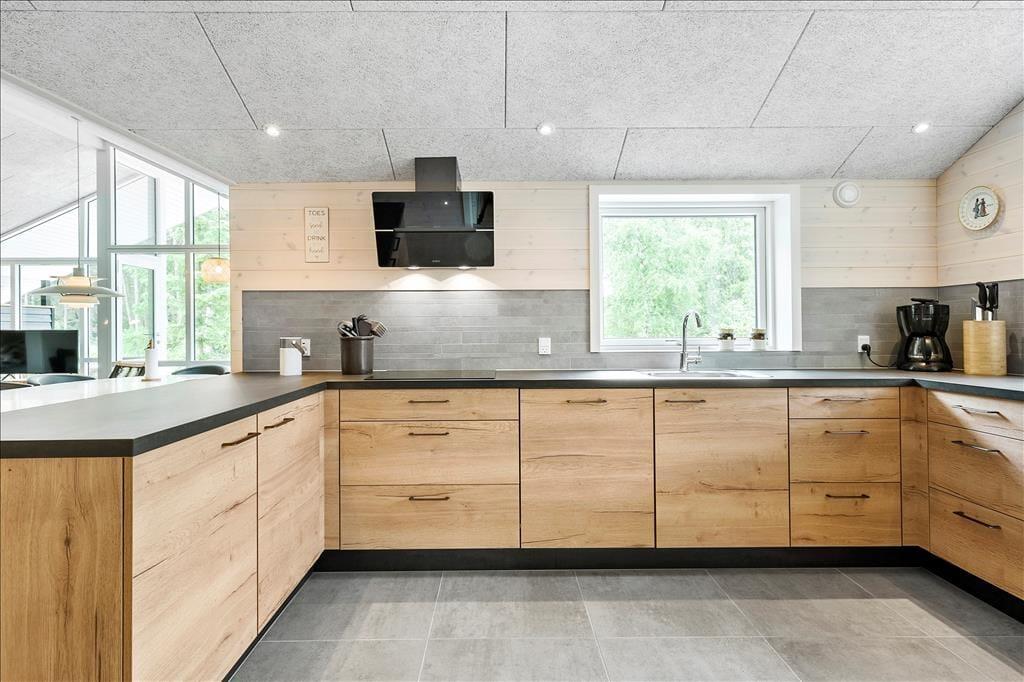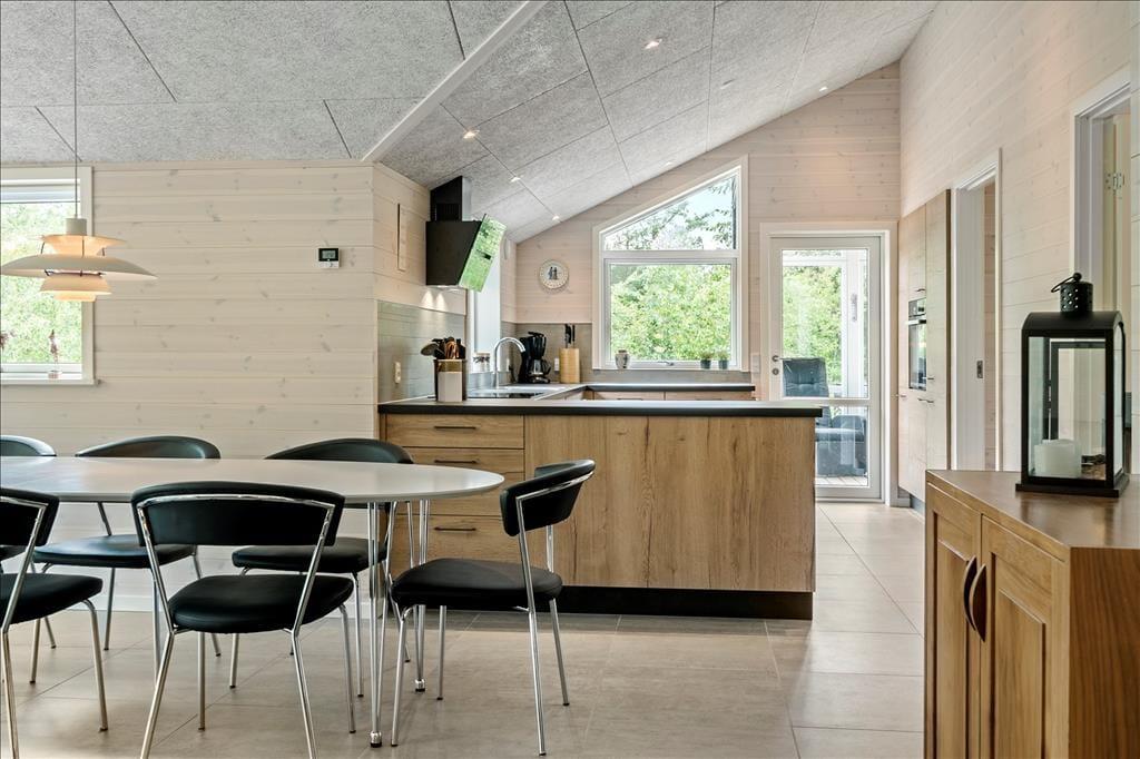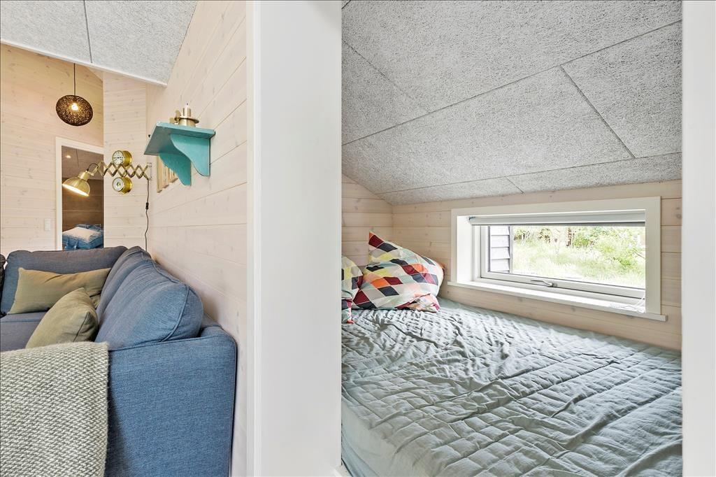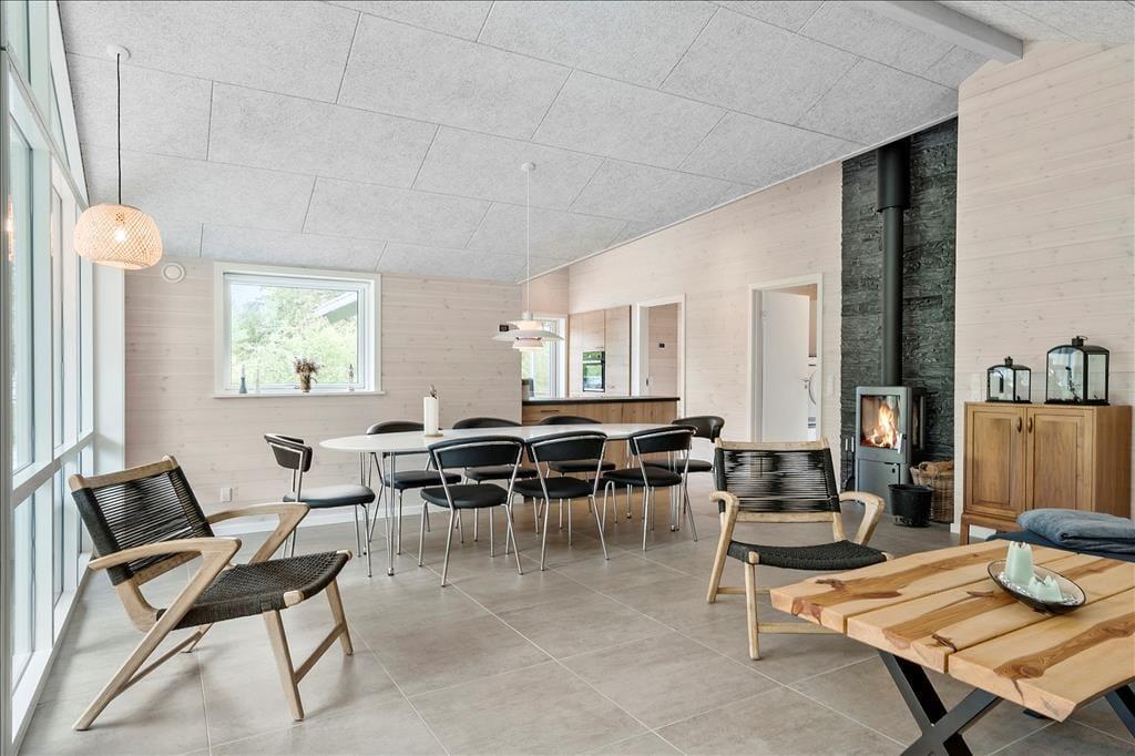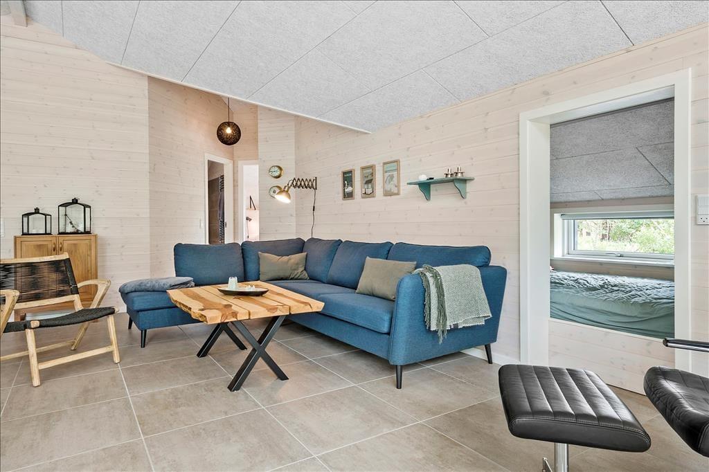 Ein Qualitätshaus wie dieses bildet einen sowohl schönen als auch komfortablen Rahmen für die gemeinsamen Stunden im Innenbereich. Alle Räume sind einladend eingerichtet, und die Akustikdecken, die Holzwände und der gute Lichteinfall tragen zu der angenehmen und freundlichen Ferienhausstimmung bei. Im Wohnbereich gibt es genügend Platz, um zusammen zu sein – sowohl in der schönen offenen Küche als auch am Esstisch beim Brennofen oder in der Sofaecke. An den Wohnbereich angrenzend befindet sich ein Alkoven mit einem Doppelbett, und darüber hinaus gibt es drei weitere gute Schlafzimmer, sodass das Haus über Schlafplätze für insgesamt acht Personen verfügt. Der Grundriss beinhaltet ebenfalls einen Eingangsbereich mit Waschmaschine und Trockner sowie zwei Badezimmer, von denen das eine mit Sauna und Whirlpool ausgestattet ist – mit anderen Worten, ein perfekter Ort, um eine entspannende Pause einzulegen. Bist du eher in der Stimmung für Spiel und Spaß, kannst du dich in den Aktivitätsraum begeben und dort Tischfußball, Tischtennis und andere Spiele in Miniausführung spielen.
