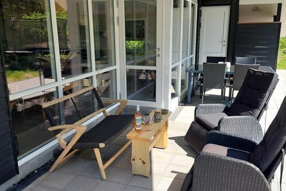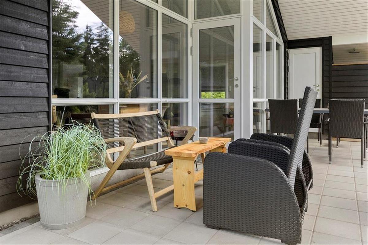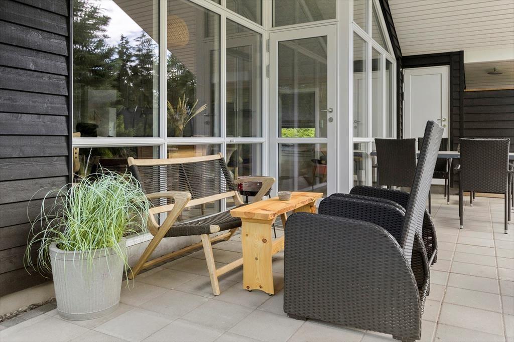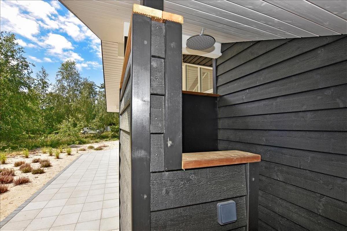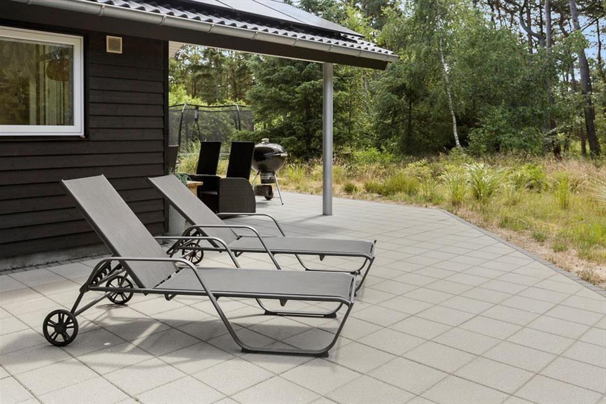 Um das gesamte Ferienhaus herum schmiegt sich eine geflieste Terrasse, die sowohl offene, überdachte als auch abgeschirmte Bereiche bereithält. So kannst du immer den idealen Aufenthaltsort finden, ganz gleich, ob du Sonne, Schatten oder Windschutz bevorzugst. Ist es an der Zeit, sich abzukühlen, dann ist direkt am Haus eine Außendusche angebracht. Zudem steht auf dem 2.500 m² großen Naturgrundstück selbstverständlich auch ein Grill zur Verfügung.