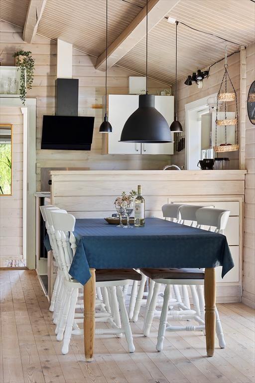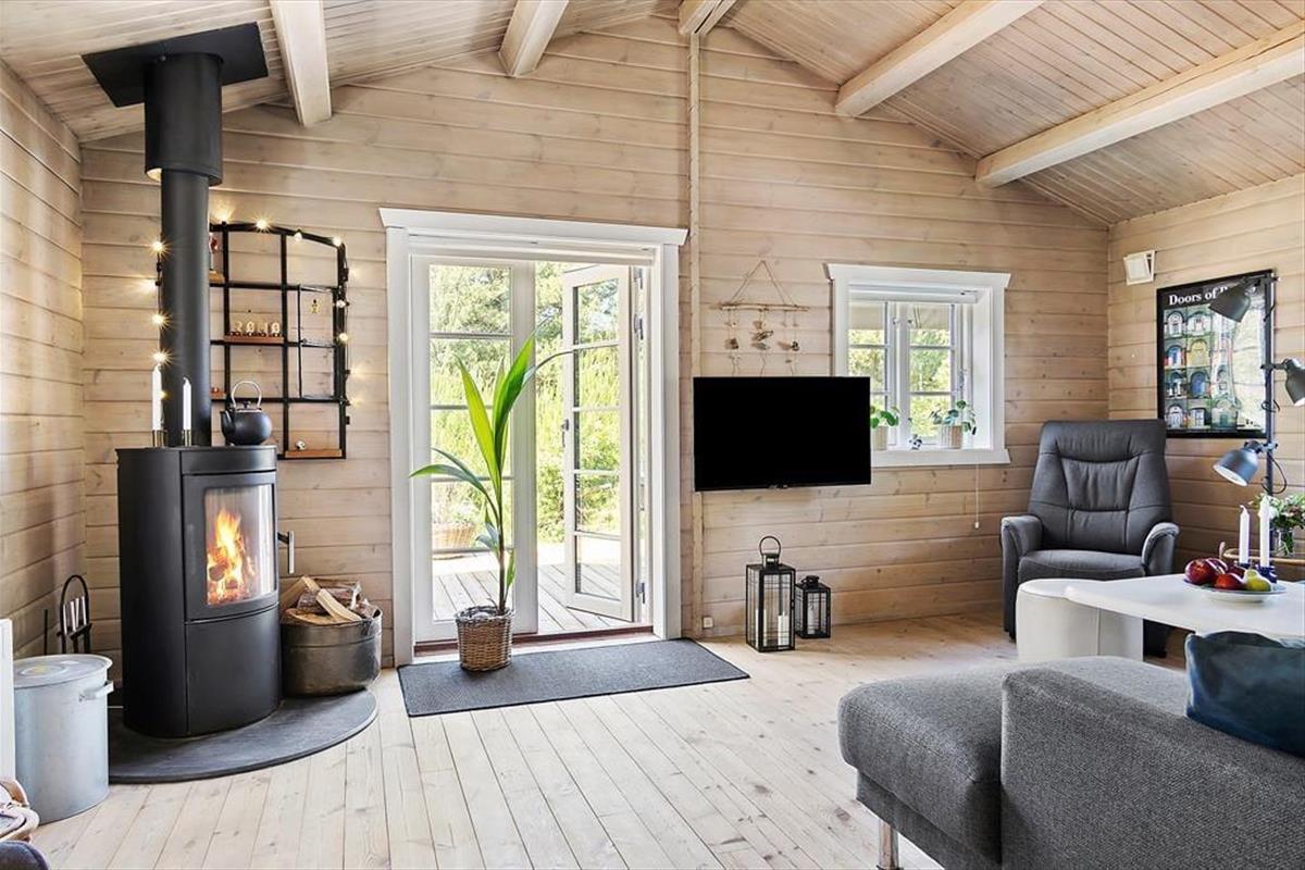 Das Ferienhaus steht hier seit 1992, wo es auf schöne und klassische Weise mit solider Holzfassade und weißen Sprossenfenstern errichtet wurde. Im Innen herrscht eine gute Atmosphäre. Es ist ein Ort, an dem du dich schnell zuhause fühlen und die Urlaubsstimmung wirklich erleben kannst, während du im offenen Küchenbereich mit dem Kochen beschäftigt bist, Brettspiele spielst und dich im Wohnzimmer entspannst oder in einem der drei Schlafzimmer lange schläfst. Alle Räume sind hell und einladend eingerichtet – auch das Badezimmer, das unter anderem mit einer Waschmaschine ausgestattet ist, sodass die Urlaubswäsche aufgefrischt werden kann, falls du nicht genug Shorts und Sommerkleider eingepackt hast.