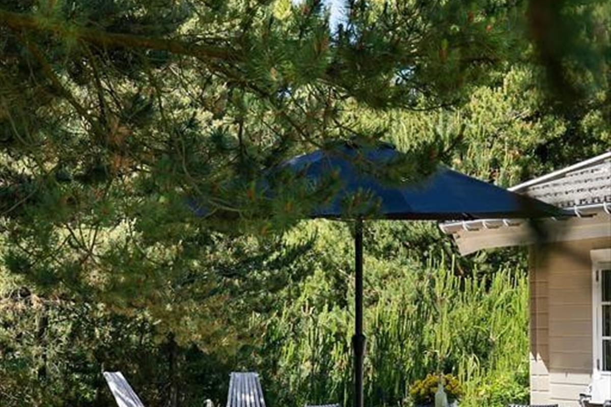 Das Naturgrundstück misst außerdem 2.800 m², sodass genügend Platz zum Spielen auf der Rasenfläche und zum Entspannen auf der großen Holzterrasse vorhanden ist, die sich um zwei Seiten des Ferienhauses schmiegt. Das Leben im Freien kann hier ungestört stattfinden, dank der Kiefern, die auch etwas Schutz bieten, falls es windig sein sollte. Auch das Auto hat gute Bedingungen, denn es kann im Carport geparkt werden.
