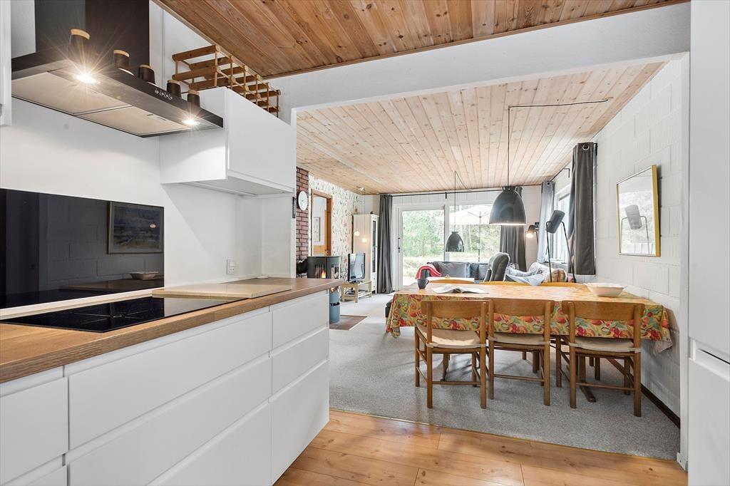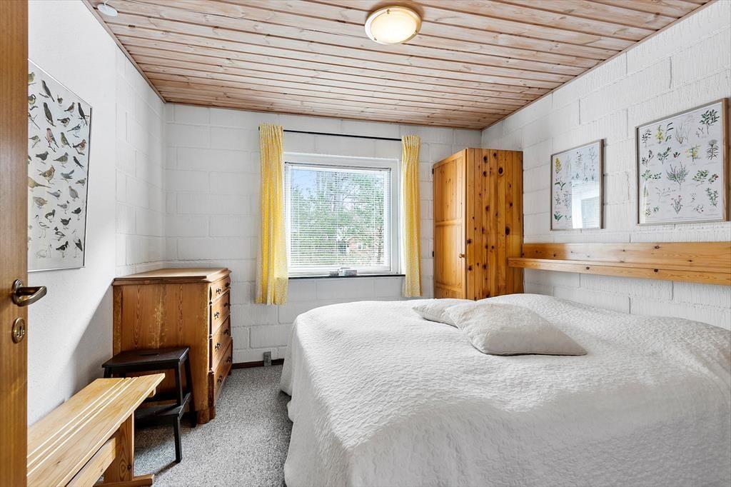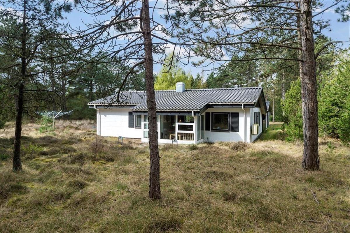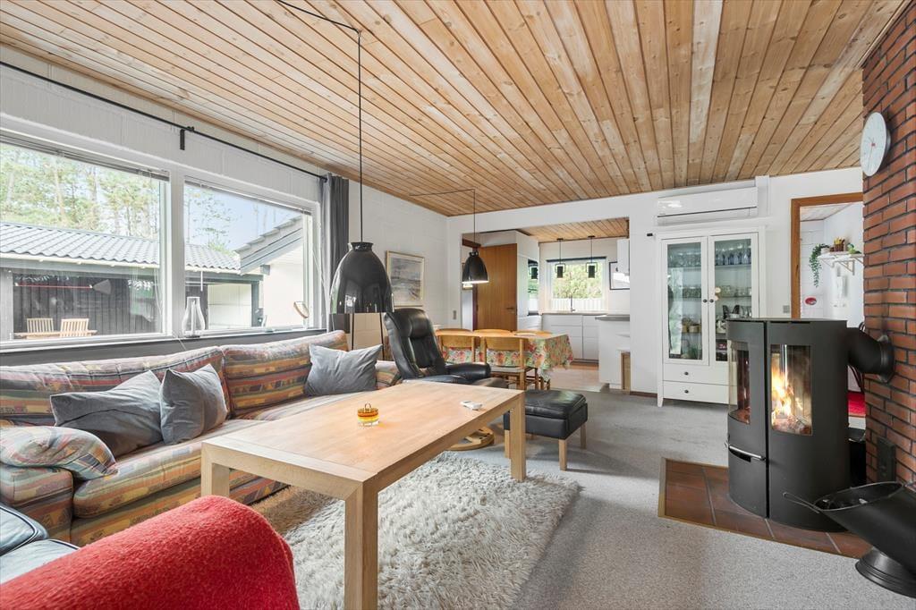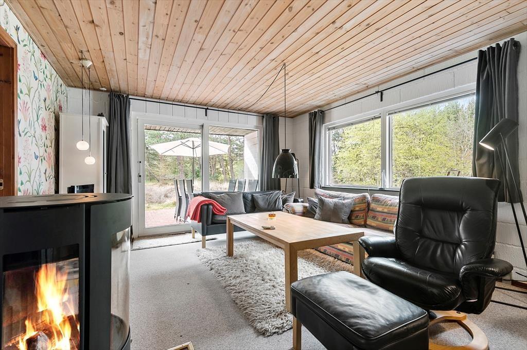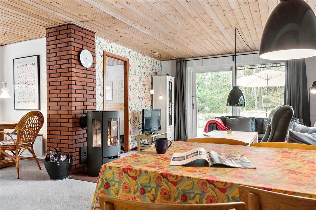 In einem bewaldeten Ferienhausgebiet, nur einen Kilometer abseits des Sønderstrands, erwartet dich dieses gemütliche und gut eingerichtete Ferienhaus. Inmitten der wunderbar natürlichen Umgebung kannst du dich nach Herzenslust frei entfalten - dies gilt nicht zuletzt für den Wohnraum, der dich mit einem ansprechenden Blick auf die hohen Fichten des Grundstücks und die wild wachsenden Pflanzen verwöhnt.