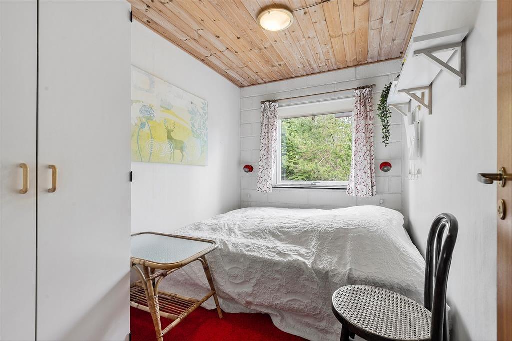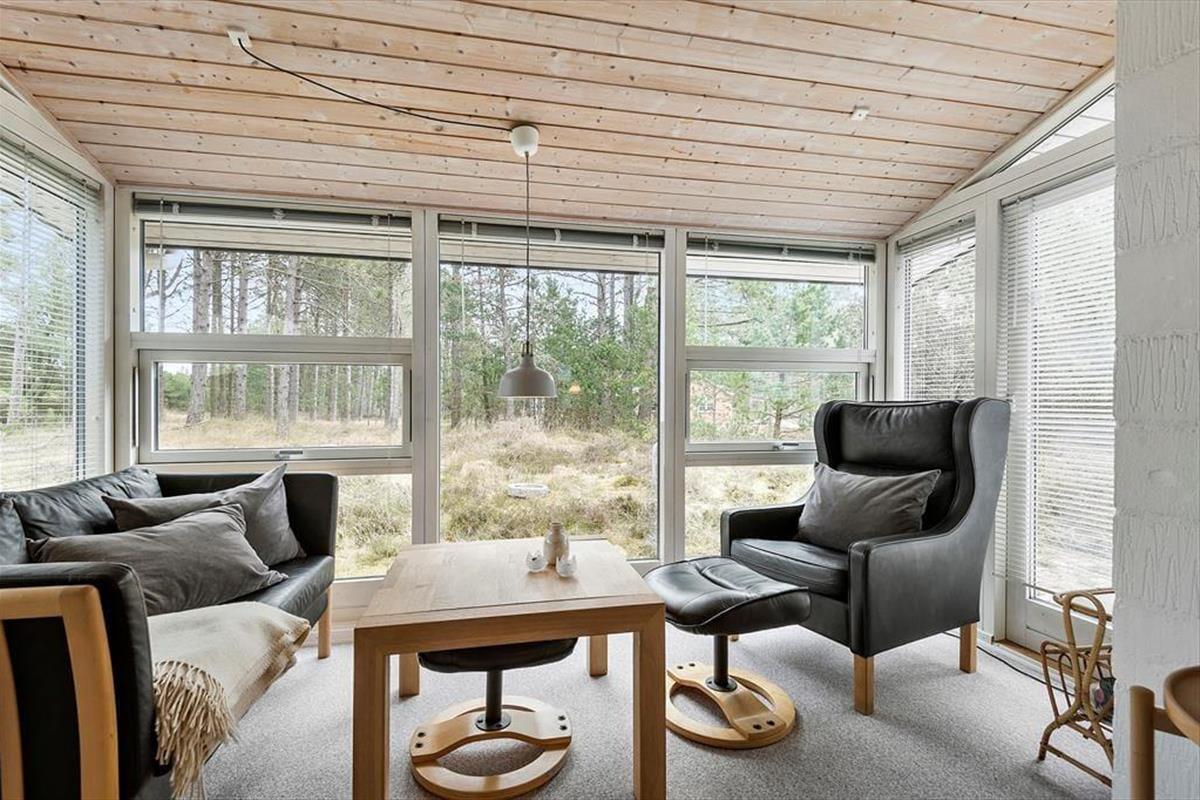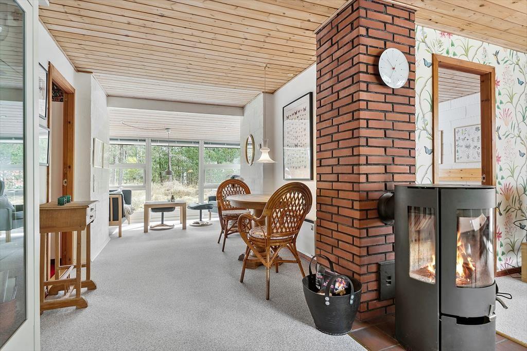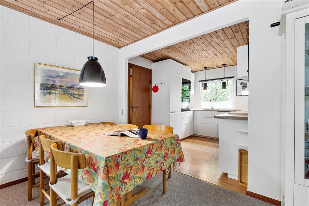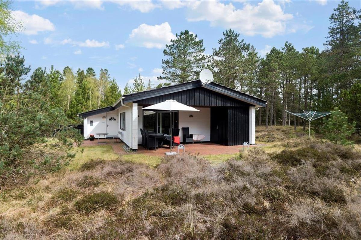 In einem bewaldeten Ferienhausgebiet, nur einen Kilometer abseits des Sønderstrands, erwartet dich dieses gemütliche und gut eingerichtete Ferienhaus. Inmitten der wunderbar natürlichen Umgebung kannst du dich nach Herzenslust frei entfalten - dies gilt nicht zuletzt für den Wohnraum, der dich mit einem ansprechenden Blick auf die hohen Fichten des Grundstücks und die wild wachsenden Pflanzen verwöhnt.