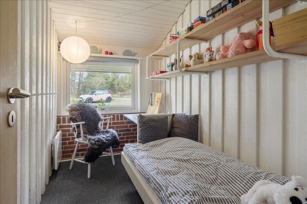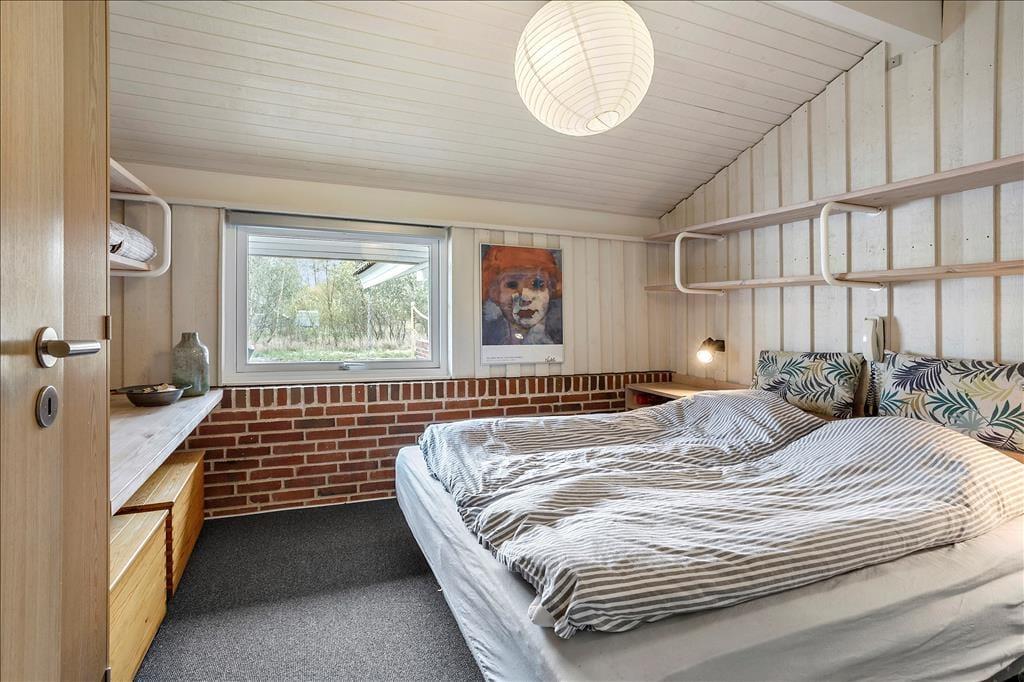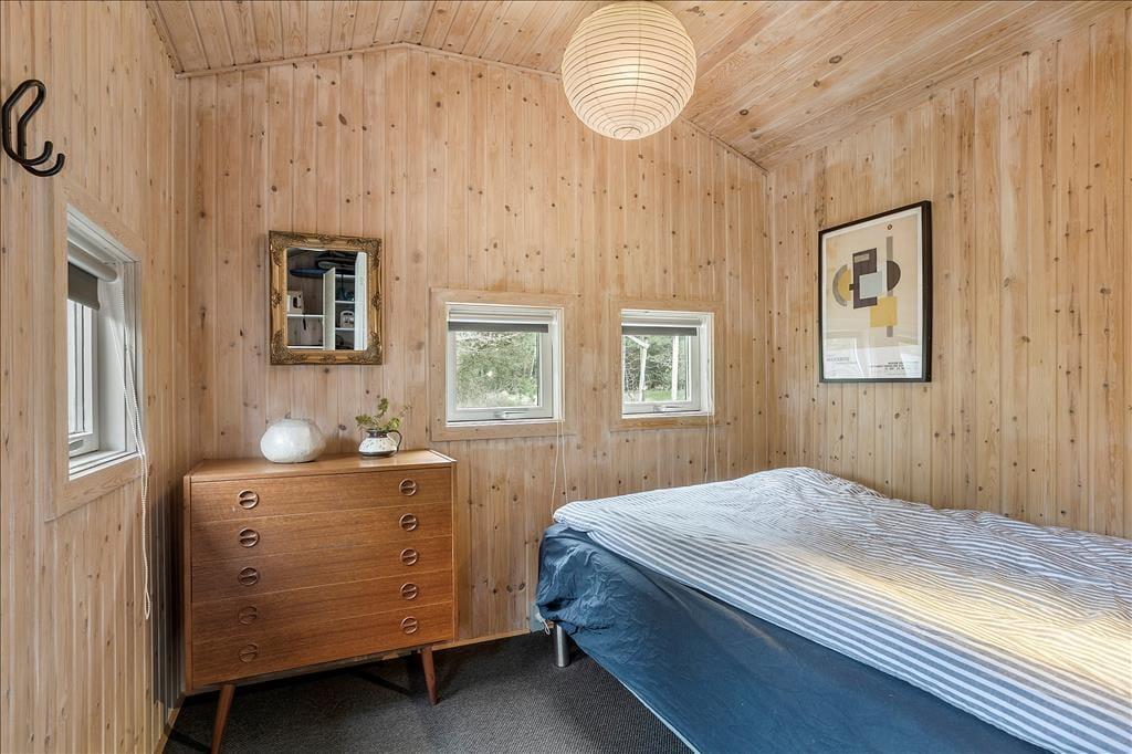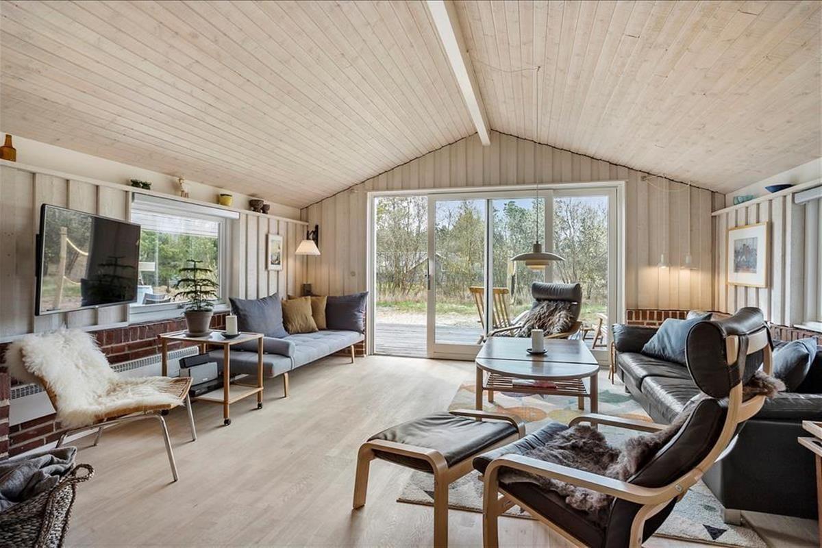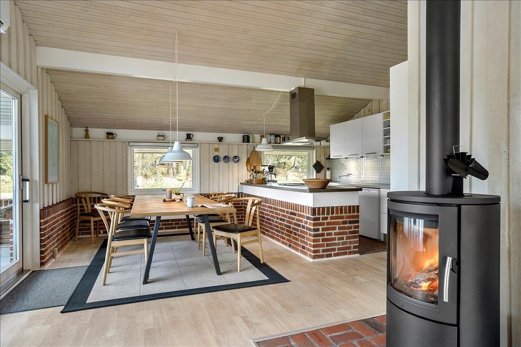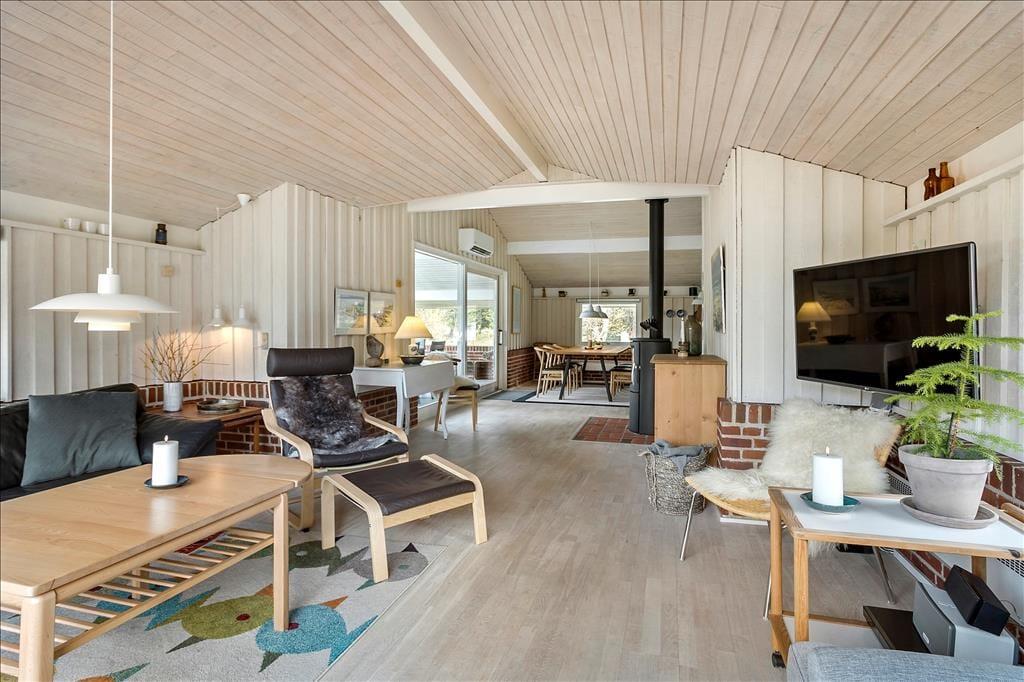 Das Ferienhaus empfängt dich mit einer vernünftig und wohldurchdacht aufgeteilten Wohnfläche, die sich aus einem Aufenthaltsbereich, Schlafräumen und praktischen Räumlichkeiten, wie einem Badezimmer und einem Hauswirtschaftsbereich, zusammensetzt. Sämtliche Räumlichkeiten präsentieren sich in einem hellen und gepflegten Zustand. Dies gilt auch für das mit einem Doppelbett ausgestattete Schlafzimmer im Nebengebäude. Das Haupthaus beherbergt vier Schlafräume, von denen zwei mit je einem Einzelbett eingerichtet sind. Das dritte Schlafzimmer beinhaltet zwei Einzelbetten und das vierte und größte ein Doppelbett. Zum zentralen Sammelpunkt aller Mitreisenden wird sicherlich schnell der Aufenthaltsbereich im Haupthaus avancieren, der die offene Küche und den Wohnraum harmonisch in sich vereint. Mit seinem herrlichen Lichteinfall, den hohen, schrägen Decken und der weißen Holzvertäfelung der Wände schafft dieser Raum ein helles, luftiges und behagliches Wohnambiente. Ein Maximum an echter dänischer Ferienhausgemütlichkeit garantiert dir der romantisch knisternde Kaminofen. An kalten Tagen wird dieser durch eine moderne Wärmepumpe unterstützt, die für angenehme Raumtemperaturen während geselliger Runden am Esstisch oder gemütlichen Abenden auf der ansprechenden Polstergarnitur sorgt.