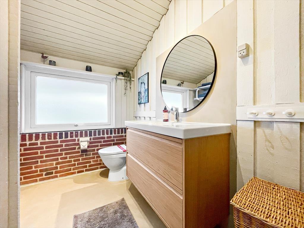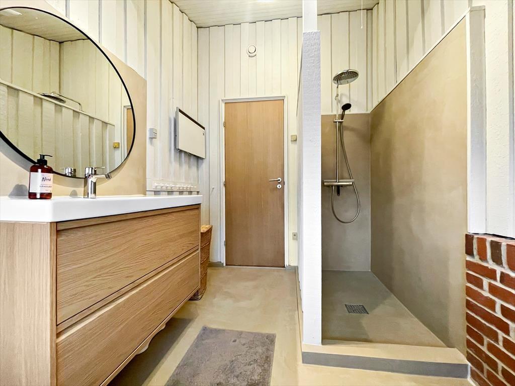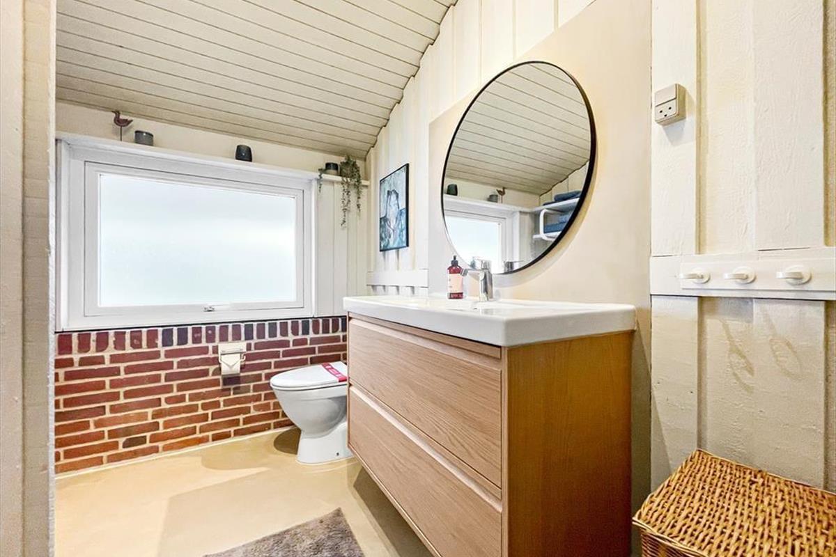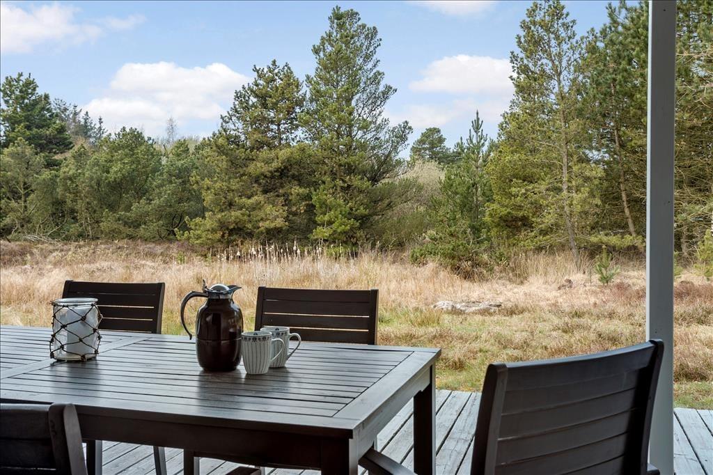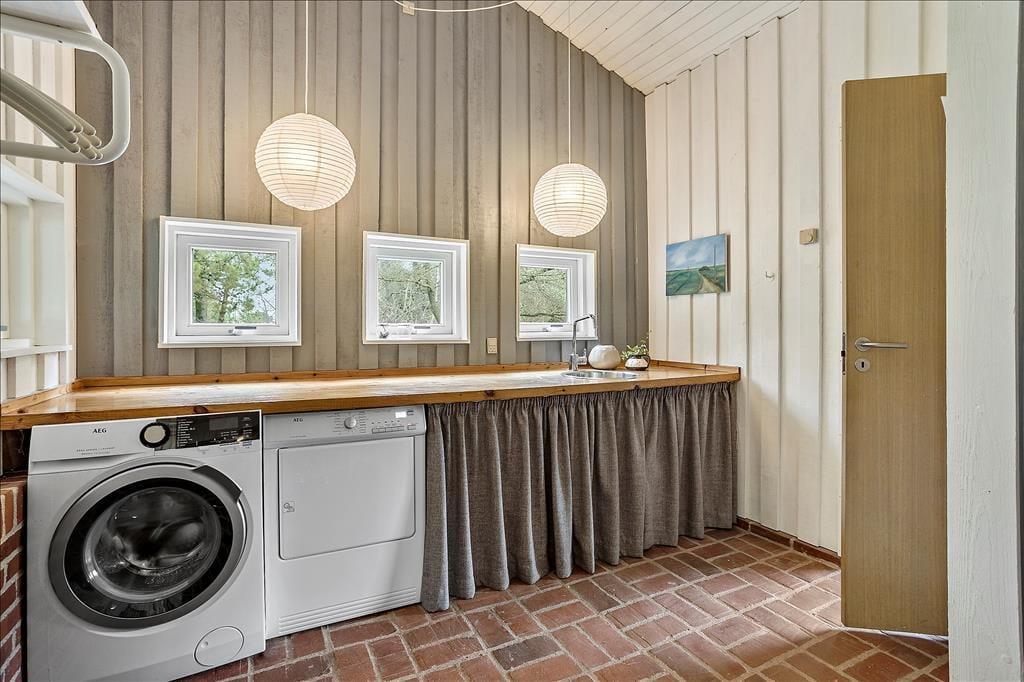 Das Ferienhaus empfängt dich mit einer vernünftig und wohldurchdacht aufgeteilten Wohnfläche, die sich aus einem Aufenthaltsbereich, Schlafräumen und praktischen Räumlichkeiten, wie einem Badezimmer und einem Hauswirtschaftsbereich, zusammensetzt. Sämtliche Räumlichkeiten präsentieren sich in einem hellen und gepflegten Zustand. Dies gilt auch für das mit einem Doppelbett ausgestattete Schlafzimmer im Nebengebäude. Das Haupthaus beherbergt vier Schlafräume, von denen zwei mit je einem Einzelbett eingerichtet sind. Das dritte Schlafzimmer beinhaltet zwei Einzelbetten und das vierte und größte ein Doppelbett. Zum zentralen Sammelpunkt aller Mitreisenden wird sicherlich schnell der Aufenthaltsbereich im Haupthaus avancieren, der die offene Küche und den Wohnraum harmonisch in sich vereint. Mit seinem herrlichen Lichteinfall, den hohen, schrägen Decken und der weißen Holzvertäfelung der Wände schafft dieser Raum ein helles, luftiges und behagliches Wohnambiente. Ein Maximum an echter dänischer Ferienhausgemütlichkeit garantiert dir der romantisch knisternde Kaminofen. An kalten Tagen wird dieser durch eine moderne Wärmepumpe unterstützt, die für angenehme Raumtemperaturen während geselliger Runden am Esstisch oder gemütlichen Abenden auf der ansprechenden Polstergarnitur sorgt.