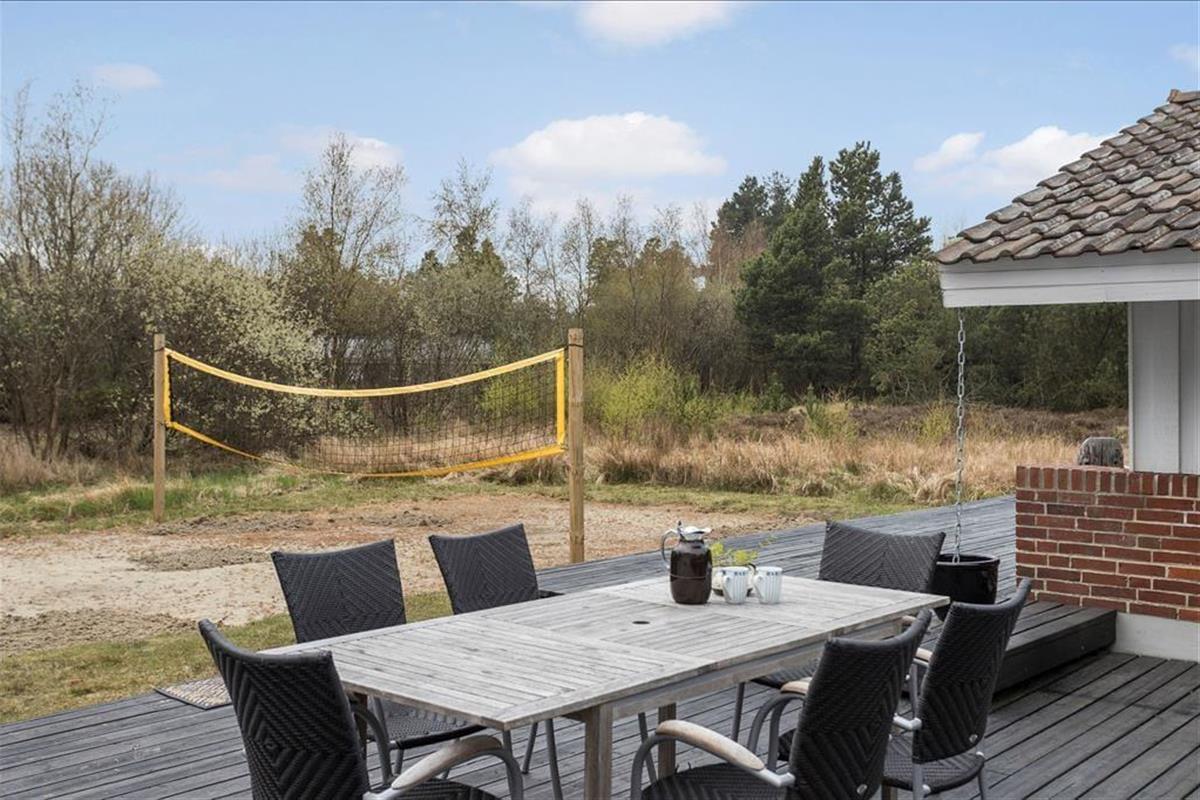 Eine große, leicht erhöhte Terrasse erstreckt sich südlich und westlich des Hauses. Sie bildet eine Verbindung zwischen dem Haupthaus und dem Nebengebäude und sorgt somit dafür, dass du dich trockenen Fußes zwischen den beiden Gebäuden bewegen kannst. Ein Teilbereich der Terrasse ist überdacht. Du genießt somit stets die Wahl zwischen zahlreichen sonnigen und auch angenehm schattigen, schönen Aufenthaltsplätzen. Für die kleinsten Urlaubsgäste stehen eine Sandkiste und eine Schaukel bereit. Die älteren Familienmitglieder dürfen sich hingegen auf ein Gras-Beachvolleyballfeld und die idyllische Ruhe des schönen Naturgrundstücks freuen.