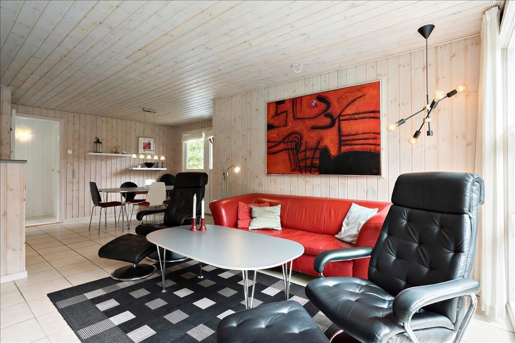 Das klassische Ferienhaus leuchtet mit seiner roten Fassade und den weißen Fensterrahmen schön zwischen all dem Grün, das es umgibt. Im Hausinneren trafst du in bester Ferienhausmanier auf helle Holzvertäfelungen an den Wänden und einen Kaminofen. Zahlreiche Fenster gewähren einen guten Tageslichteinfall.