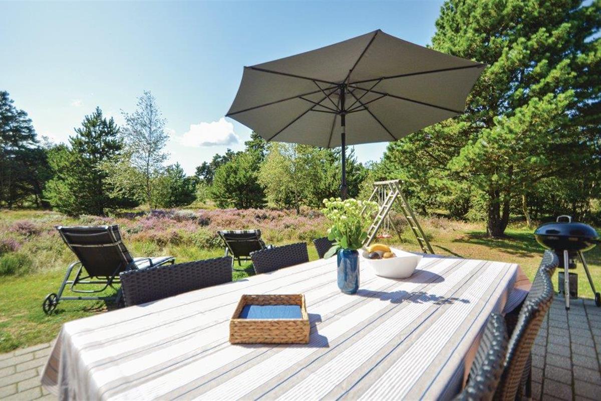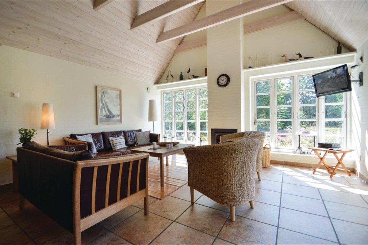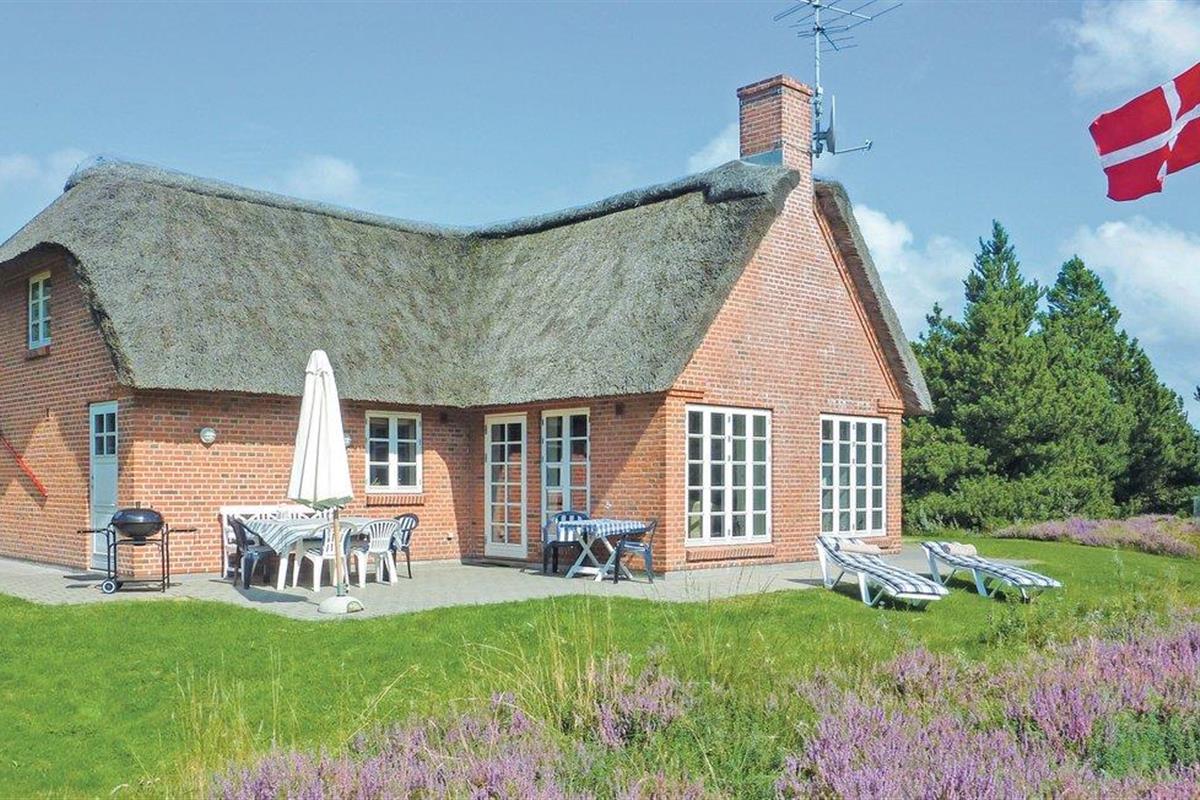 Dit mooie rietgedekte vakantiehuis ligt op een groot perceel met gazon, heide en bomen. Binnen wordt het interieur gedomineerd door klassieke meubels en maritieme details. De prachtige keuken-woonkamer heeft een open daknok, wat een ruimtelijk gevoel geeft. Vanuit de twee galerijen, elk aan een kant van de keuken, kijkt u de woonkamer in.