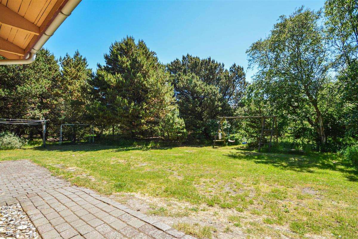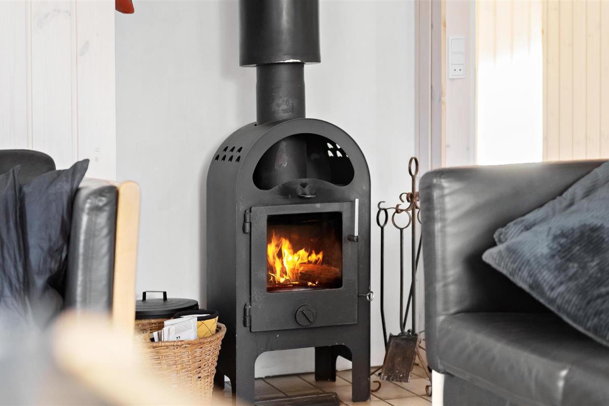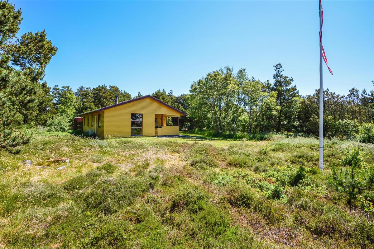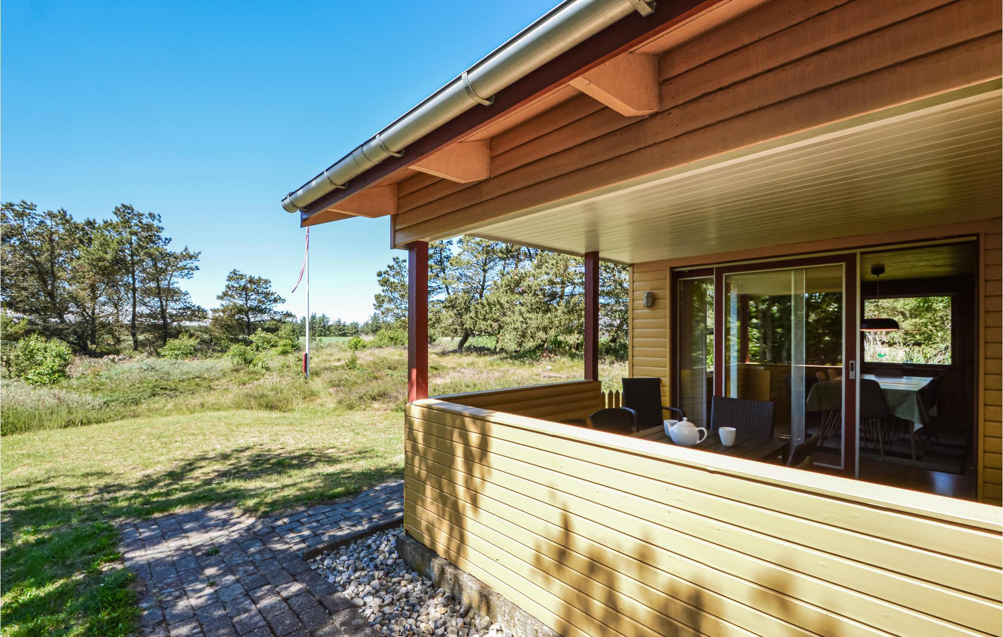 Gezellig houten vakantiehuis nabij Sønderstrand met terras, houtkachel en speelvoorzieningen op natuurgrond.