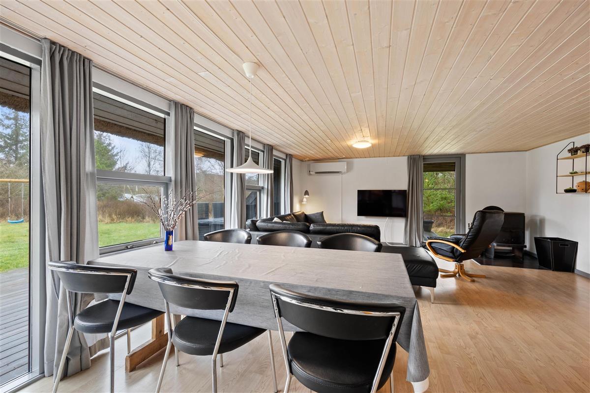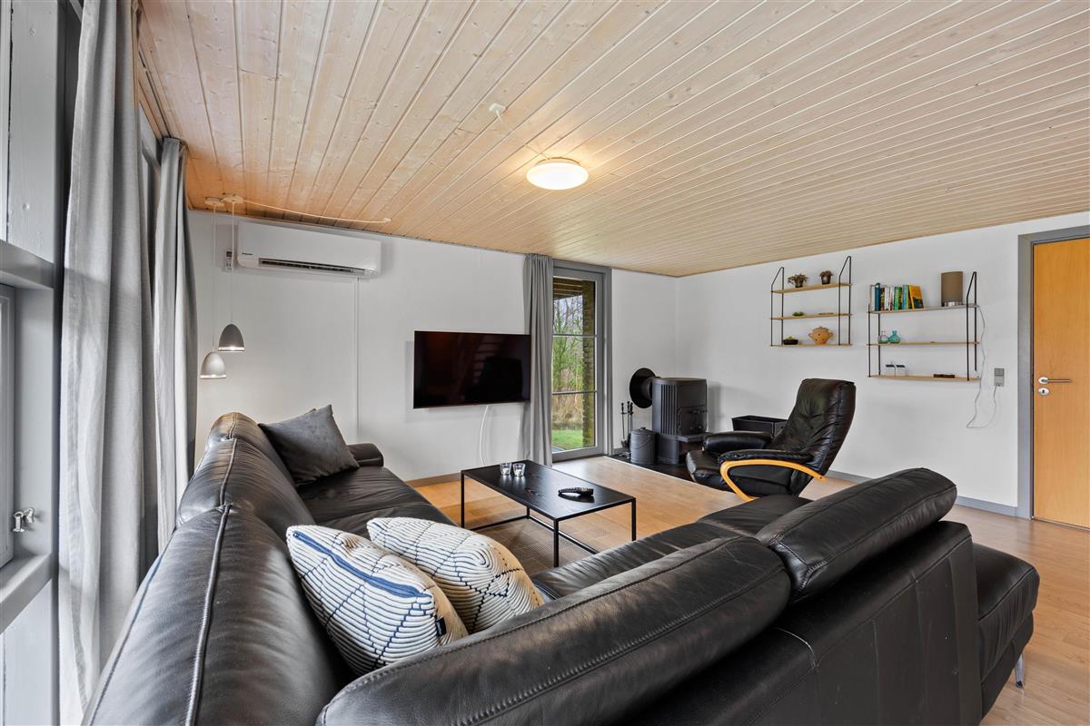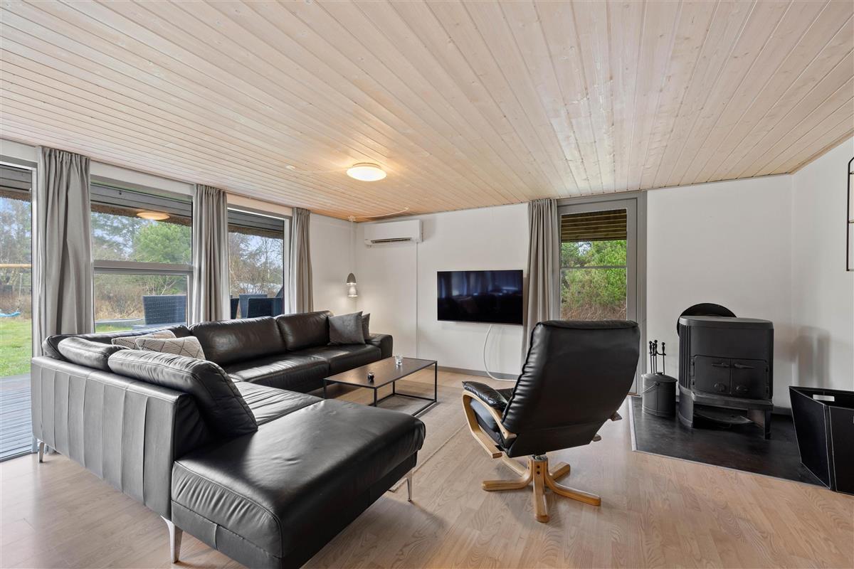 The lounge features a wood-burning stove that not only provides warmth but creates a lovely atmosphere. There's also an energy-efficient heat pump available for your comfort.