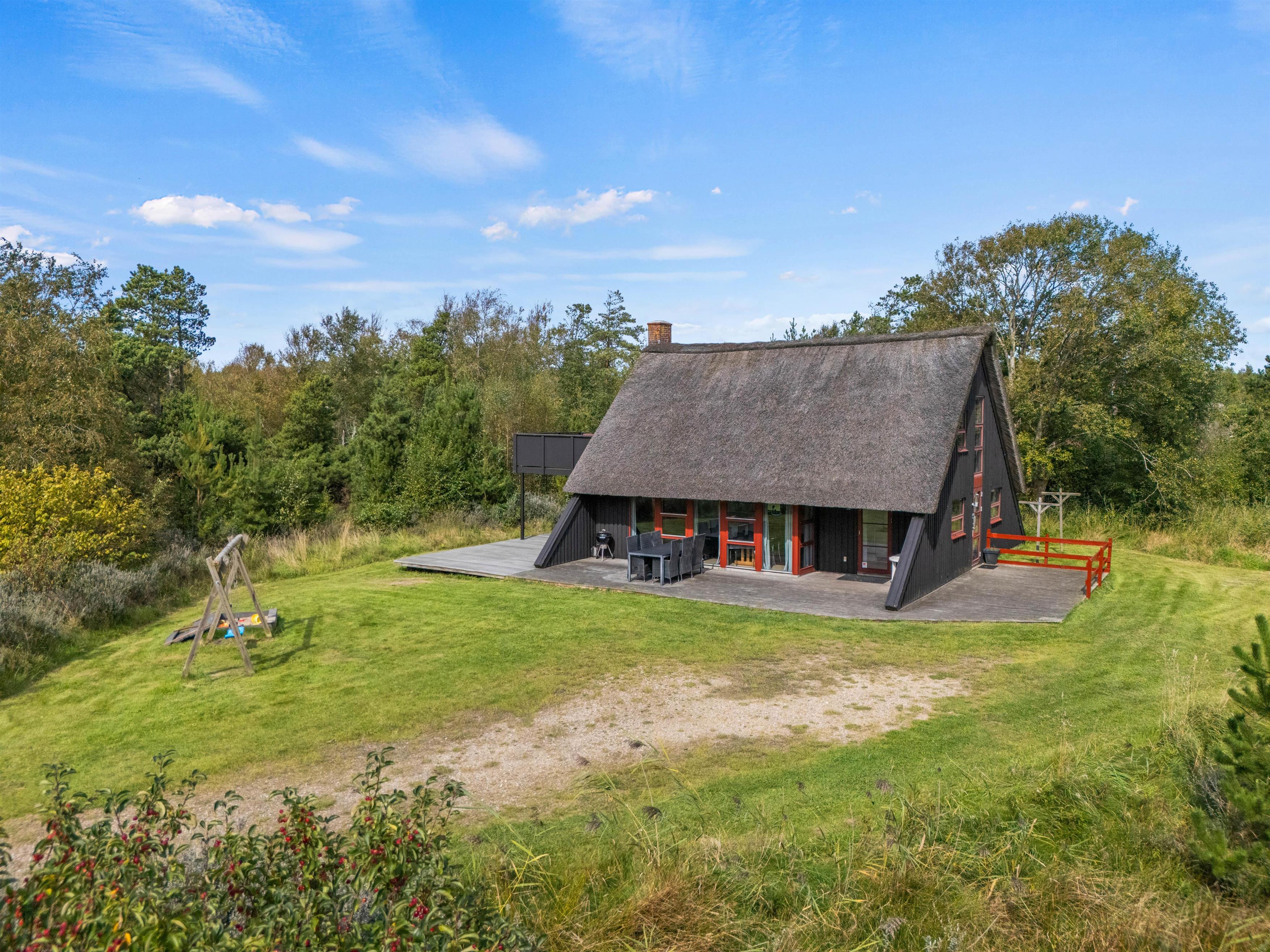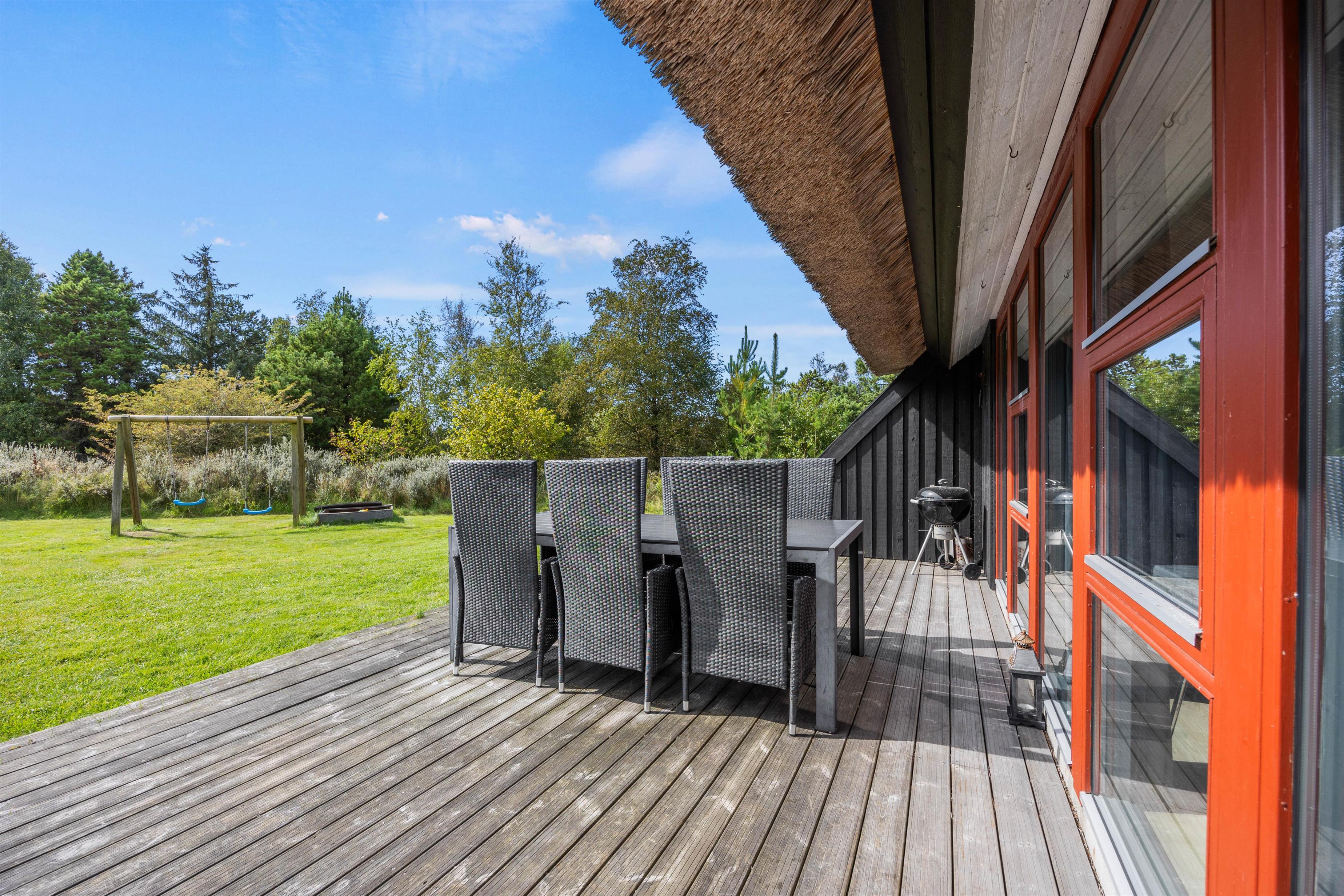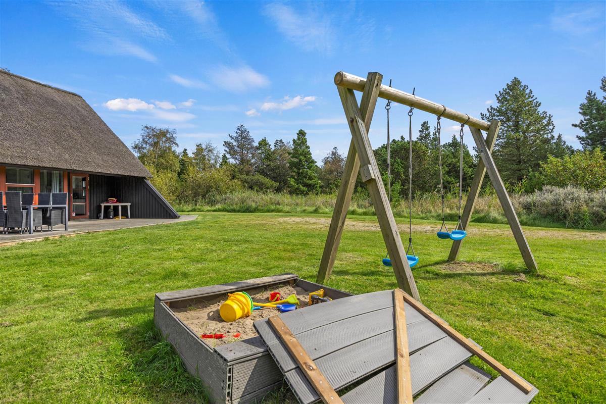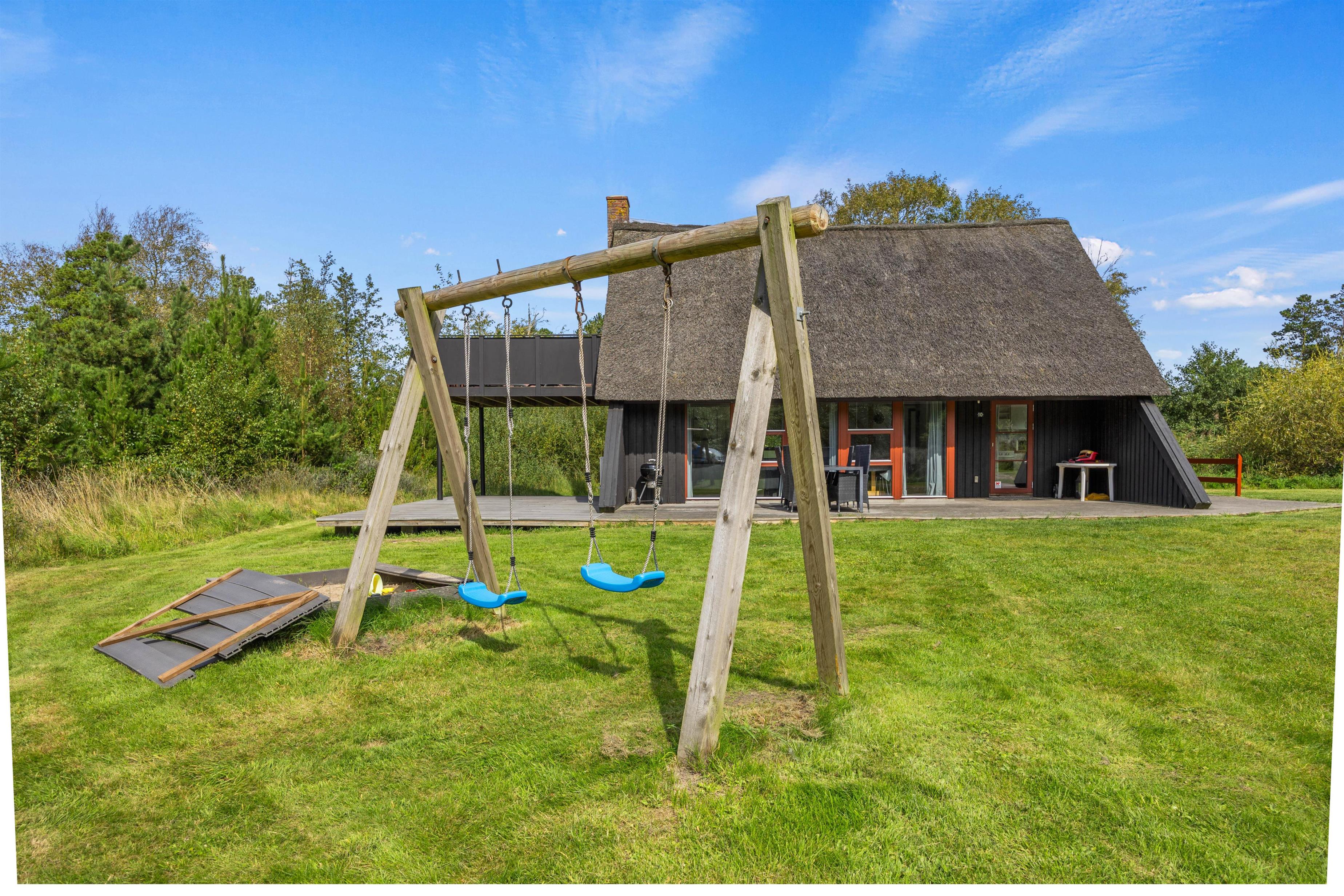 The holiday home sits within a 2,500-square-metre natural plot, offering children plenty of space to play. They'll love the sandbox and swings. Garden furniture and sun loungers are provided, perfect for enjoying afternoon coffee while looking out over the greenery as the little ones play in the garden.