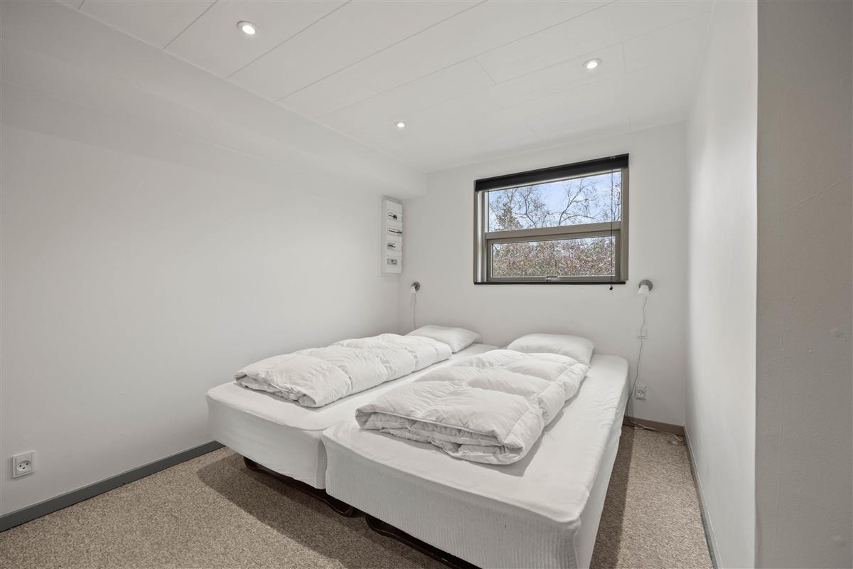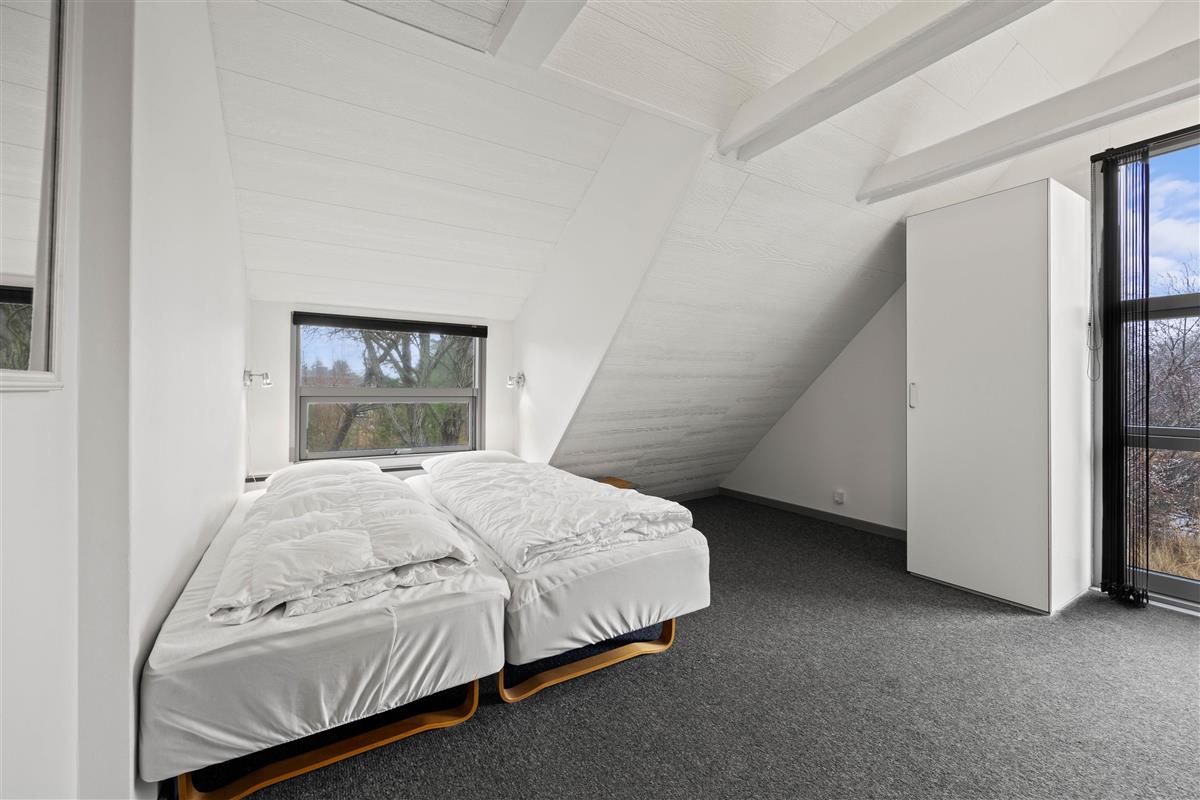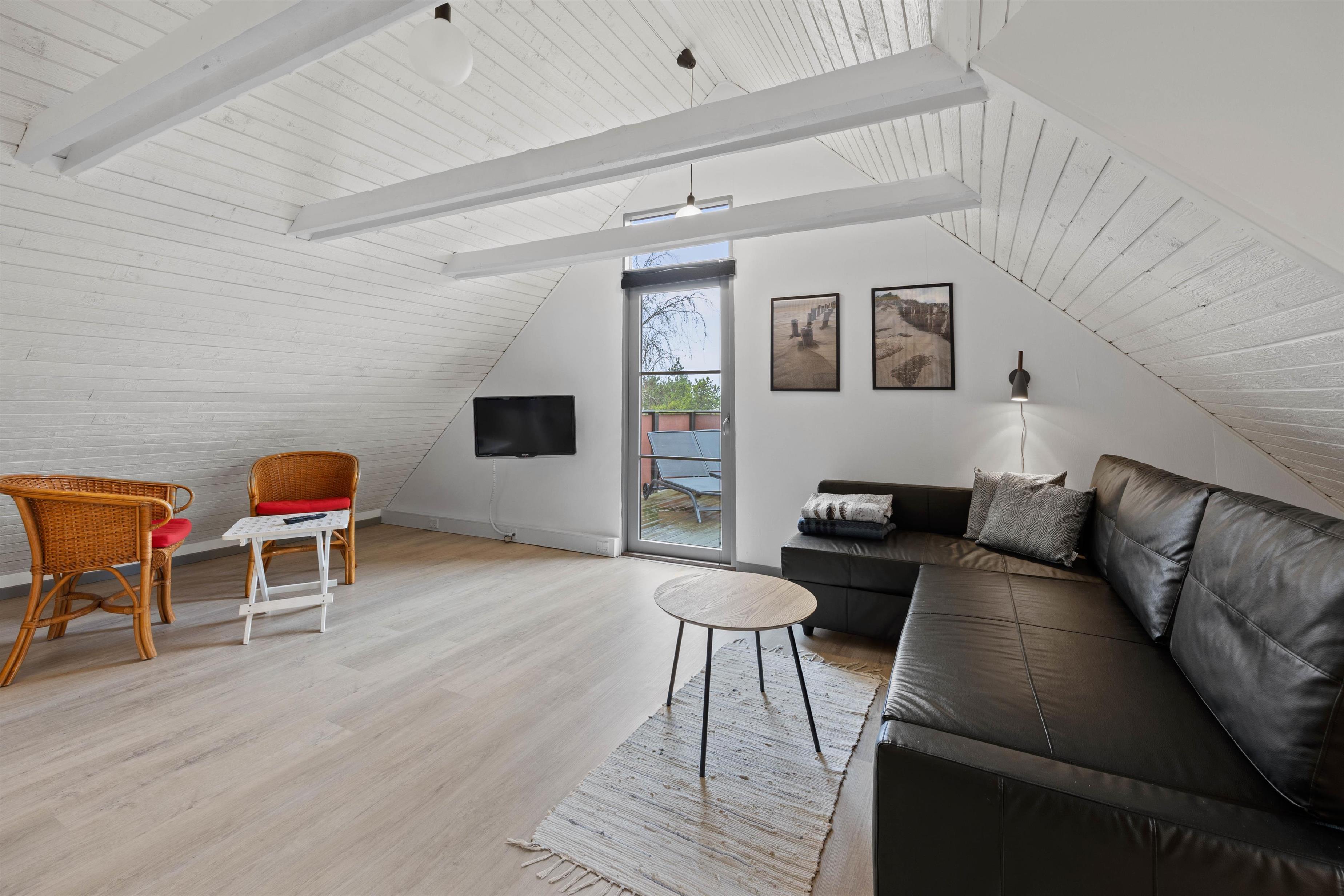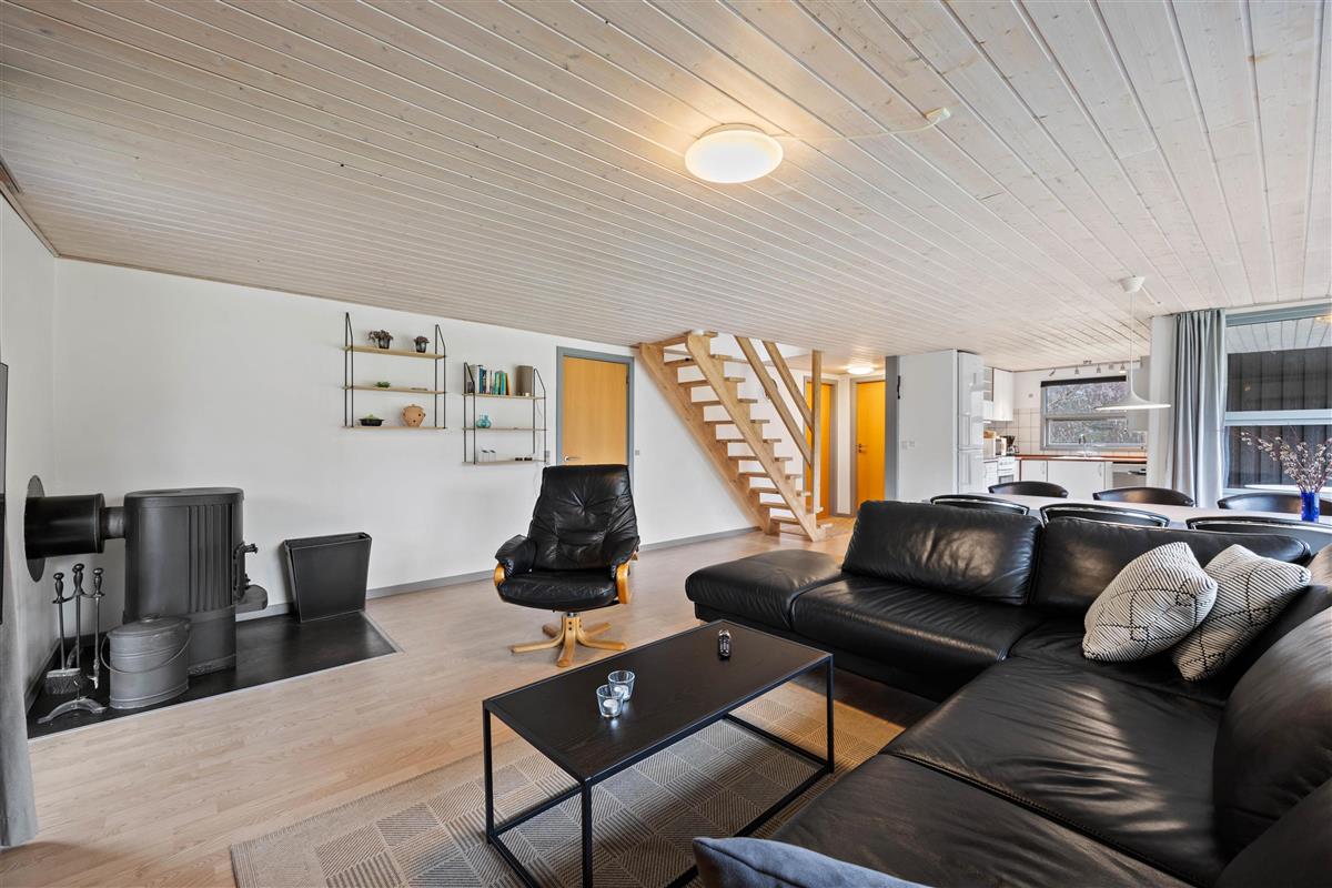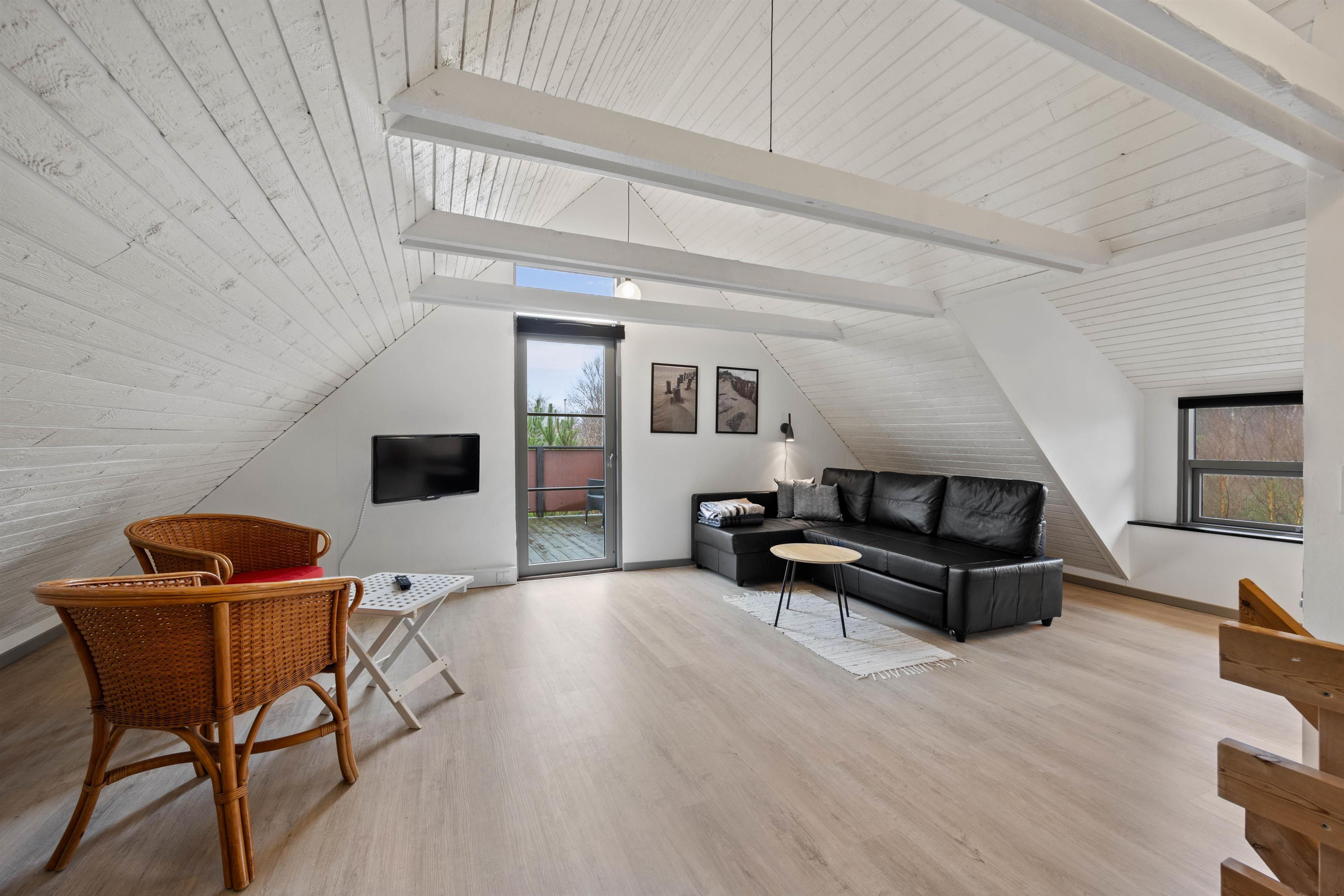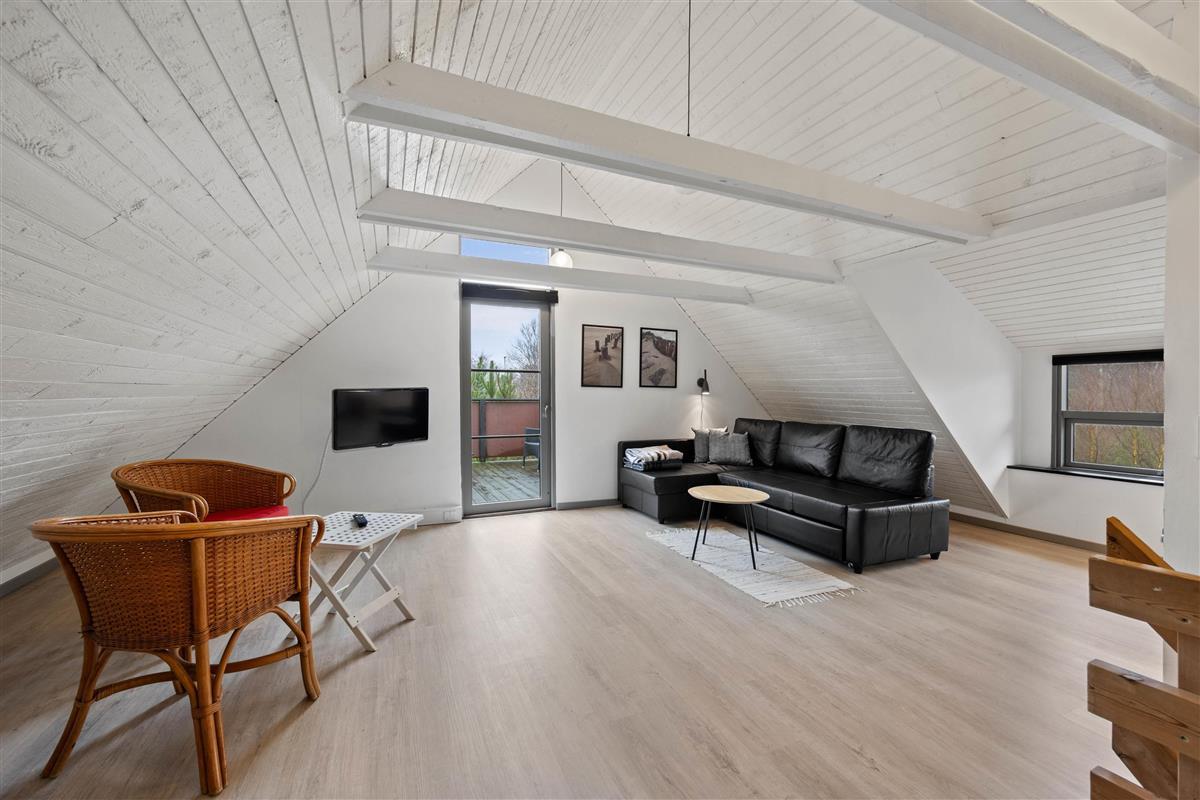 The first floor offers an additional living space with comfortable sofas for relaxation. This room provides access to a large balcony where you can enjoy the fresh North Sea air and warm sunshine. The remaining two bedrooms are also located on this floor. One has a double bed, while the other features a bed measuring 140x200cm. A guest toilet helps prevent queuing.