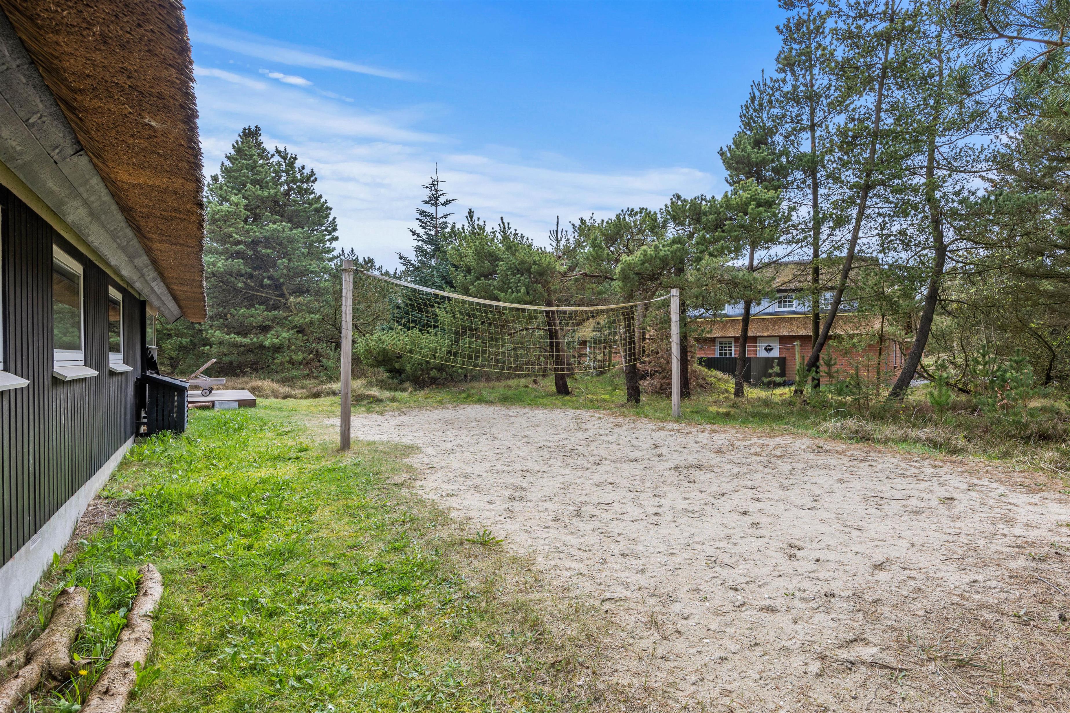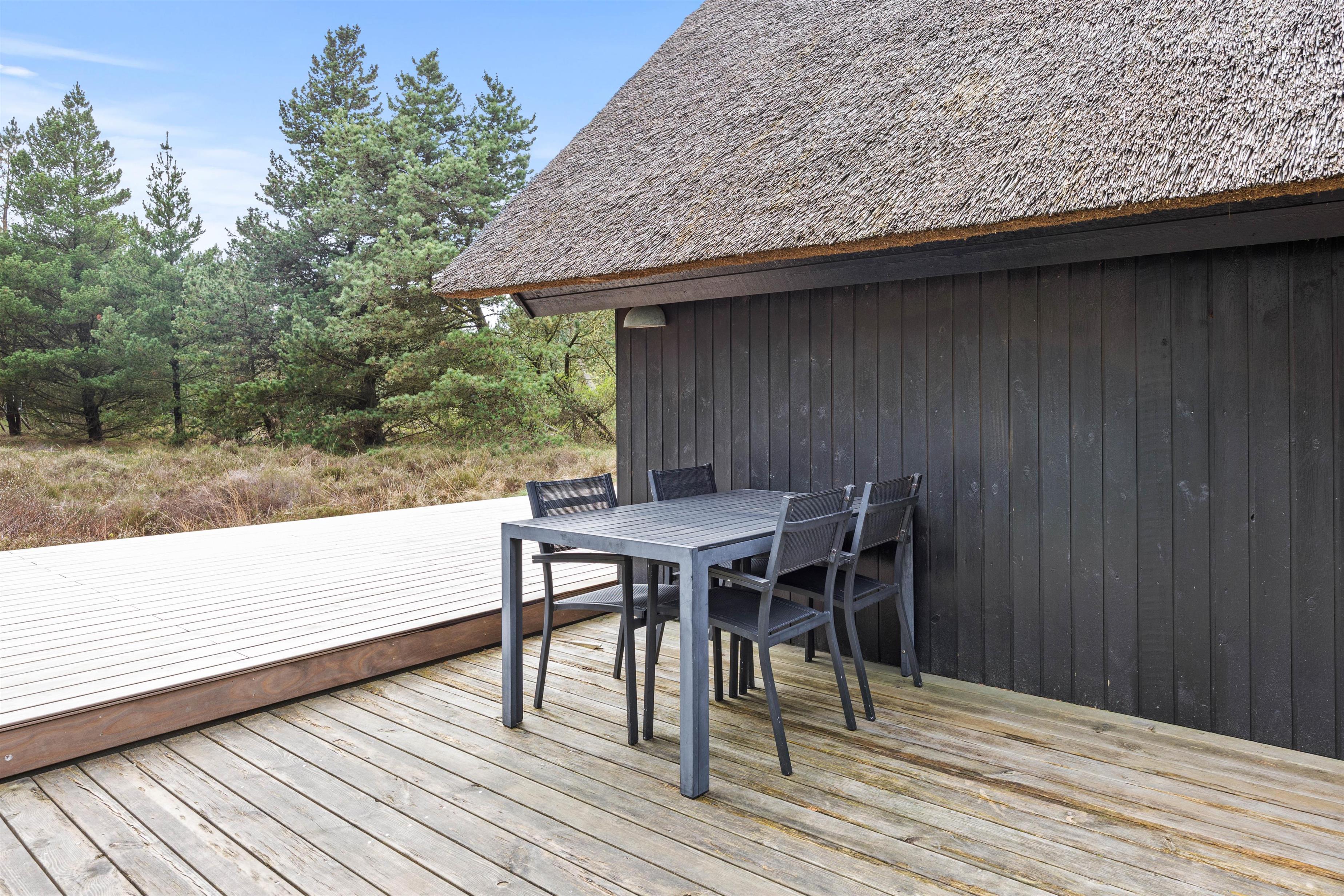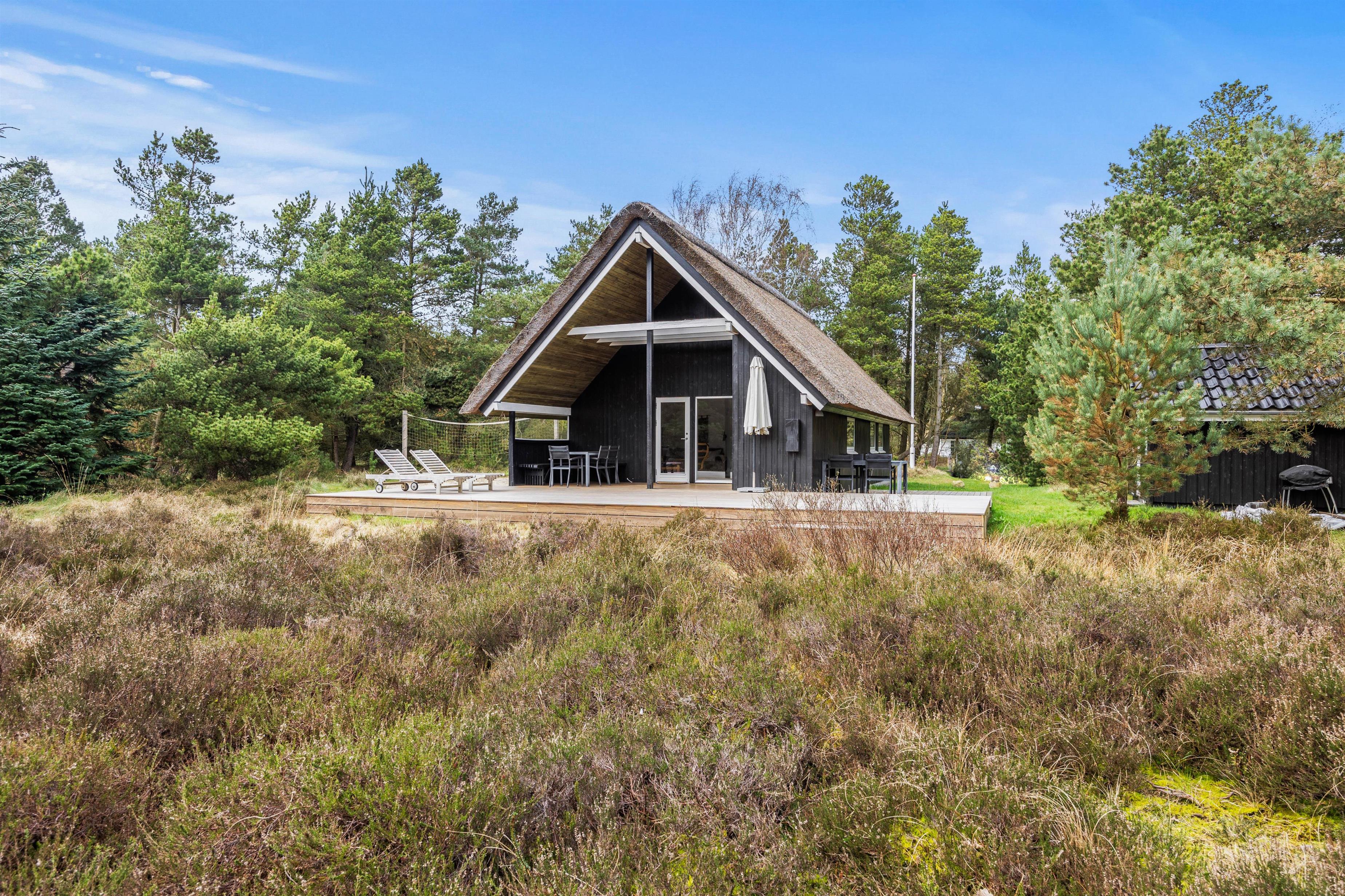 Located at Im Rylen 7, close to Sønderstrand, you'll find this cosy thatched holiday home suitable for 4 people. Renovated in 2022, the holiday home offers 3 bedrooms and welcomes one dog. Set within a 2,500-square-metre natural plot with tall pine trees, you can enjoy a peaceful North Sea holiday on Rømø. The terrace is partially open and partially covered, allowing you to spend plenty of time outdoors regardless of the weather. The holiday home offers free access to an induction hob, washing machine, tumble dryer, energy-efficient heat pump and gas barbecue.