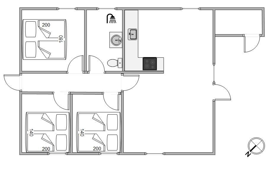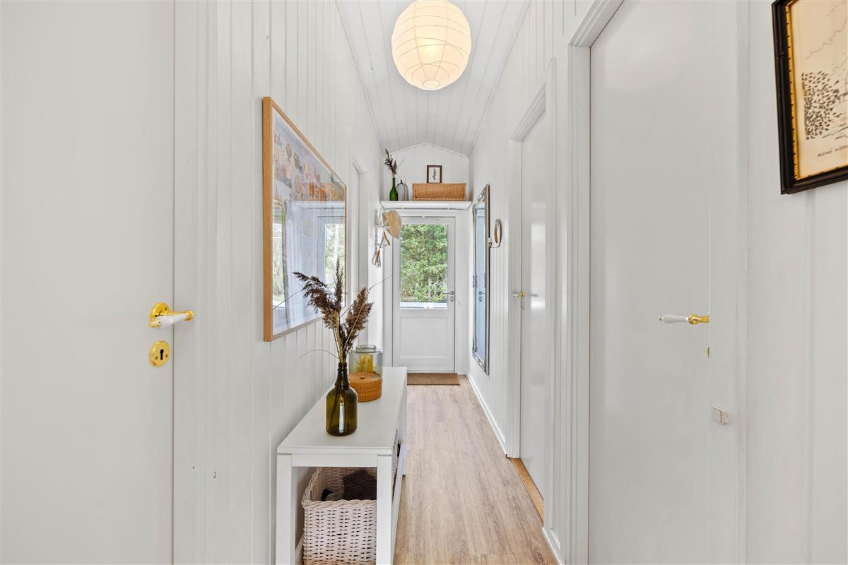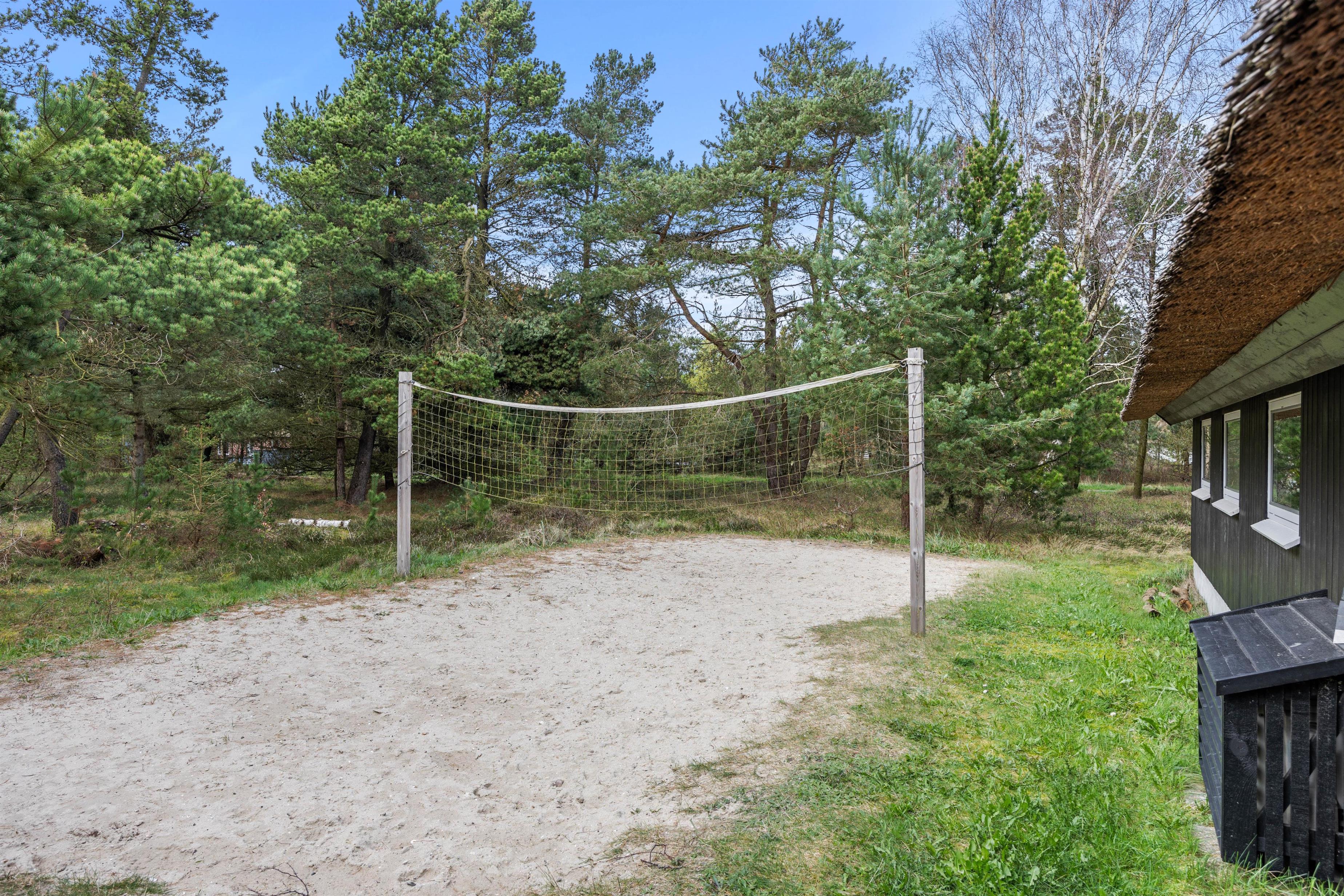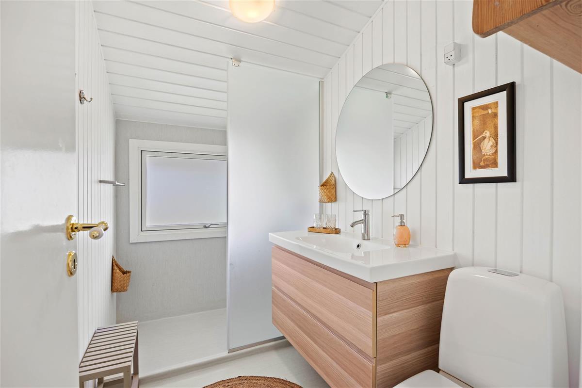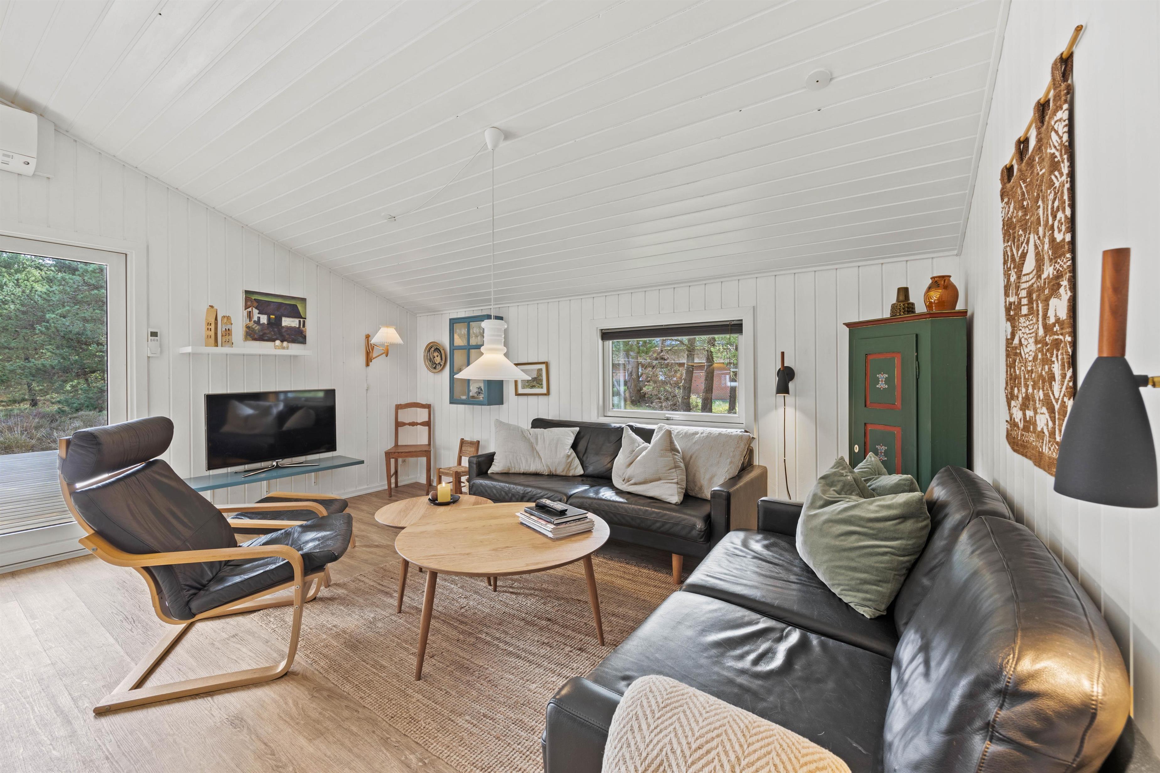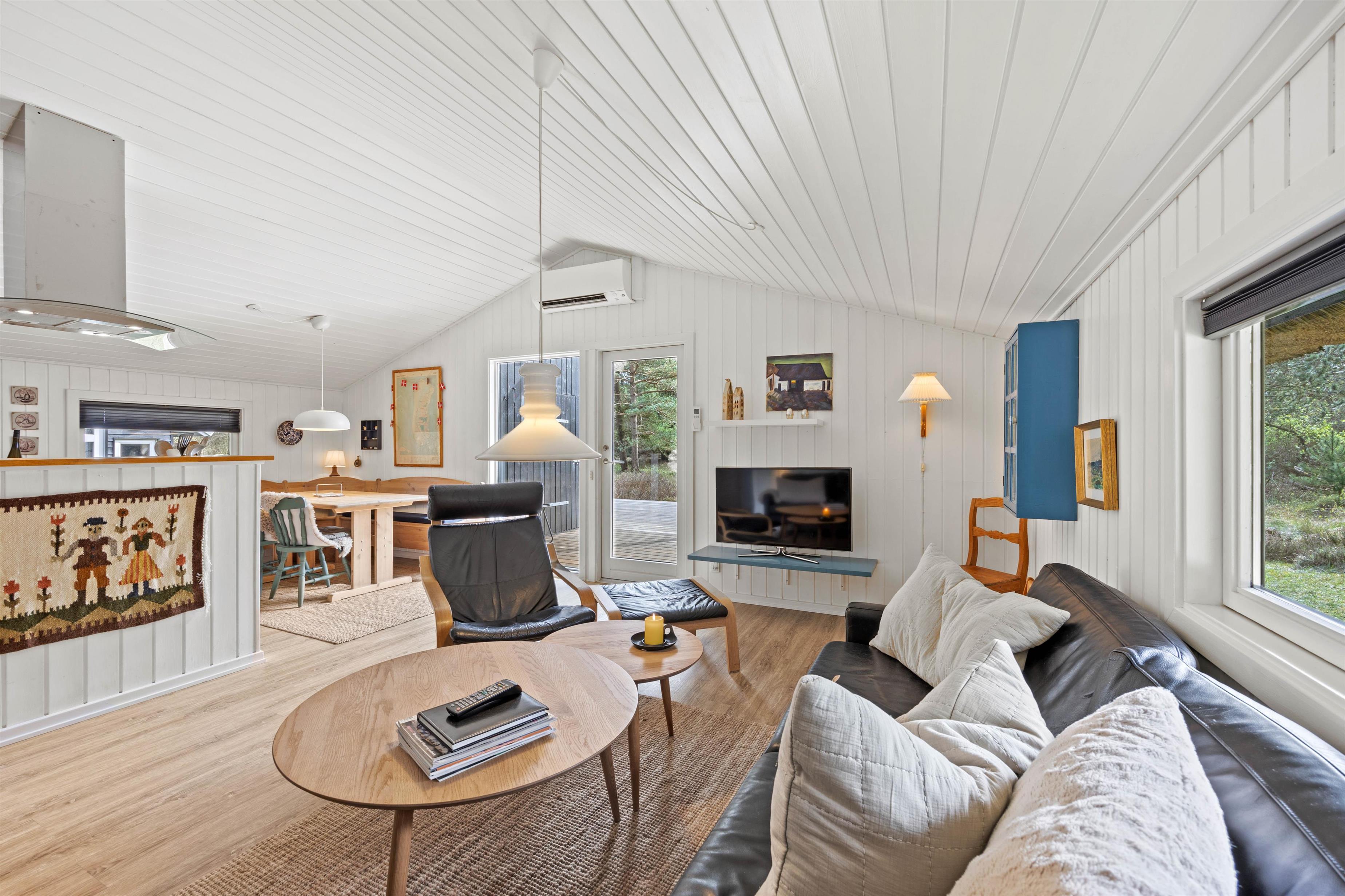 From the outside, Im Rylen 7 near Sønderstrand immediately appeals with its classic thatched roof, wooden terrace and mature pine trees. The holiday atmosphere is apparent as soon as you step inside. Light-coloured floors and white wood-panelled walls and ceilings create a pleasant, airy atmosphere. Relax on the sofas in the living room or find a quiet corner with a good book. You can also watch films using Chromecast. The open-plan kitchen contains everything needed to prepare delicious meals, which you can serve at the welcoming dining table. The holiday home features a bathroom with shower cubicle, along with a washing machine and tumble dryer to quickly refresh your clothes and towels. The cost-effective heat pump maintains comfortable temperatures throughout the holiday home.