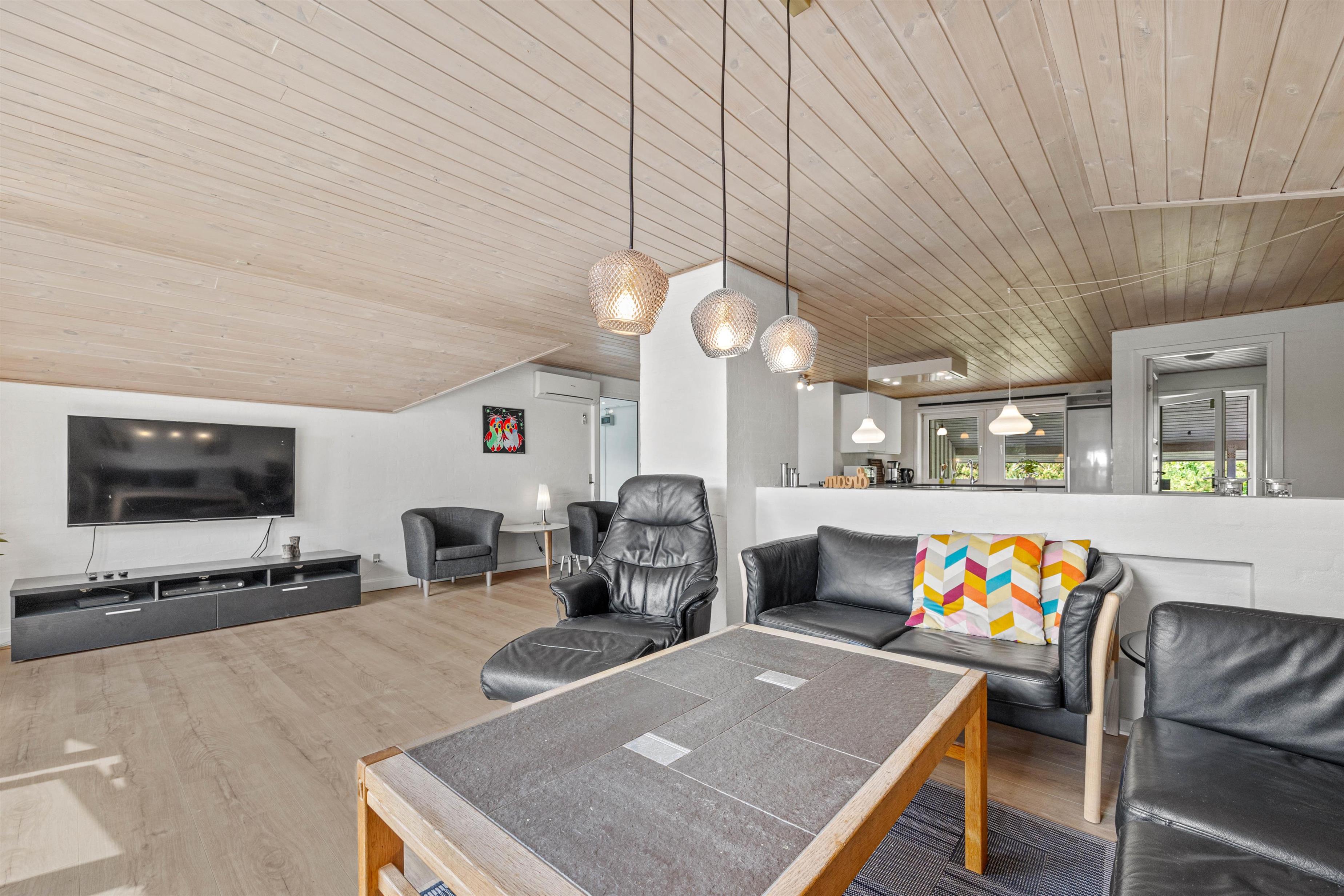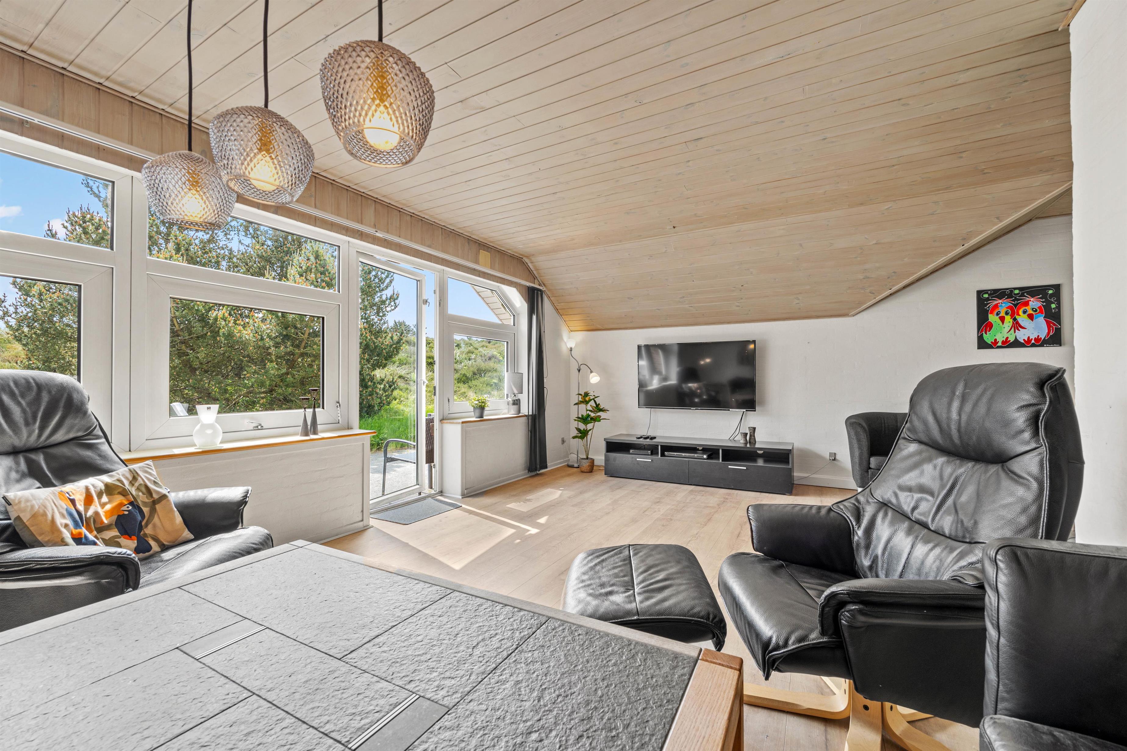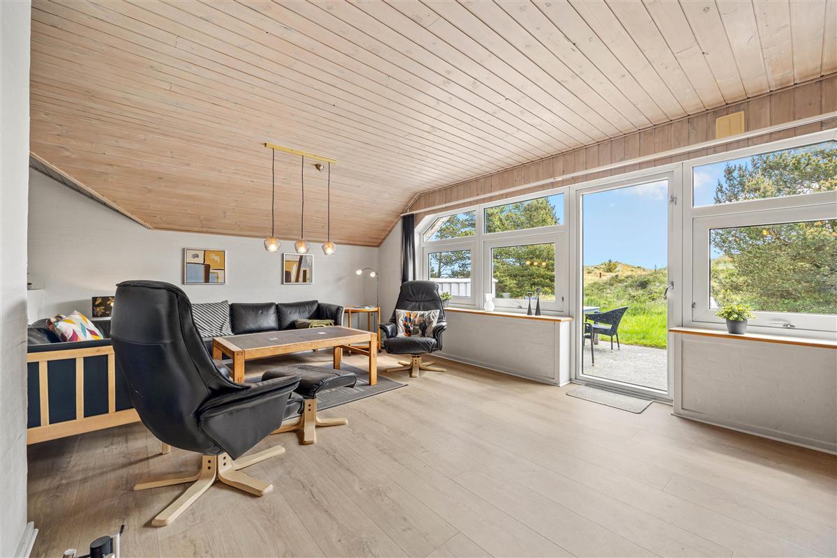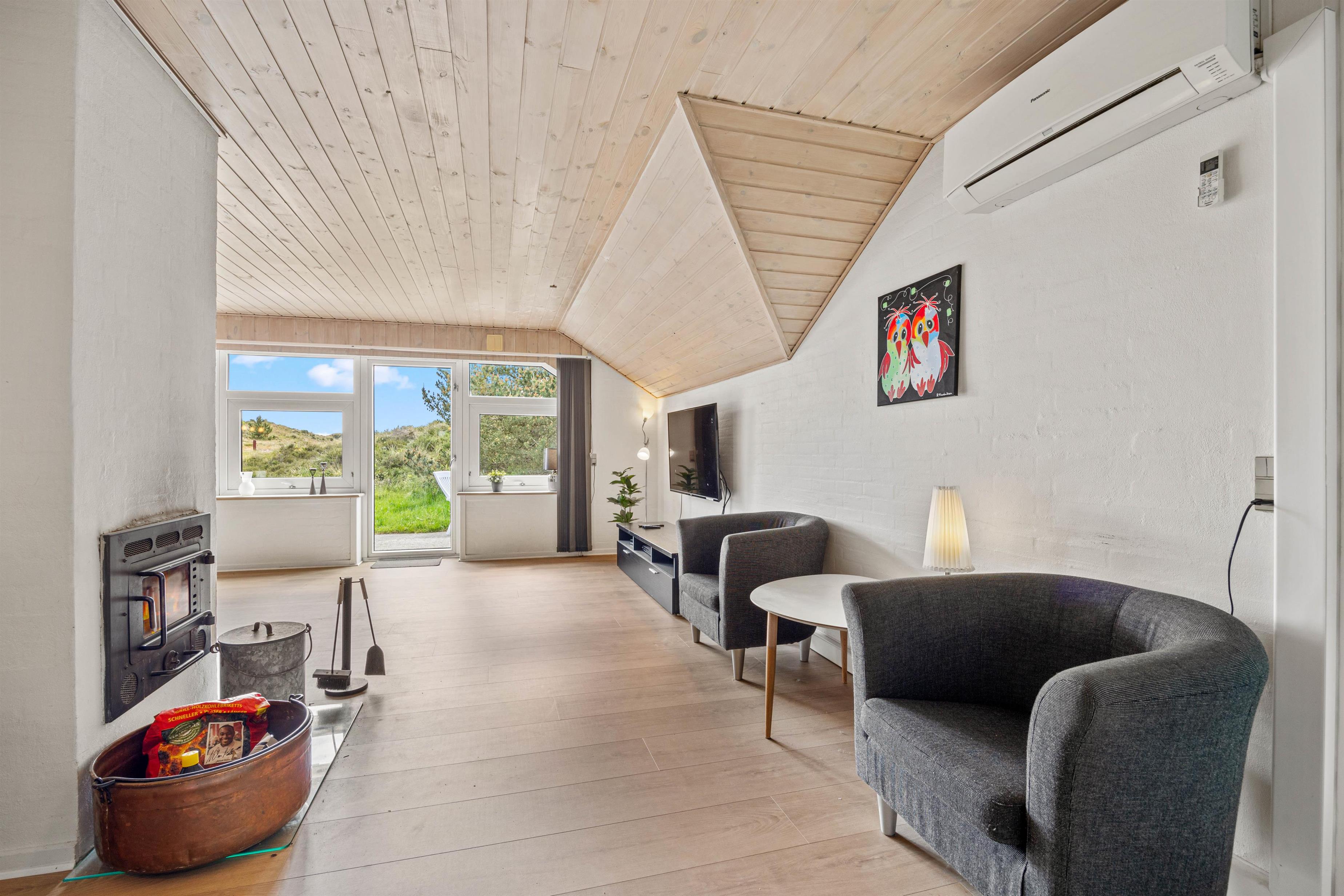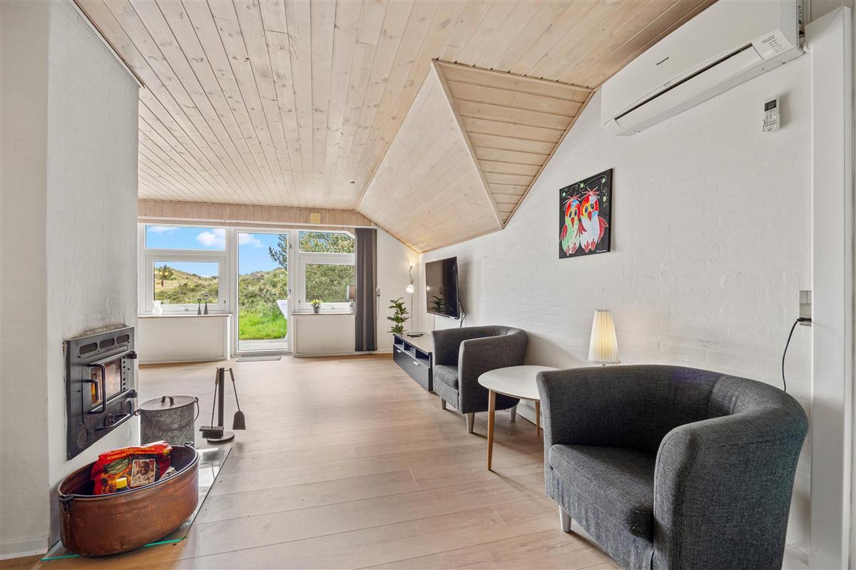 The built-in fireplace adds extra cosiness with its crackling wood, while the large windows flood the living space with natural light. An energy-efficient heat pump is available when needed.