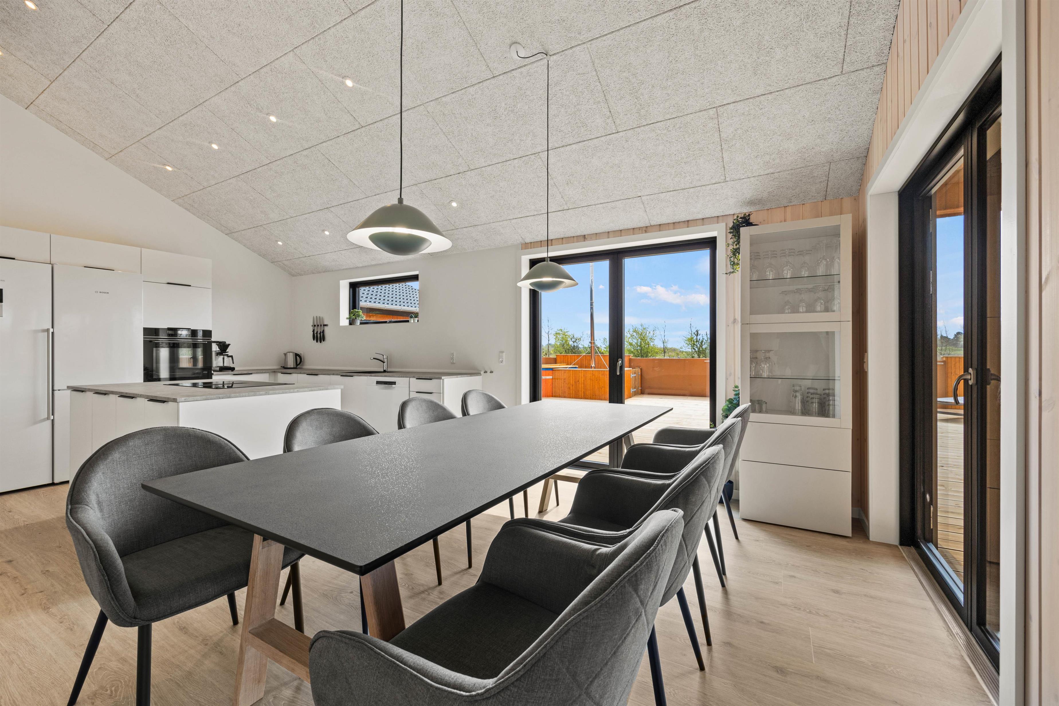 At Vestergårdsvænget 10, you'll feel the holiday atmosphere as soon as you step through the door. The bright floors, walls and high ceilings create a beautiful atmosphere for spending time together. Relax on the sofa and enjoy the views of the terrace or read your favourite book. The dining table is perfect for both game nights and mealtimes.
