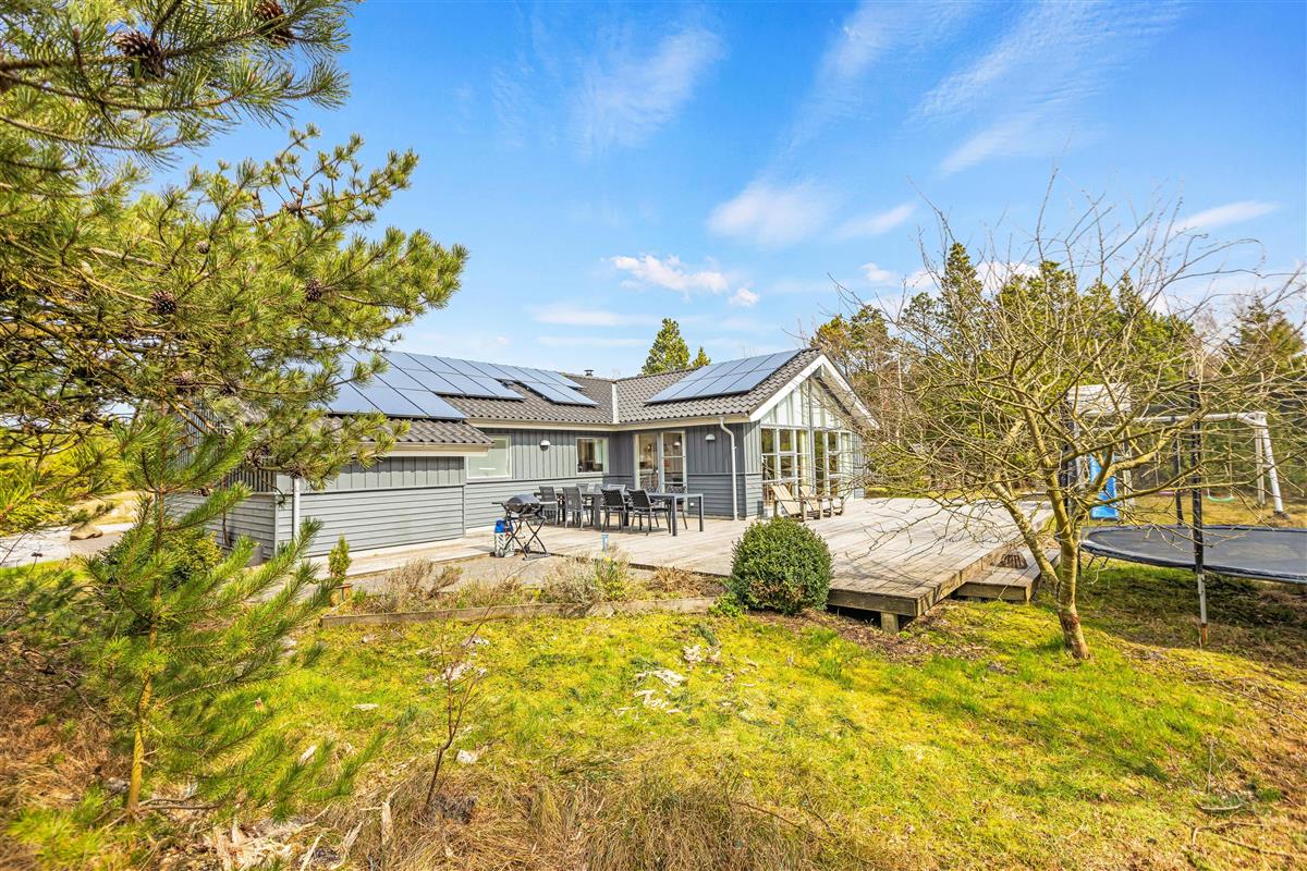 The 2,500-square-metre natural plot is surrounded by bushes and trees, offering excellent privacy. From the living area, you can access the large terrace with comfortable furniture for relaxing in the sun. While you unwind with coffee and cake, children can explore the grounds, enjoying the swings, slides, and sandpit.
