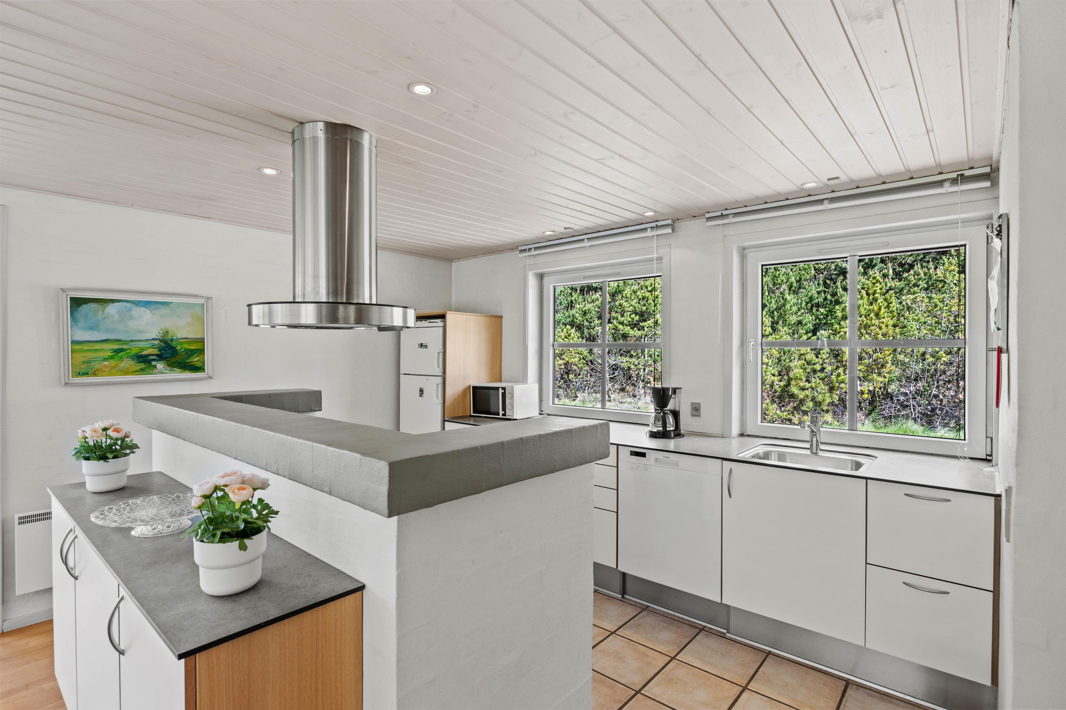 Das helle Wohnzimmer fungiert als Herzstück des Ferienhauses, große Fensterpartien lassen das wechselnde Licht der Natur herein und laden zu stillen Morgenstunden mit Kaffee oder ruhigen Abenden mit Familiengemütlichkeit ein. Hier könnt Ihr Euch bei Brettspielen oder einem guten Buch mit Aussicht auf den Garten versammeln, während der Kaminofen im Wohnzimmer für Wärme und wohlige Stimmung sorgt, wenn das Wetter kühl ist. Die private Sauna lädt ebenfalls zur Entspannung nach einem aktiven Tag ein. Die angrenzende Küche ist voll ausgestattet mit Geschirrspüler, Mikrowelle, Kühlschrank mit integriertem Gefrierfach und Elektroherd mit Backofen, sodass Ihr problemlos köstliche Mahlzeiten zubereiten könnt, die Ihr am Abend in der angenehmen Ruhe genießen könnt.