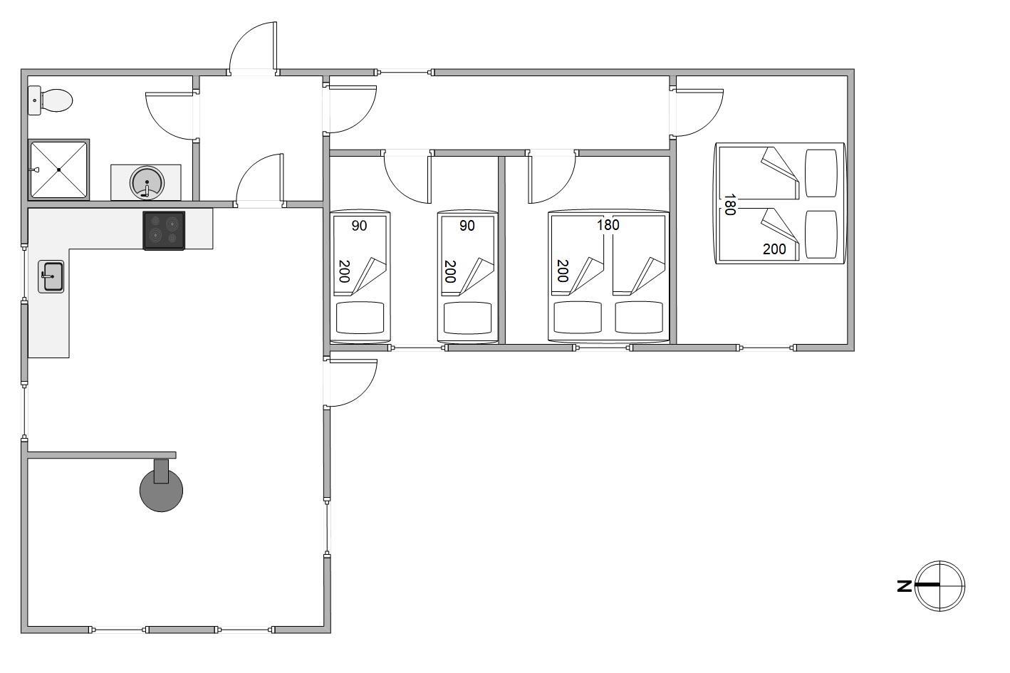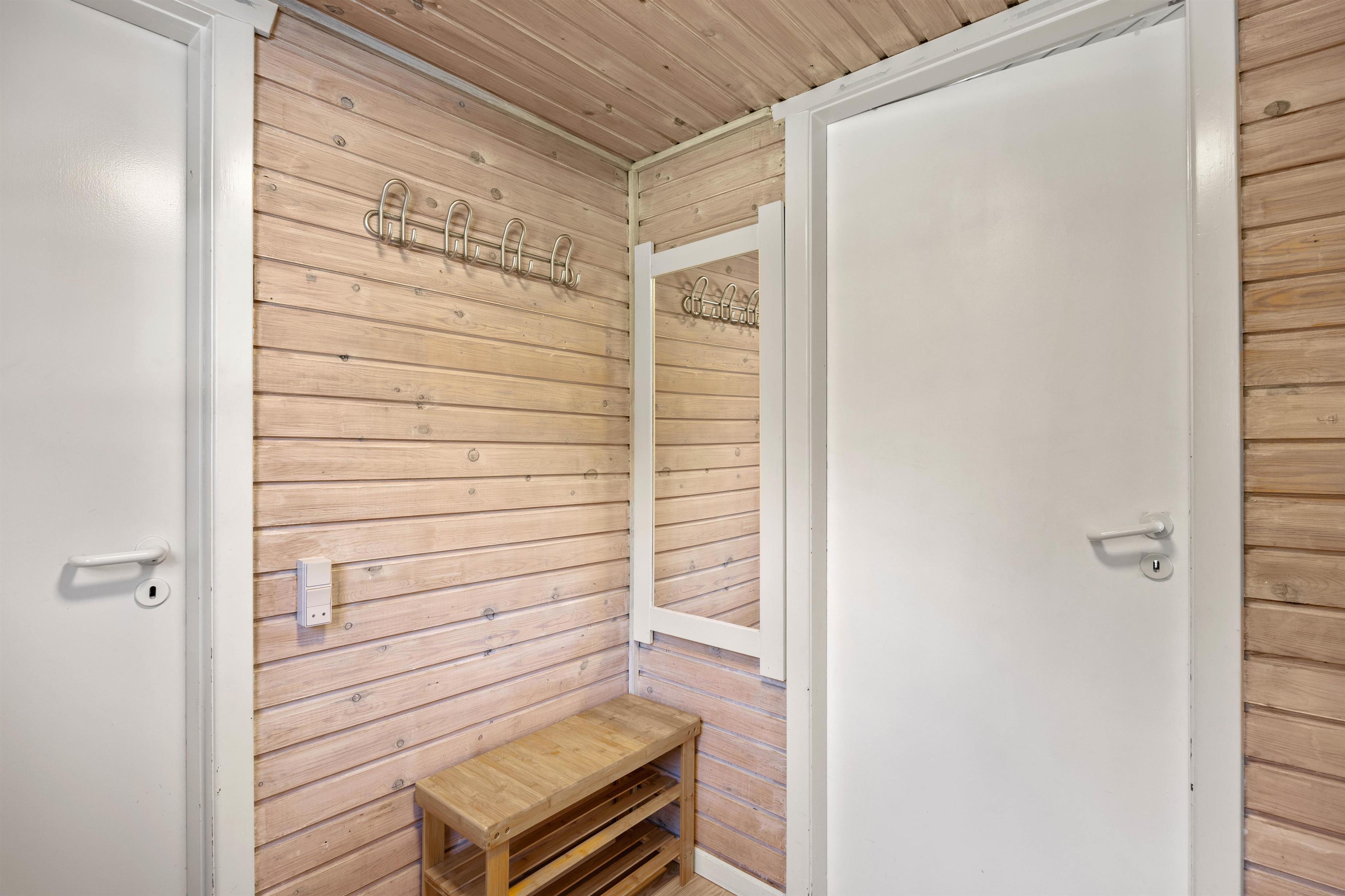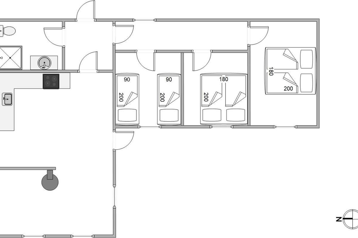 This holiday home features a practical layout dividing living and sleeping areas. The three bedrooms are adjacent to each other, comprising two rooms with double beds and one bedroom with twin beds. You'll find perfect rest in these comfortable beds. The practical bathroom includes a shower, and the holiday home also features a washing machine.
