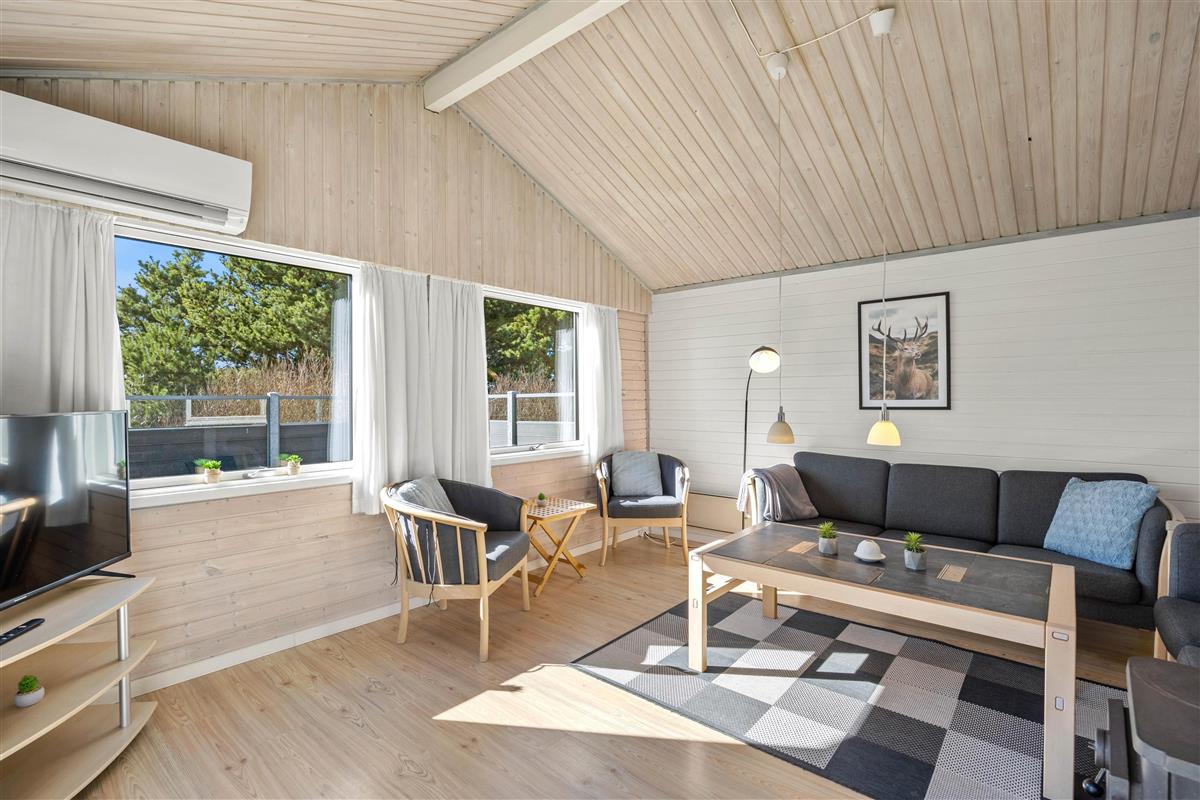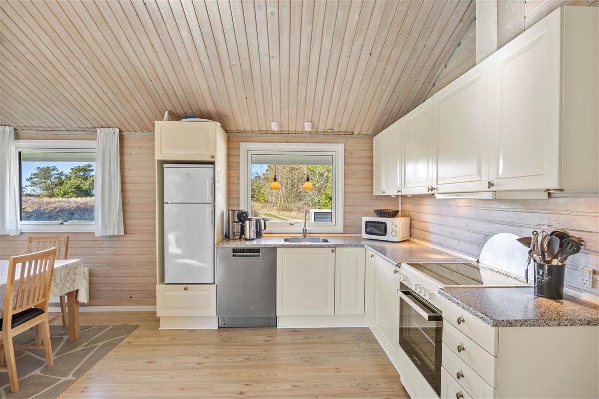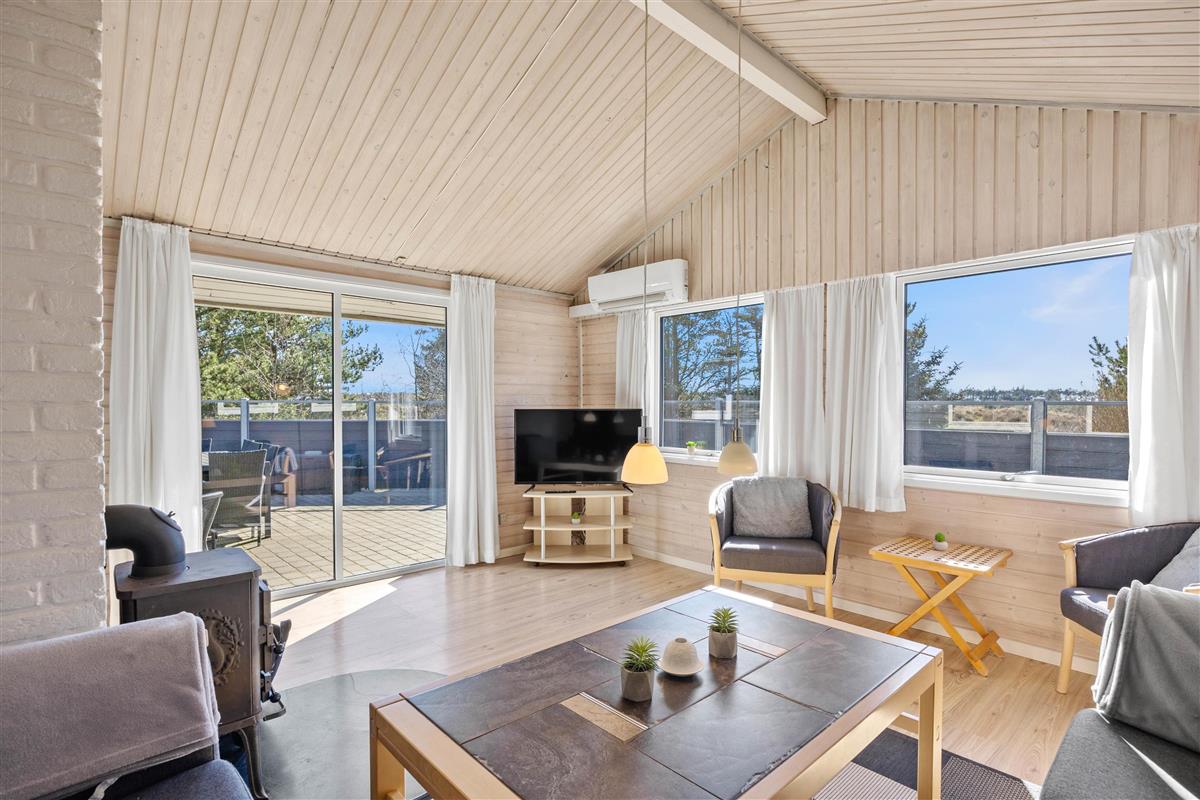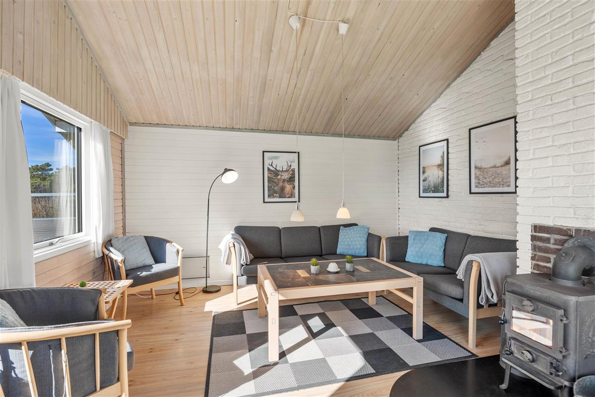 The spacious living area is beautifully bright thanks to numerous windows. The light wood finishing creates a cosy atmosphere. Here you can relax in front of the wood-burning stove, read a good book or watch a film together. In addition to the stove, this lovely holiday home is heated by an energy-efficient heat pump.