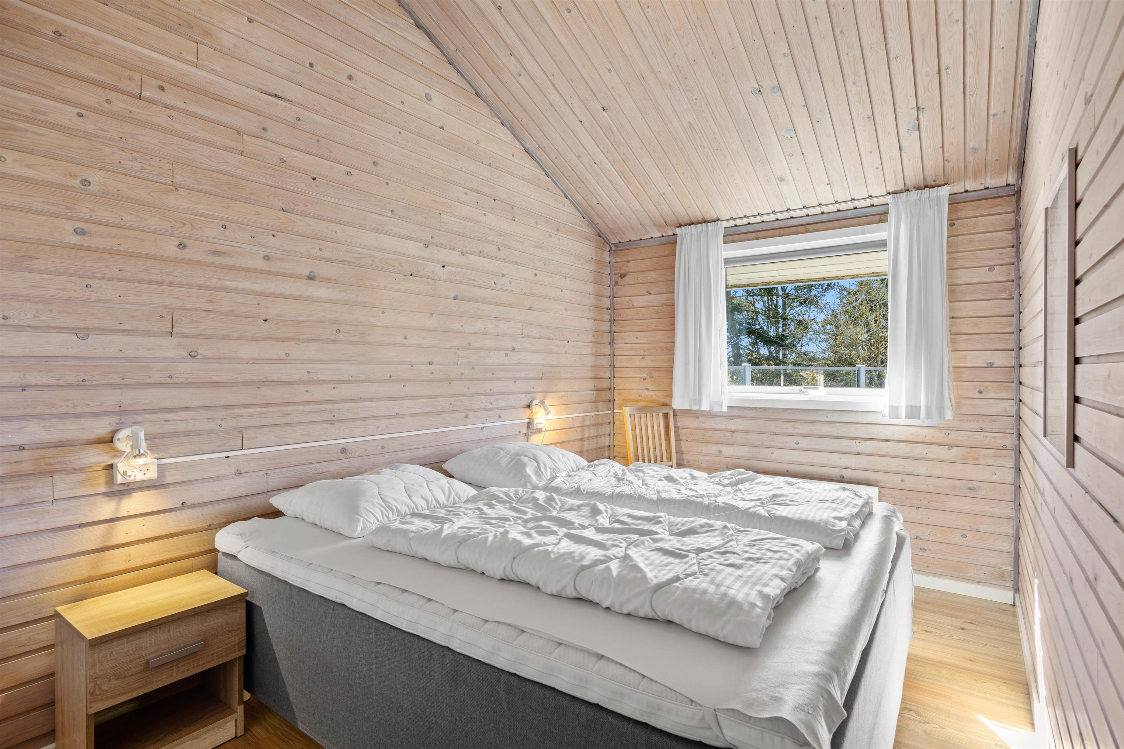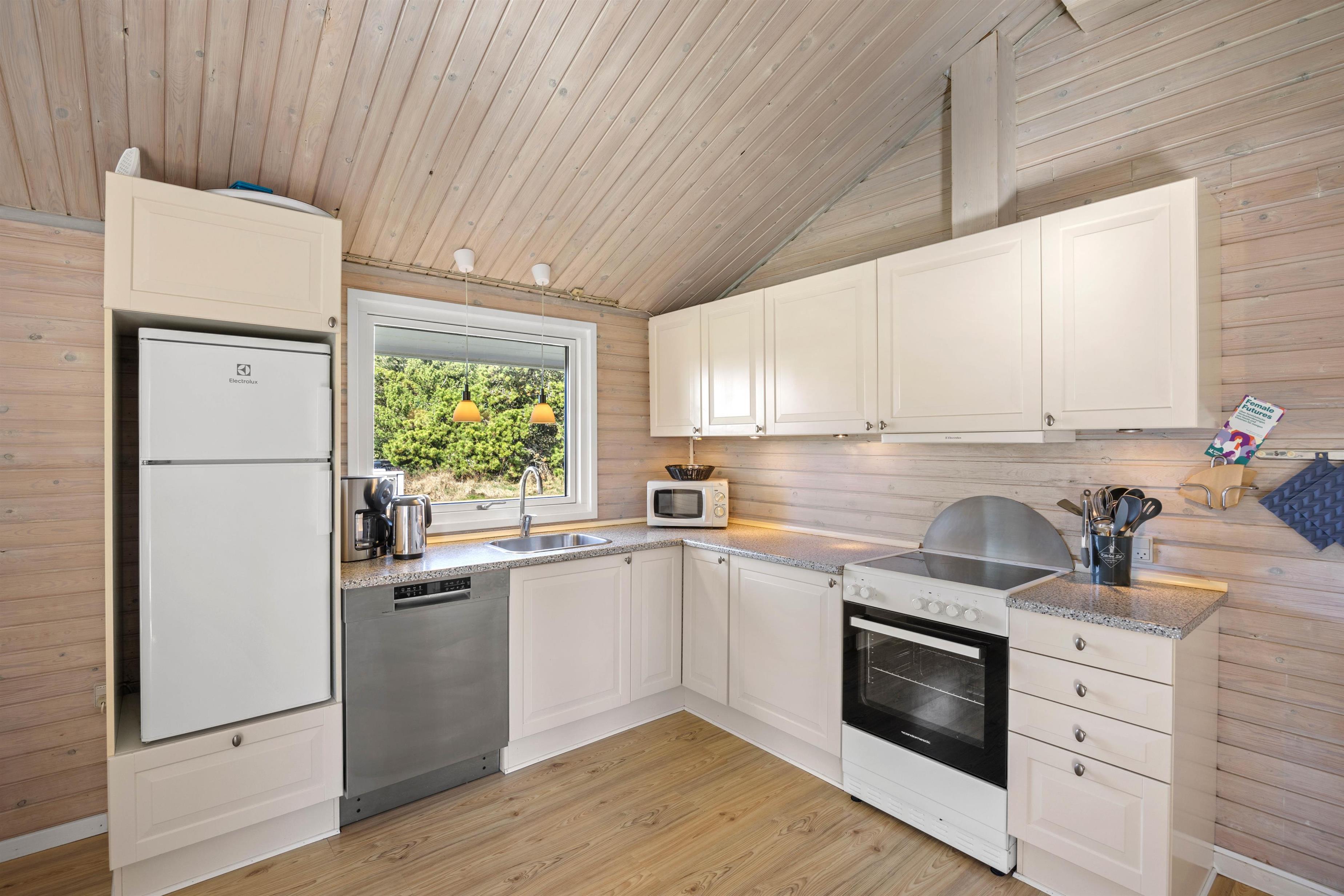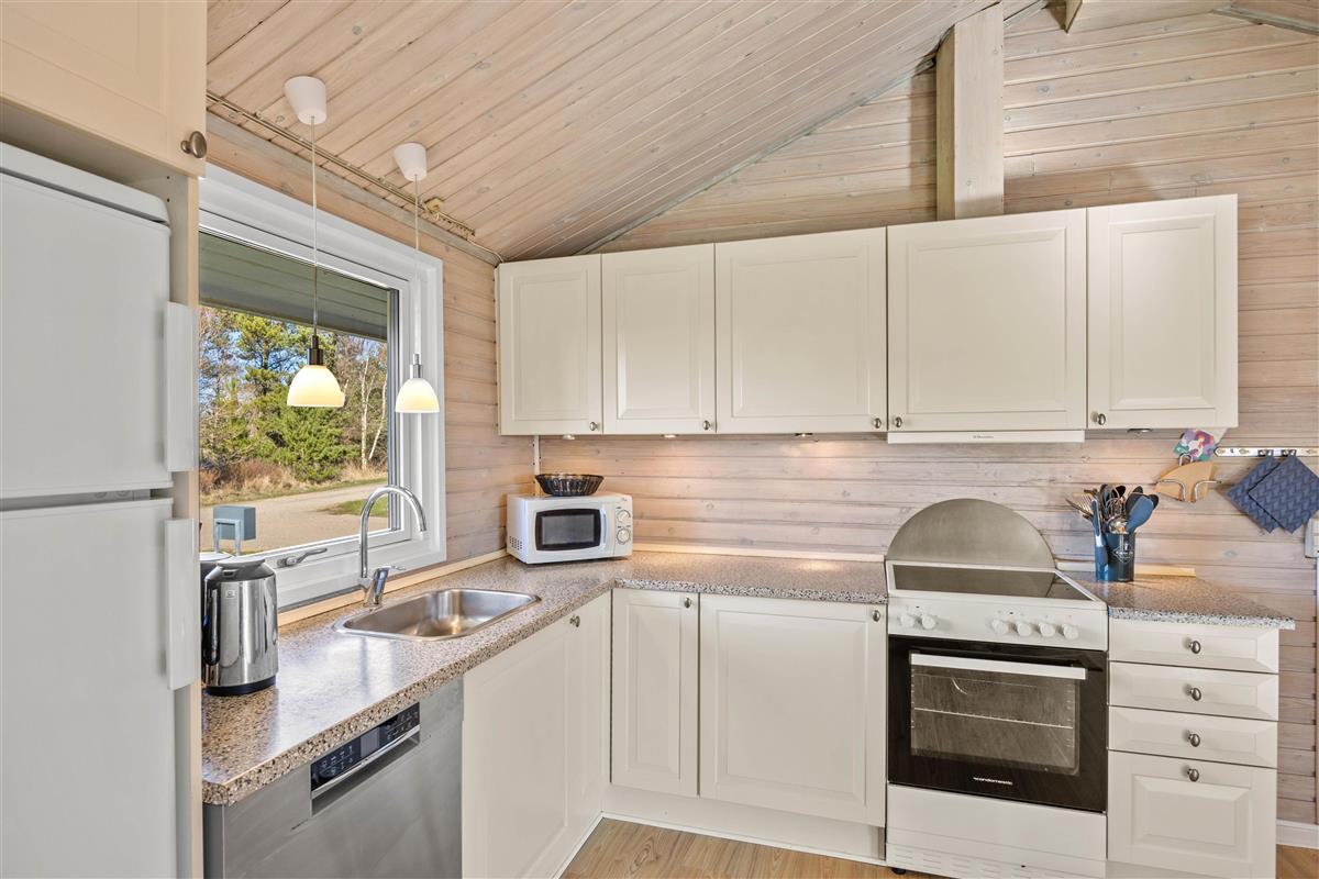The spacious living area is beautifully bright thanks to numerous windows. The light wood finishing creates a cosy atmosphere. Here you can relax in front of the wood-burning stove, read a good book or watch a film together. In addition to the stove, this lovely holiday home is heated by an energy-efficient heat pump.