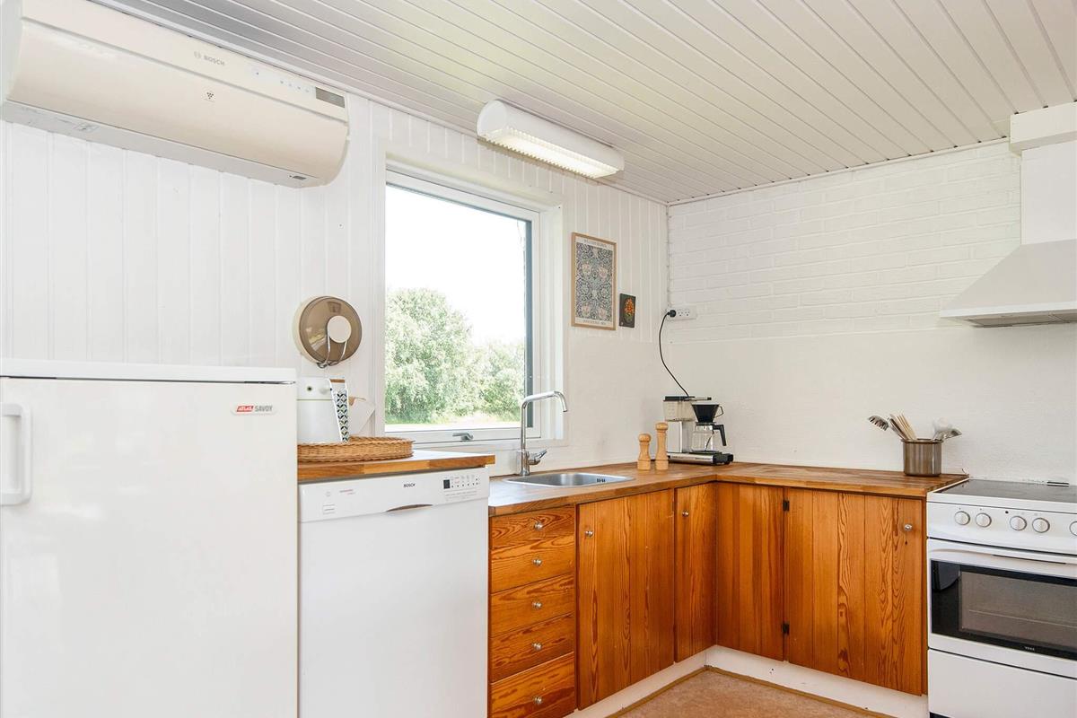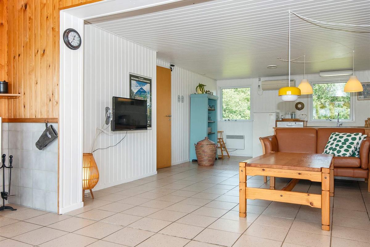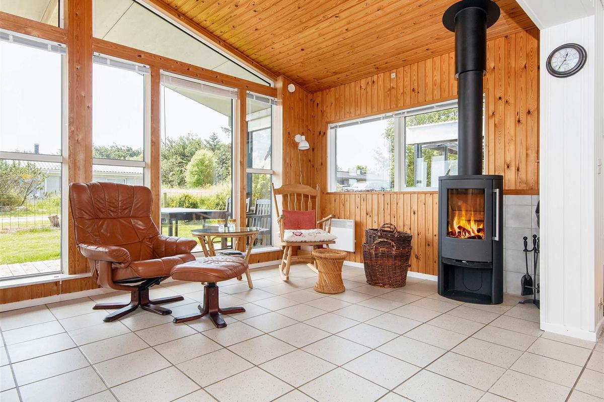 Das Ferienhaus ist gemütlich eingerichtet und hat eine gut ausgestattete Küche, die offen in den Wohnbereich integriert ist. Hier stehen auch eine Essecke sowie ein Kaminofen für kühlere Abende bereit. Vom Wohnzimmer aus haben Sie freien Ausblick in die umliegende Natur, die zur Entspannung beiträgt. Von diesem Raum aus haben Sie auch Zutritt zu einer windgeschützten, überdachten Südterrasse.