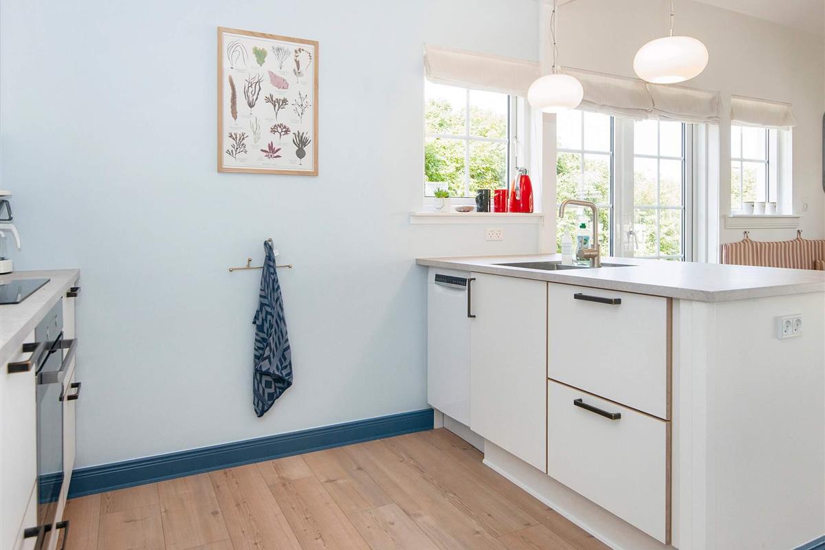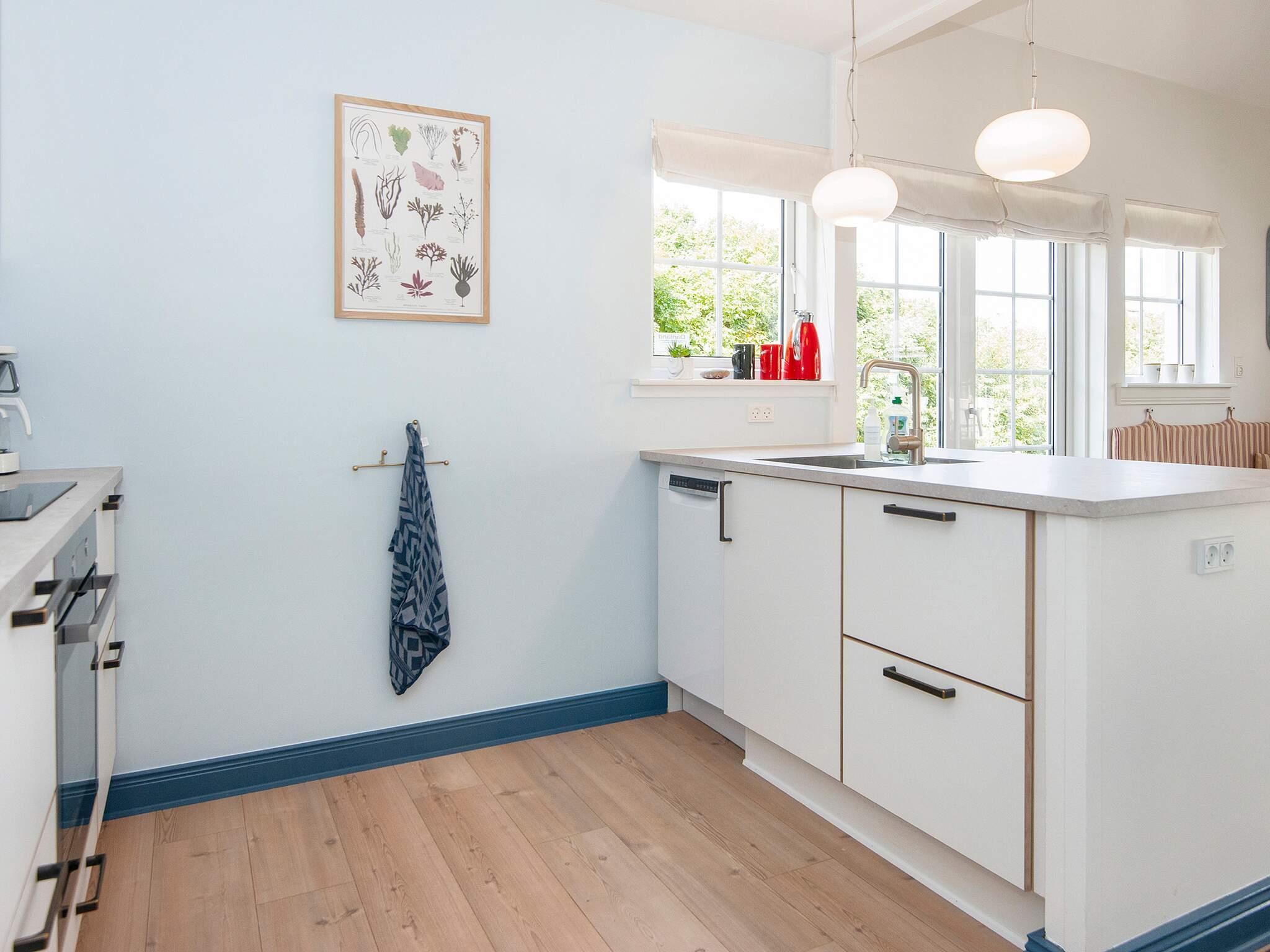 Jeder Dünenhof besteht aus 4 Wohnungen mit eigenem Eingang. Das Erdgeschoss verfügt über eine offene Küche, einen Essbereich und ein Wohnzimmer. Die Küche ist mit einem Heißluftofen und einem Geschirrspüler ausgestattet.