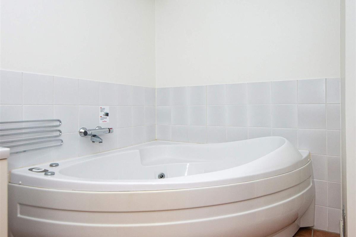 Schönes Duschbad mit Fußbodenheizung, Dusche, Whirlwanne für zwei Personen, Waschmaschine und Wäschetrockner sowie direktem Zugang zur Sauna. Separates WC mit Waschbecken.