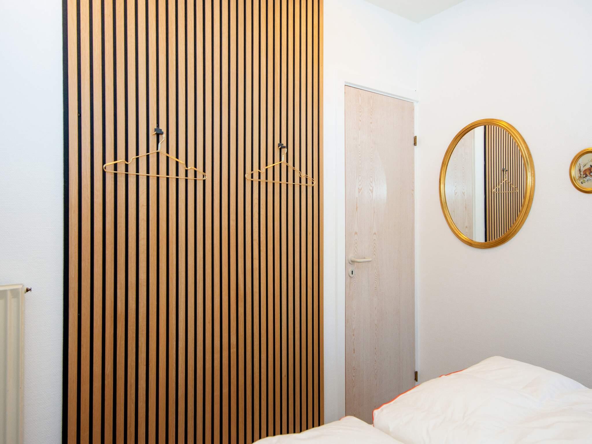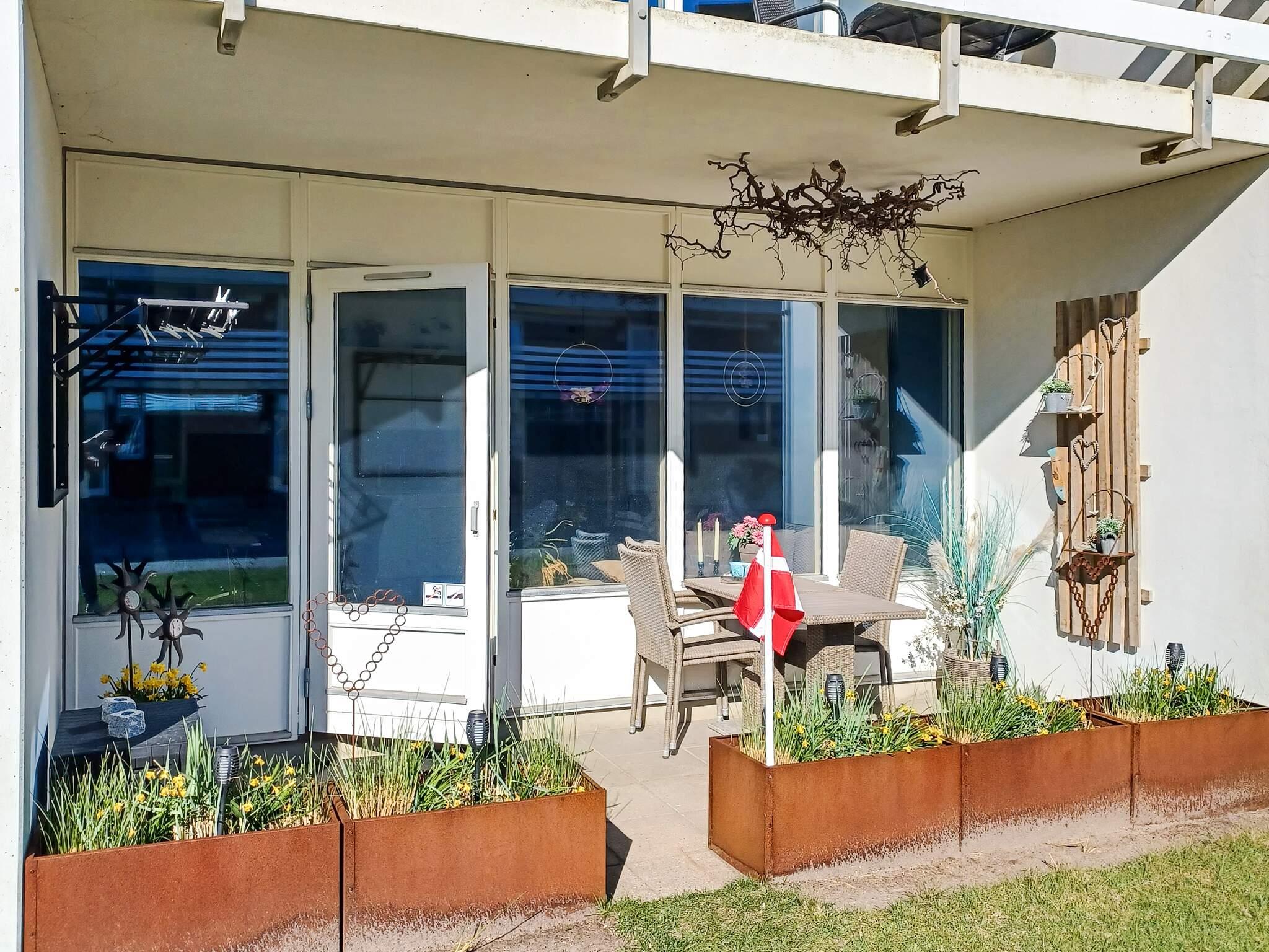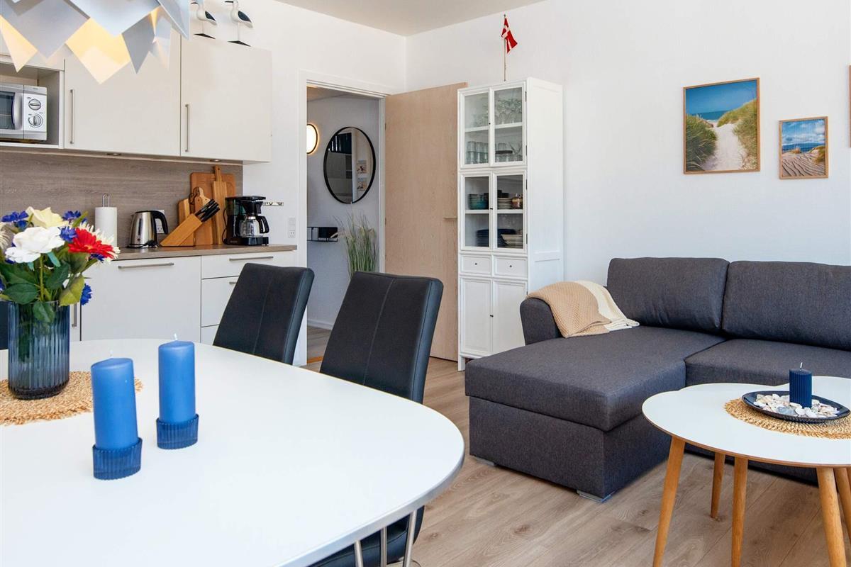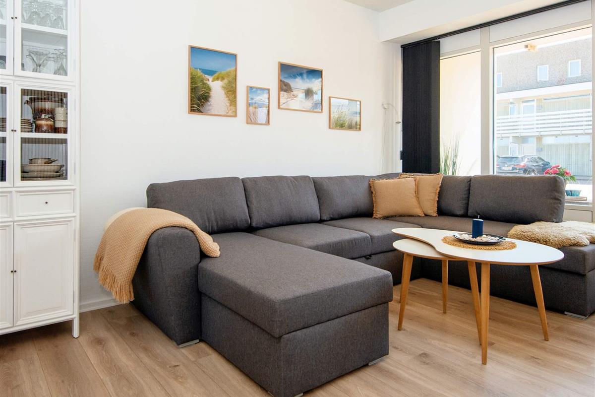 Die Wohnung im Erdgeschoss verfügt über einen offenen Küchen- und Wohnbereich mit großen Fenstern und einer Gartentür, die auf eine kleine überdachte Terrasse führt. Von hier aus können Sie das beruhigende Rauschen der Nordsee genießen und im Freien entspannen. Der Wohnbereich bietet ein Schlafsofa für zwei weitere Gäste. Das Schlafzimmer verfügt über ein Doppelbett und ein Etagenbett mit zwei 160 cm langen Betten, geeignet für zwei Kinder.