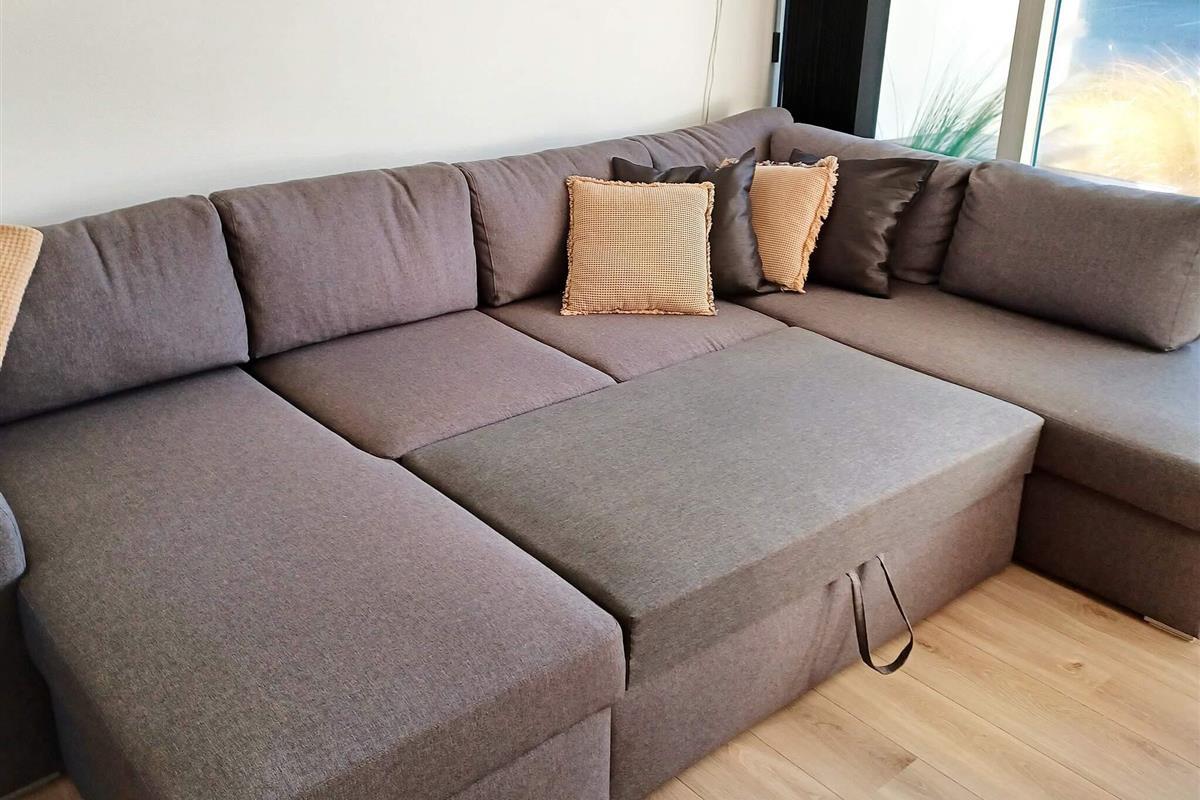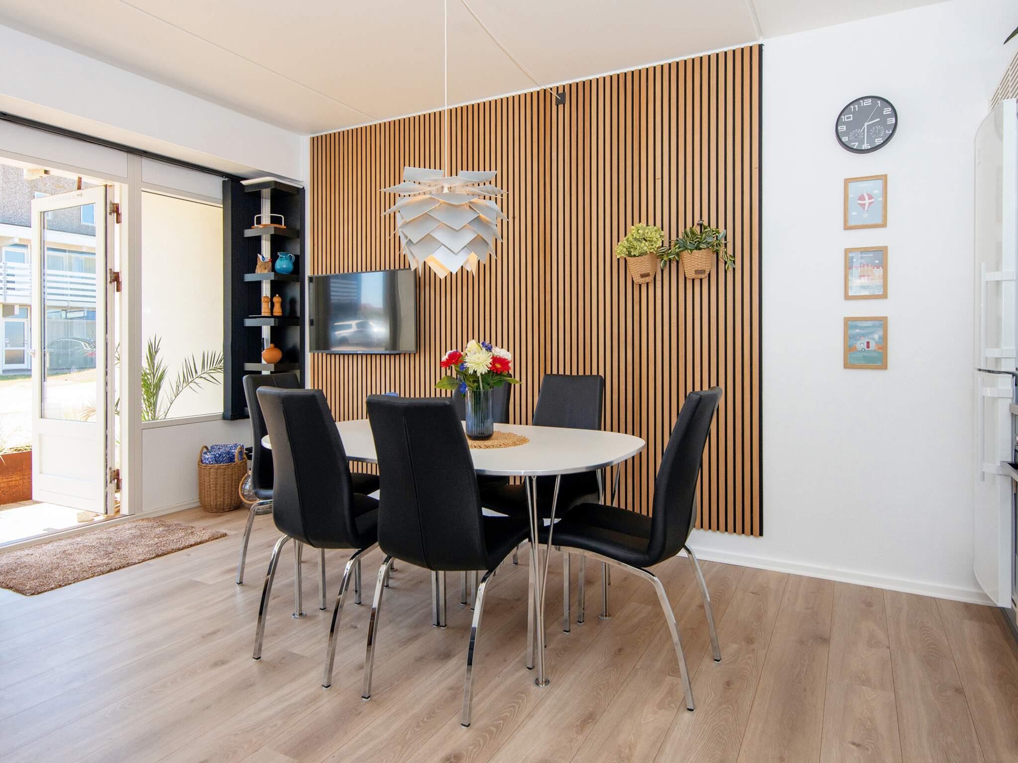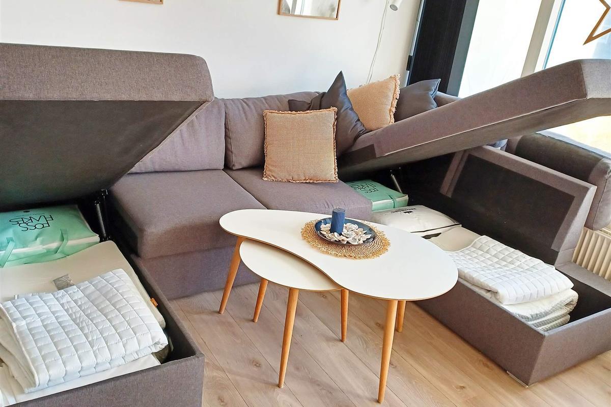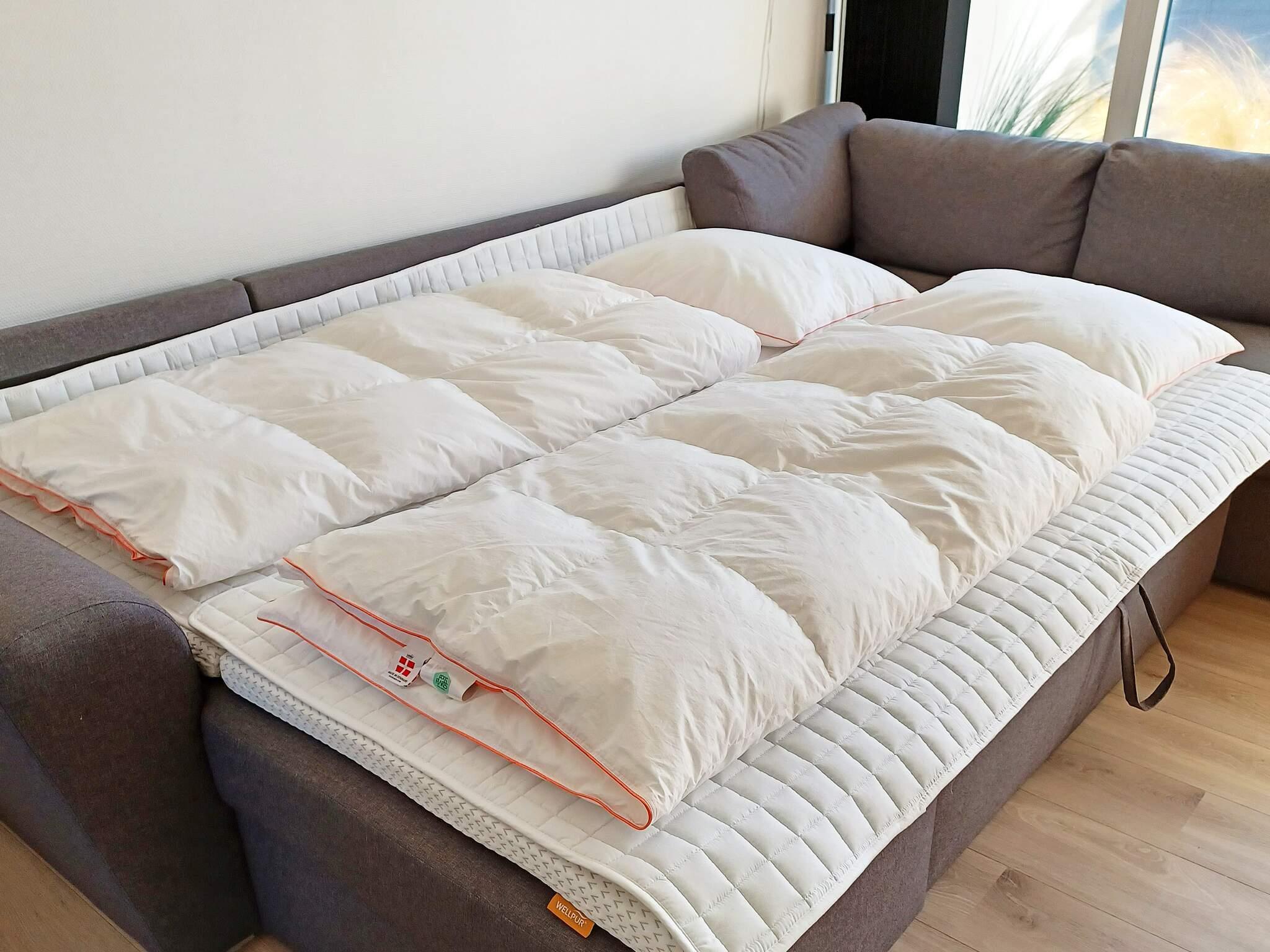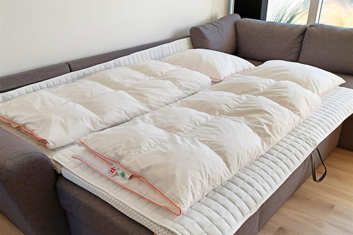 Die Wohnung im Erdgeschoss verfügt über einen offenen Küchen- und Wohnbereich mit großen Fenstern und einer Gartentür, die auf eine kleine überdachte Terrasse führt. Von hier aus können Sie das beruhigende Rauschen der Nordsee genießen und im Freien entspannen. Der Wohnbereich bietet ein Schlafsofa für zwei weitere Gäste. Das Schlafzimmer verfügt über ein Doppelbett und ein Etagenbett mit zwei 160 cm langen Betten, geeignet für zwei Kinder.