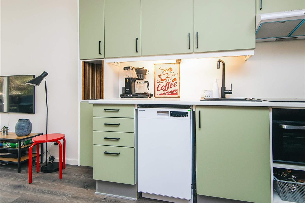 Küche: E-Kochpl., Ofen, Kühl-Gefrier-Kombi, Kaffeem., Spülm.