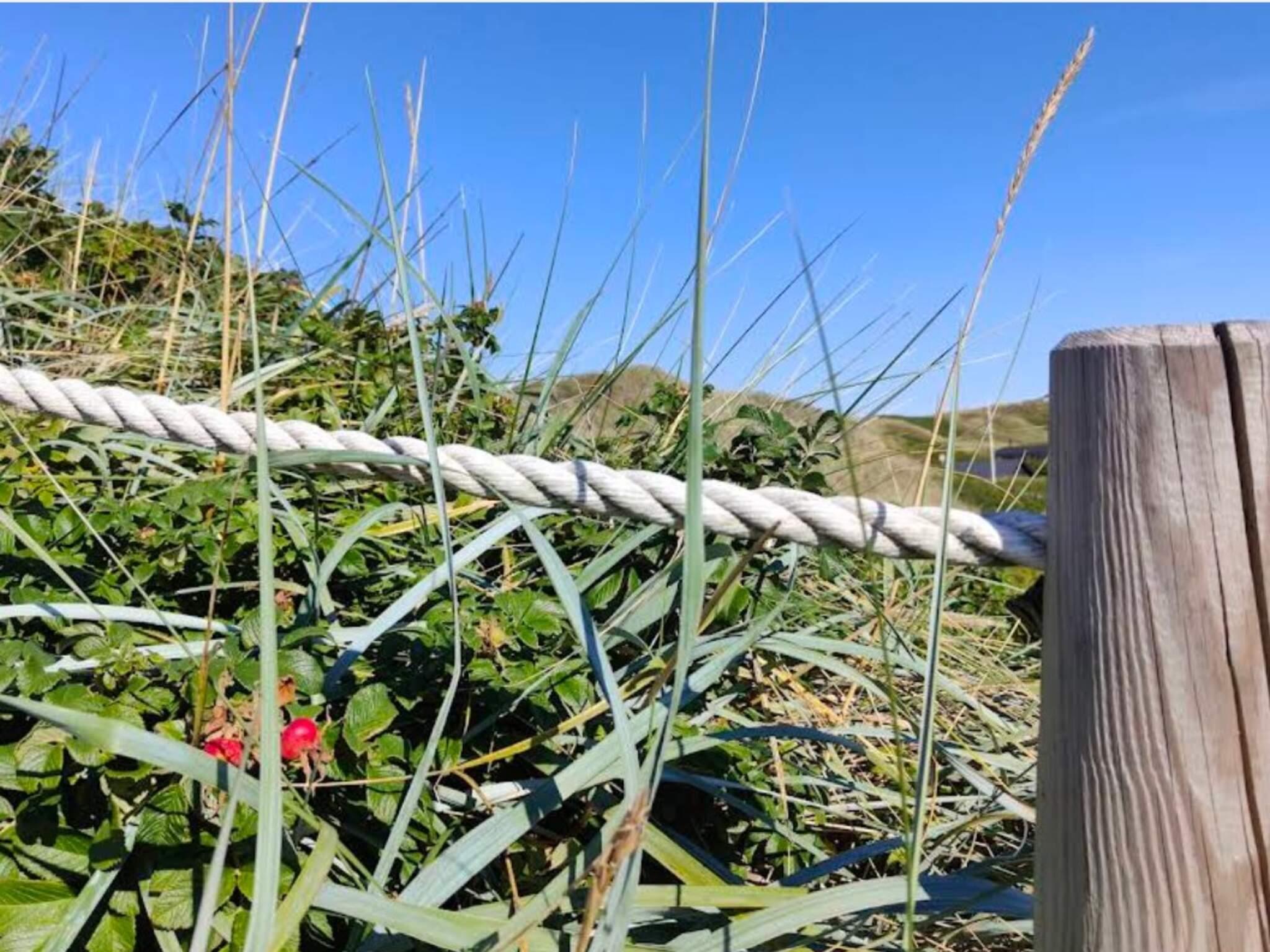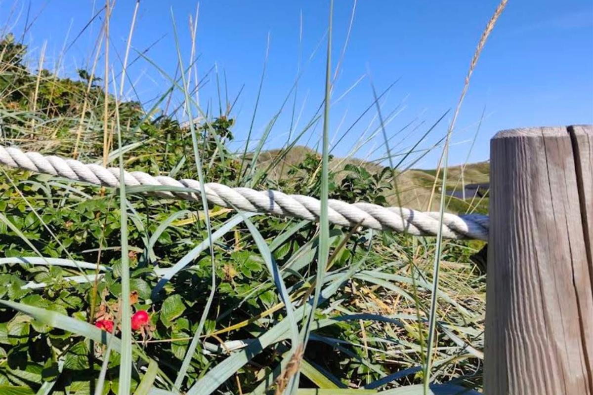 Vom Wohnzimmer aus haben Sie durch Fenster und Terrassentür Zugang zu einem großen, überdachten Südbalkon, sodass Sie sich auch draußen bewegen und die frische Luft, die schöne Landschaft und das Rauschen der Nordsee genießen können. Hier sind Sie ungestört und haben den Blick auf große Rosenbüsche, die vor dem Wind schützen. Auf dem Balkon können Sie Ihren Urlaub im Freien zum Rauschen der Nordsee genießen.